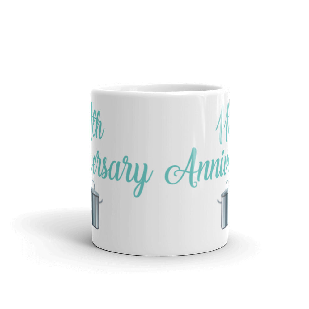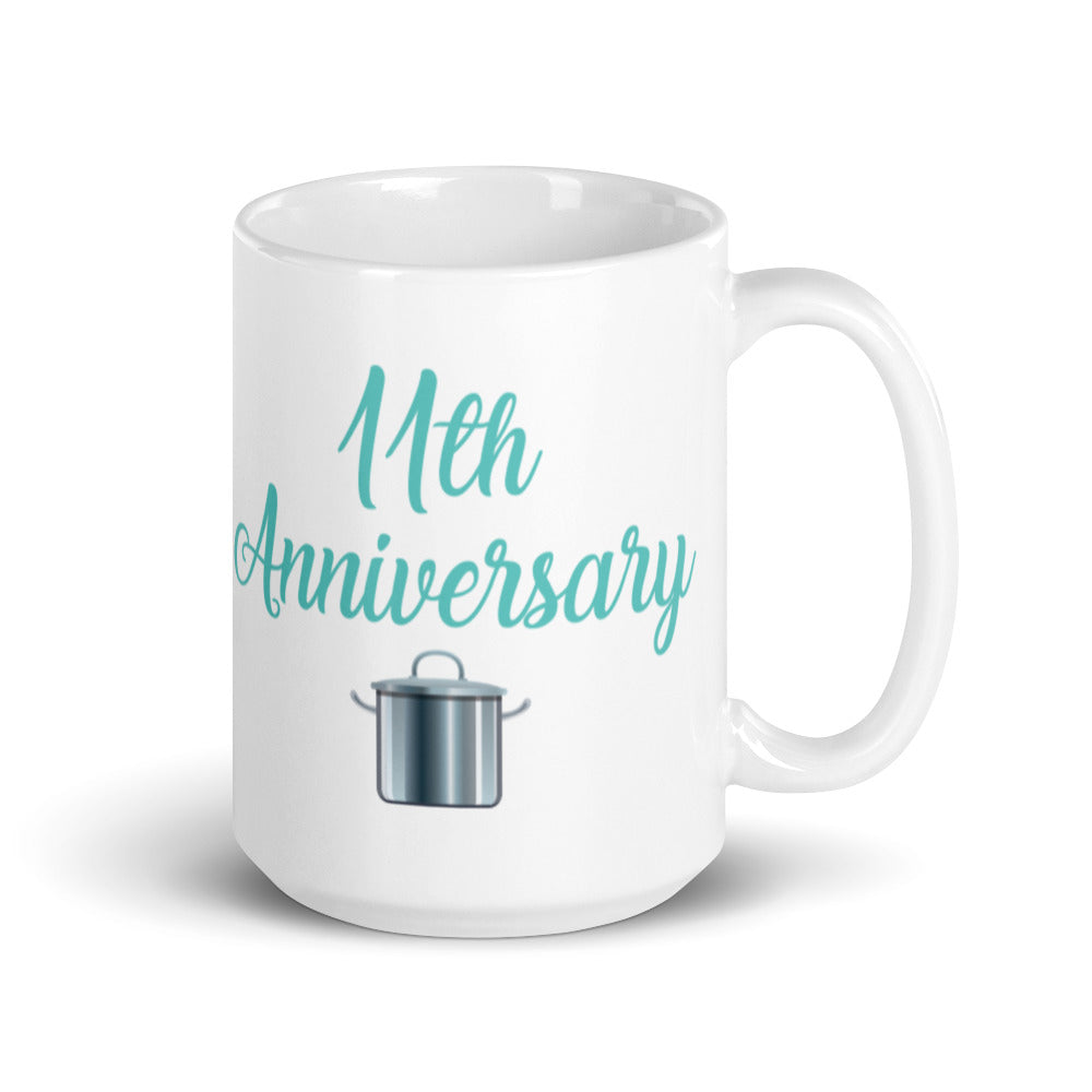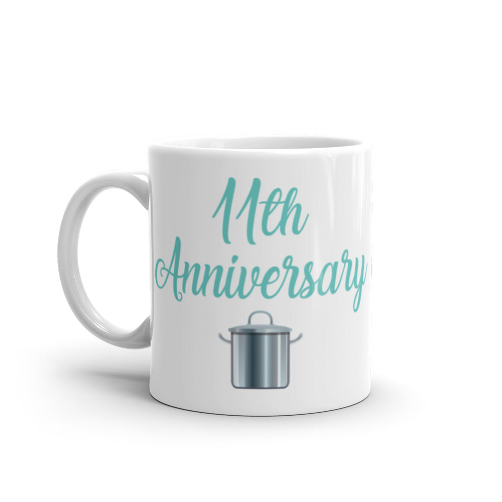- Design: Features a “11th Anniversary” text in cursive script and a metallic silver cooking pot graphic
