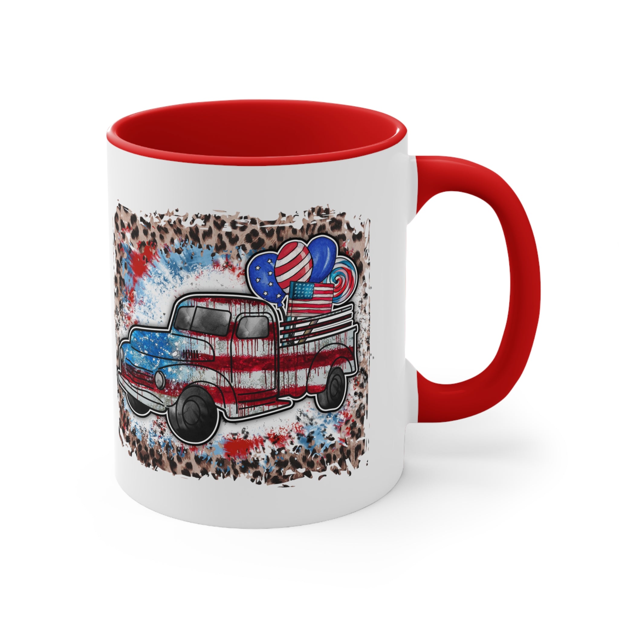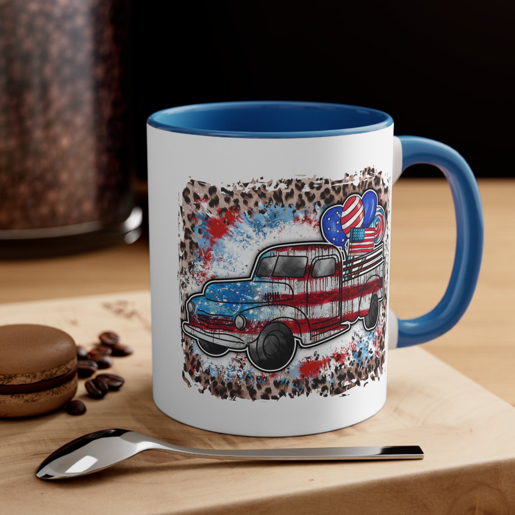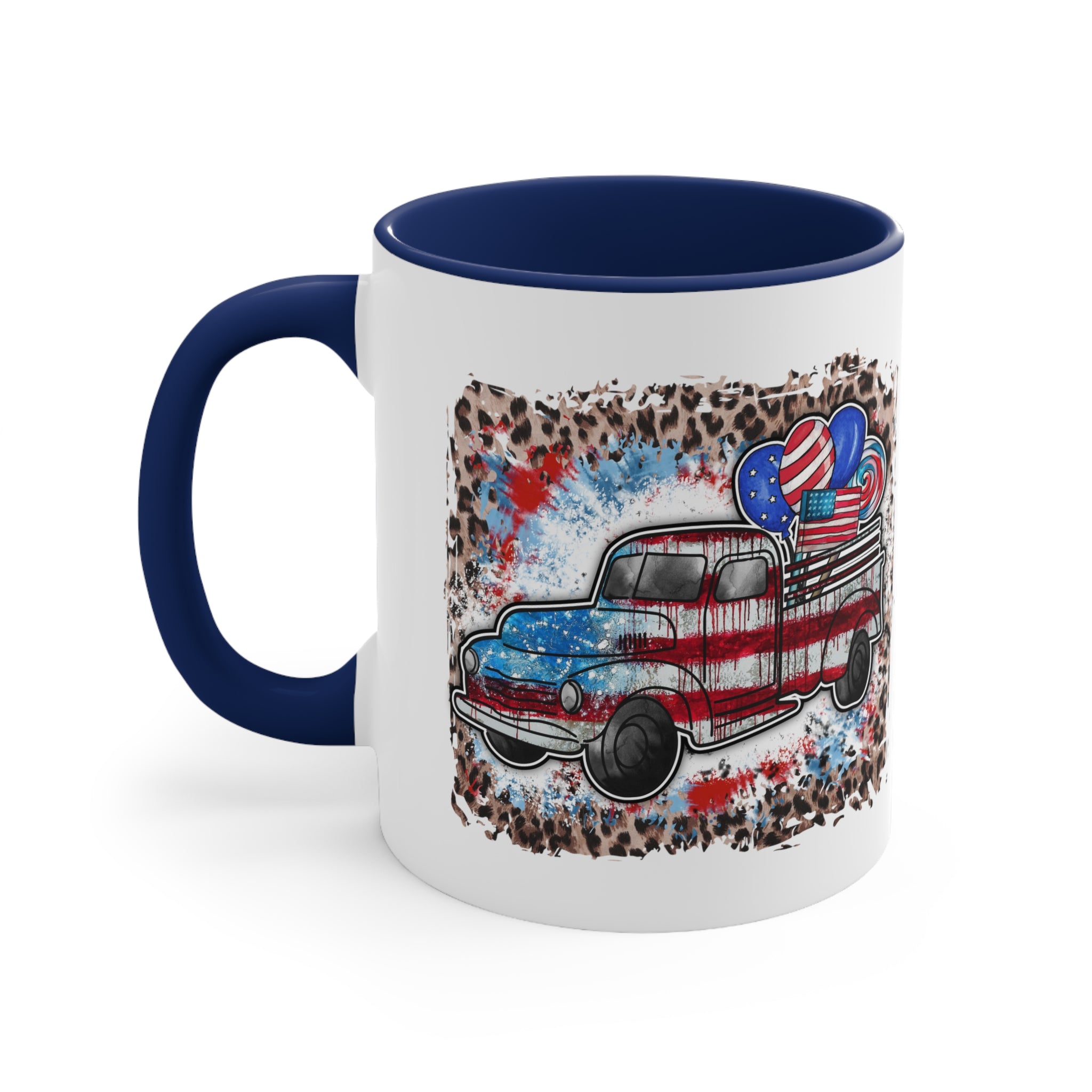 The exterior of the mug is a sight to behold. It features a white ceramic base adorned with a vibrant, detailed graphic. The graphic showcases a vintage pickup truck styled with red, white, and blue stripes, reminiscent of the American flag. Alongside the truck, there are American flag – themed balloons, a red/white/blue lollipop, and a smaller American flag. The background is a leopard print (brown with black spots) incorporating red, blue, and white splatter paint, creating a trendy and patriotic “edgy” aesthetic. The graphic also includes a “dripped” paint effect on the truck, adding a distressed, artistic look.