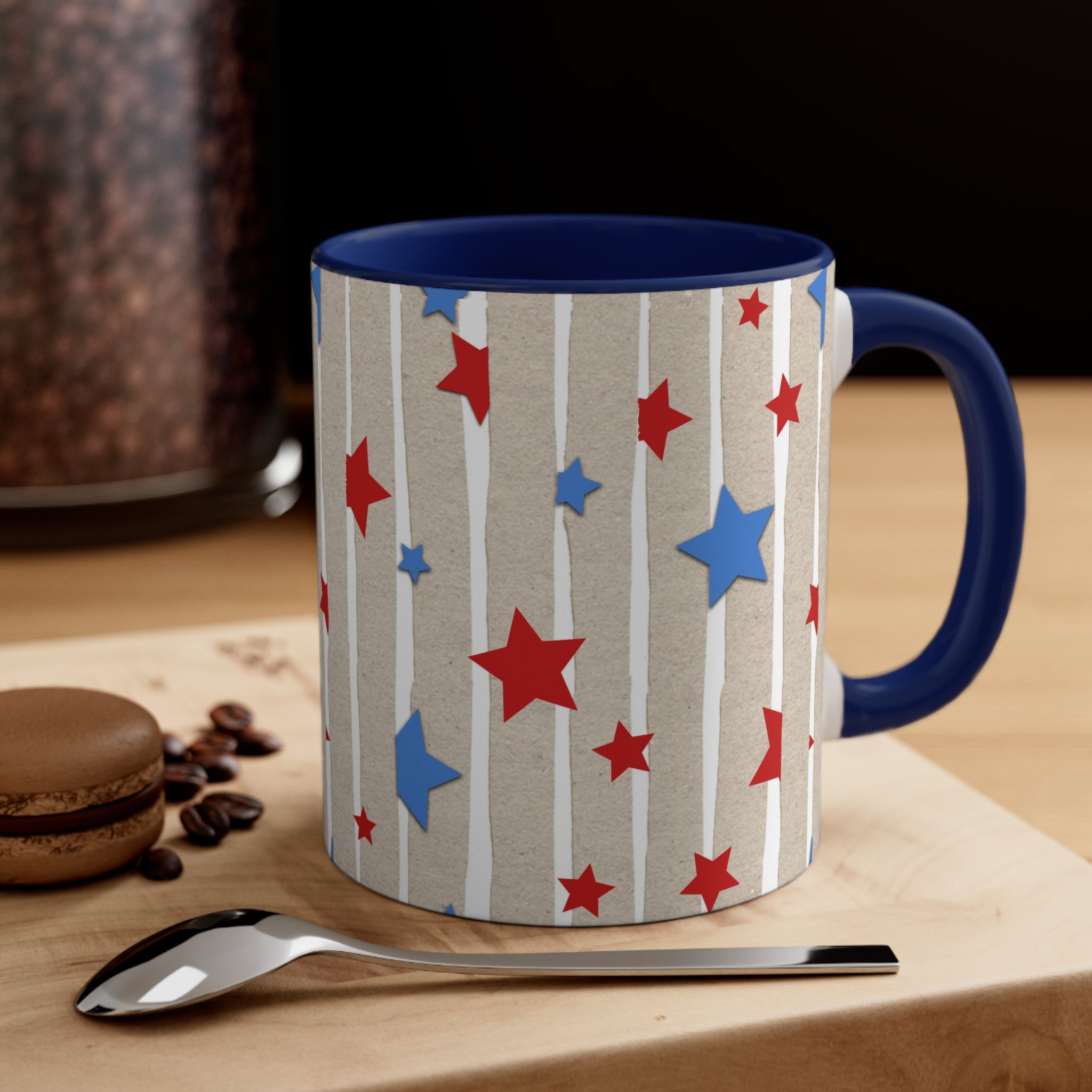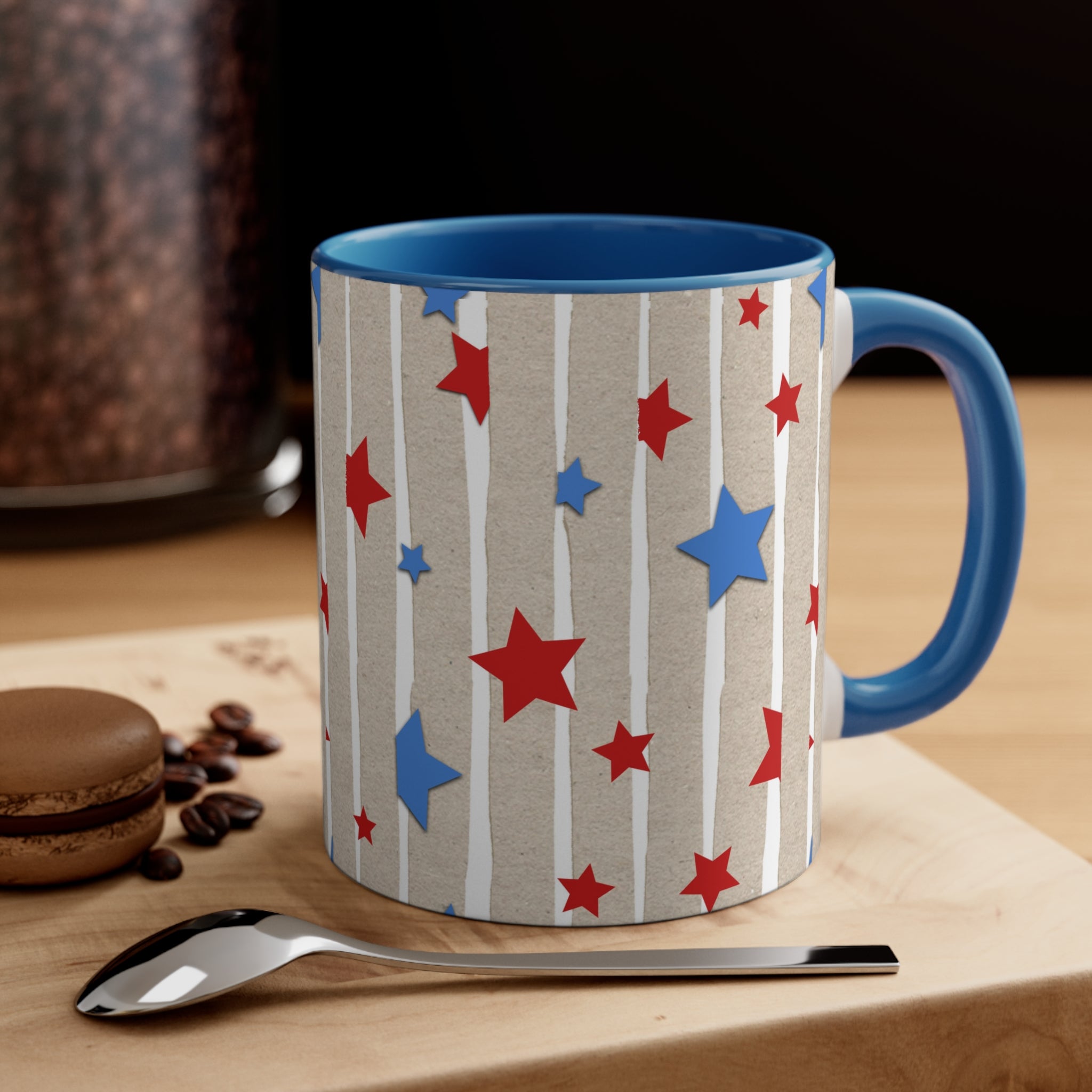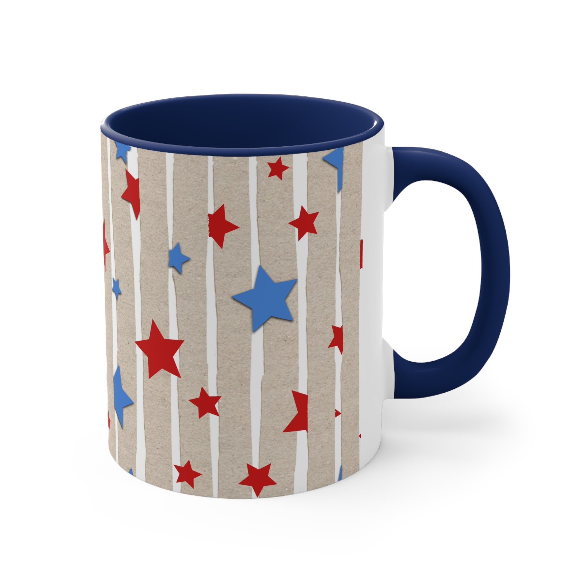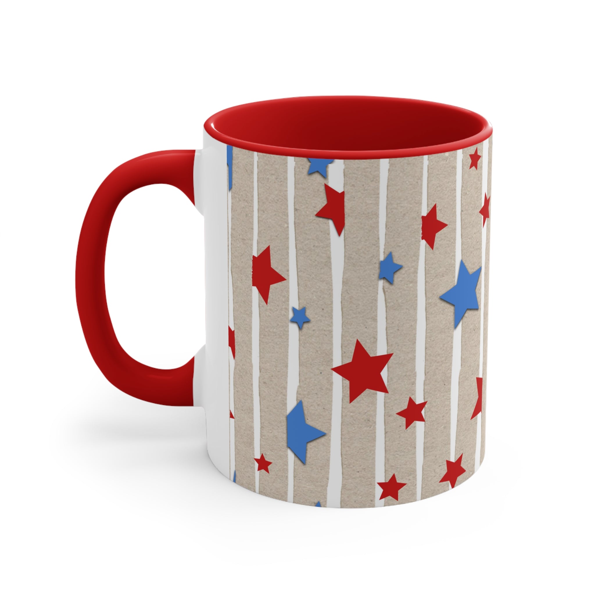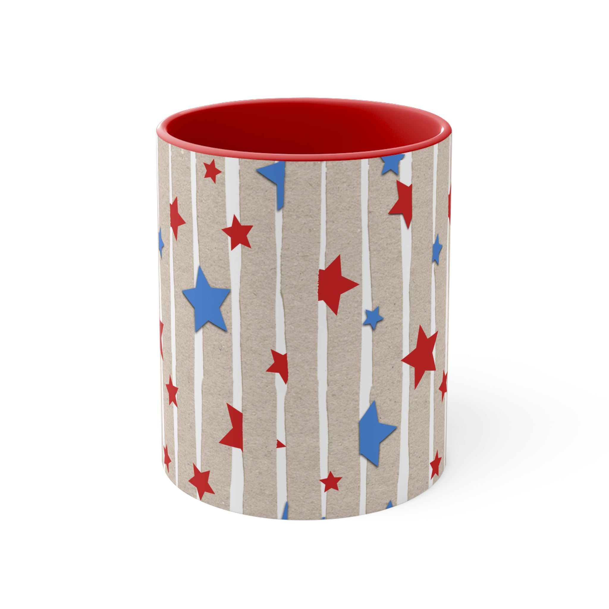 The mug features a light brown base, reminiscent of kraft paper texture, adorned with white vertical stripes, some with a rough, “torn paper” effect. Scattered across the base are red and blue stars of varying sizes (small, medium, large), creating a bold and patriotic design inspired by the US flag. The interior rim and handle are a single solid color, either red or blue, offering multiple customizable options. The handle’s color matches the interior rim for a cohesive look, and there is a white “strip” on the side where the handle attaches.