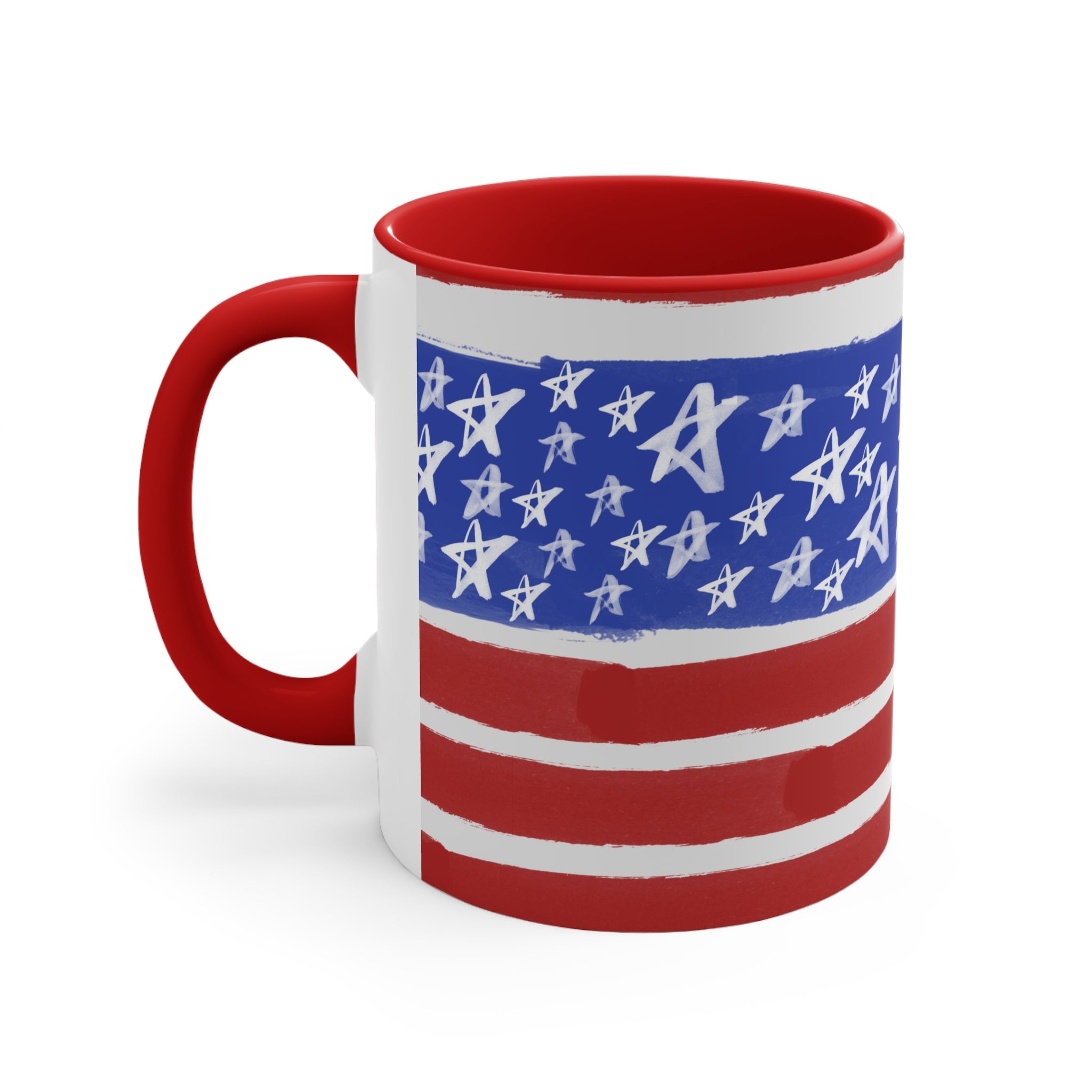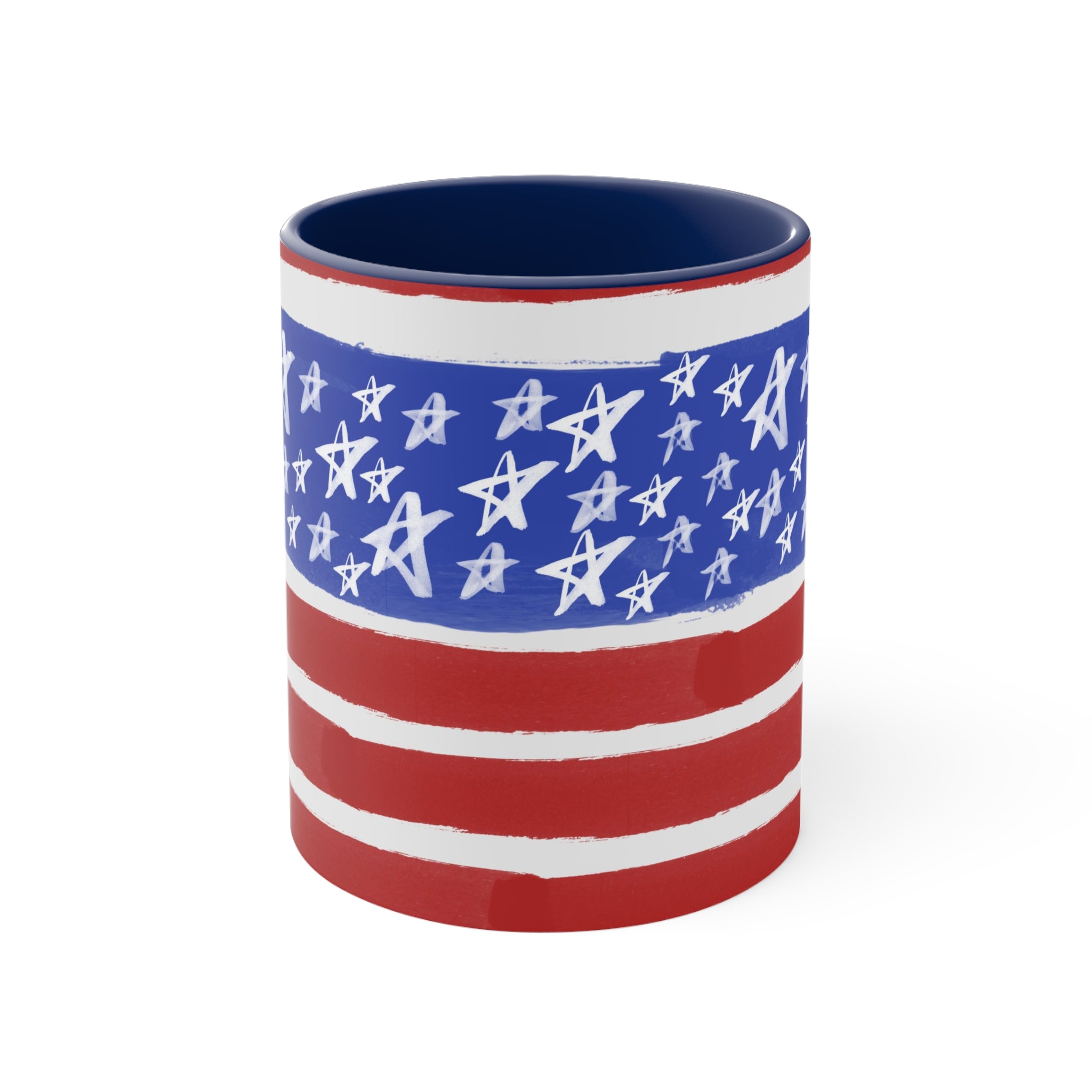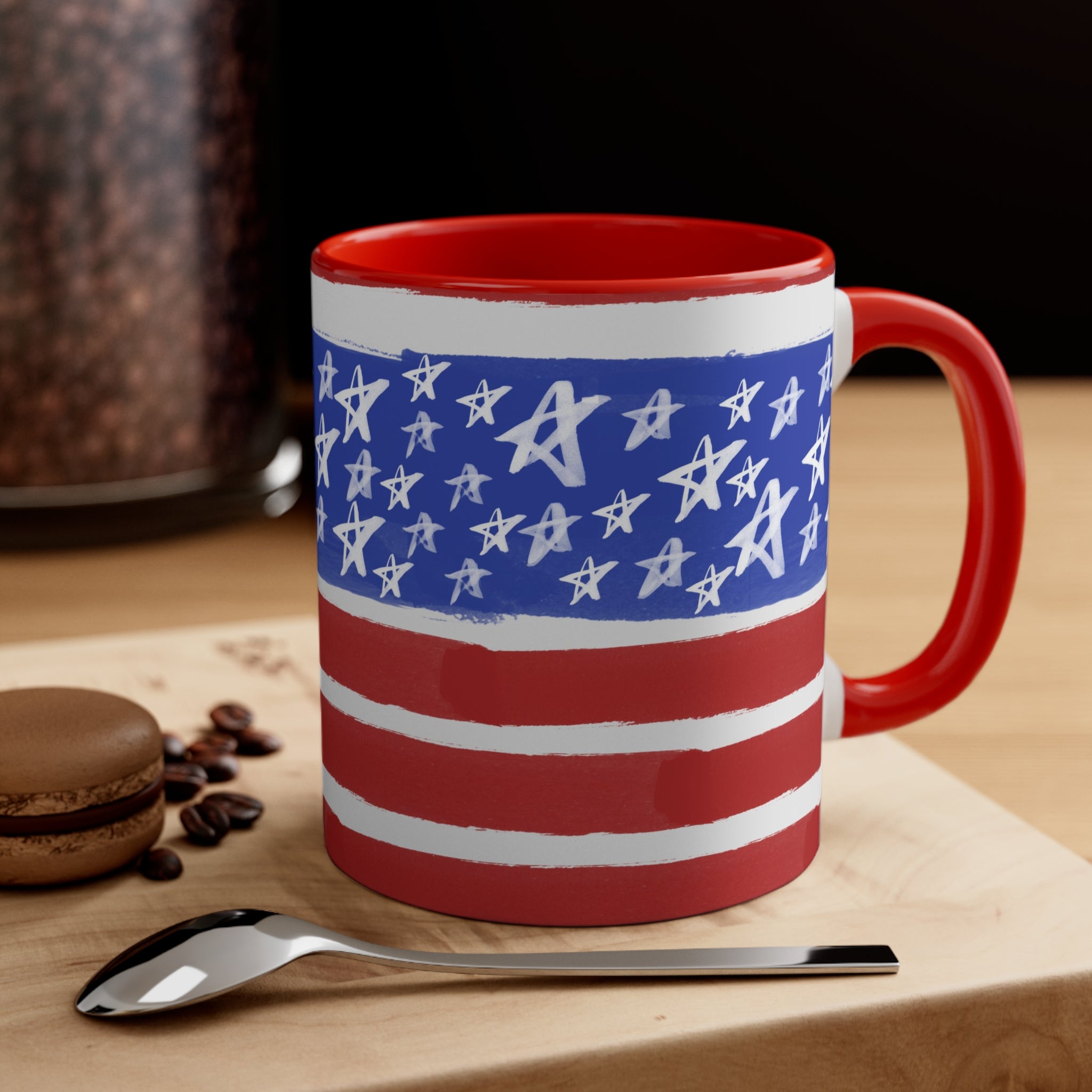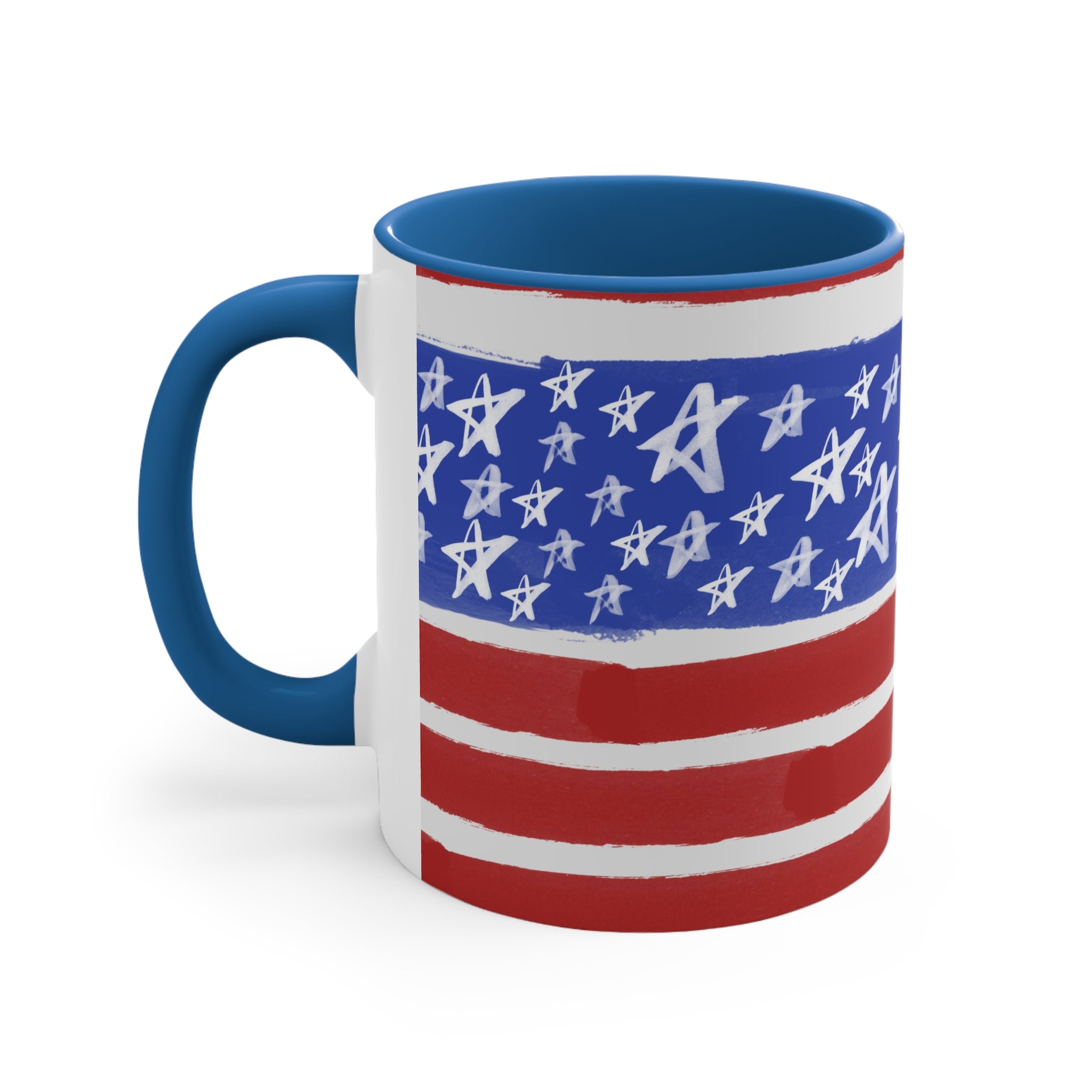 Indulge in your daily hot beverages with a patriotic touch using our American Flag Themed Accent Coffee Mug! This 11oz ceramic mug is a perfect blend of functionality and artistic charm, designed to make your coffee breaks more special.