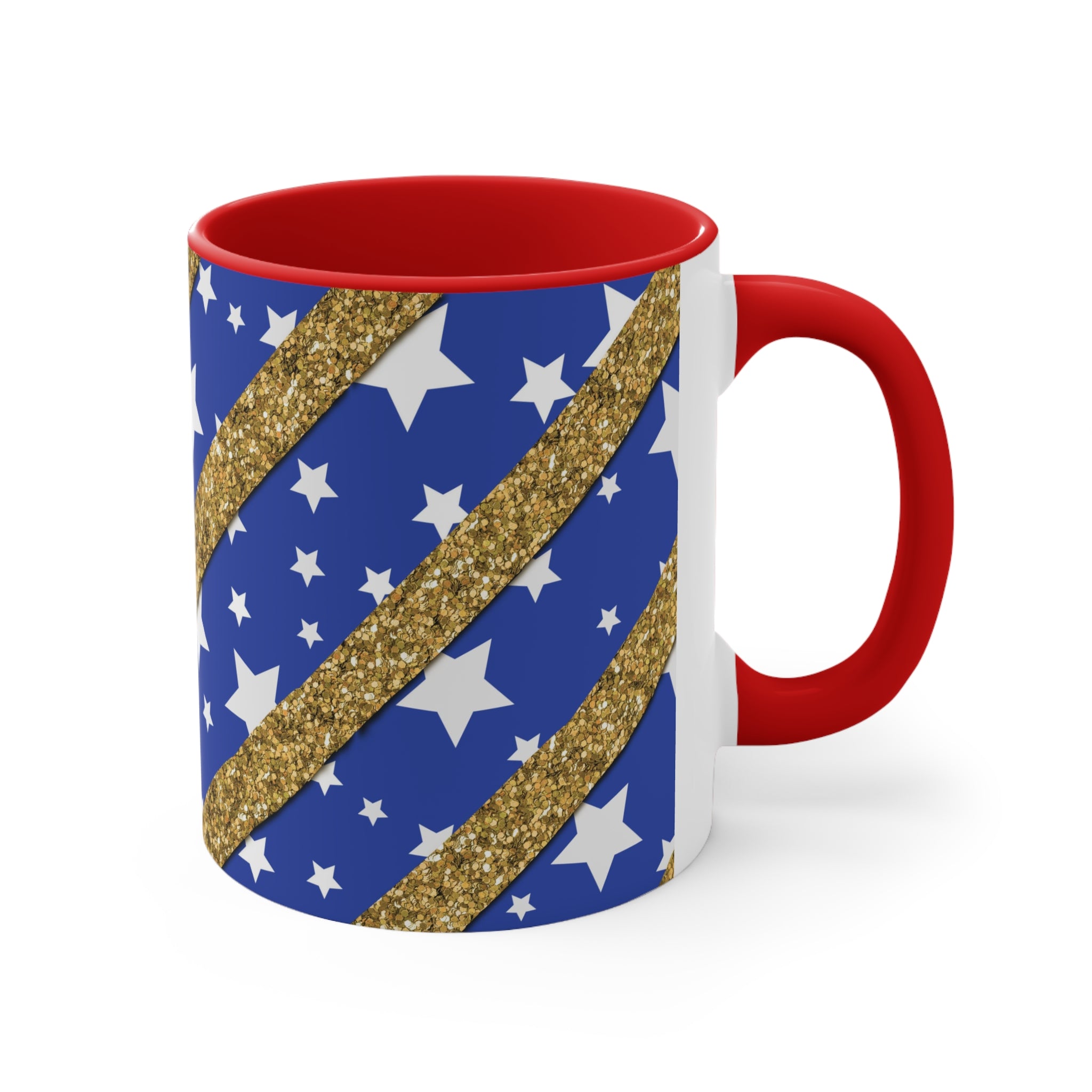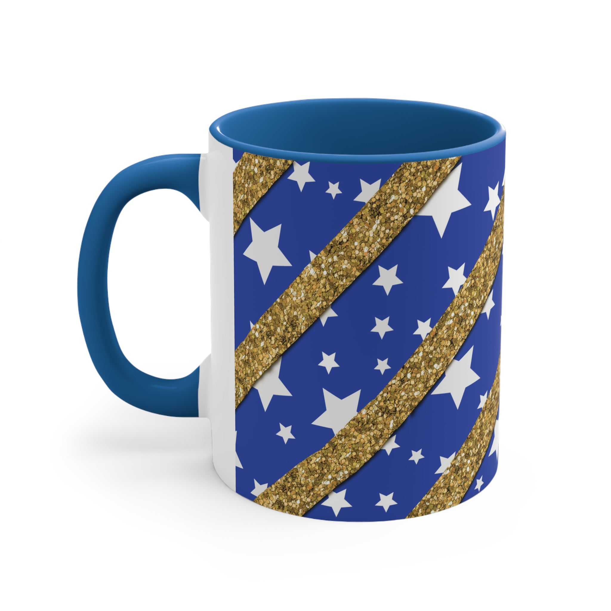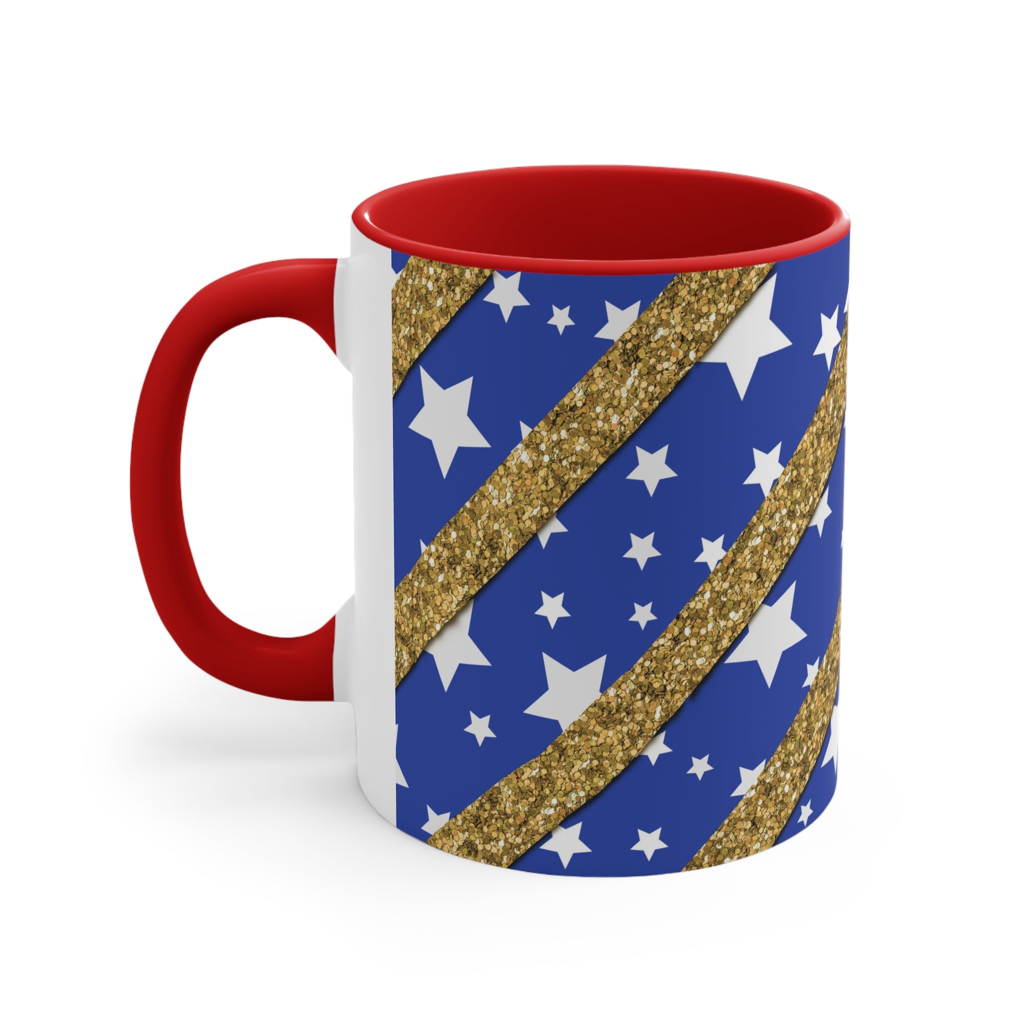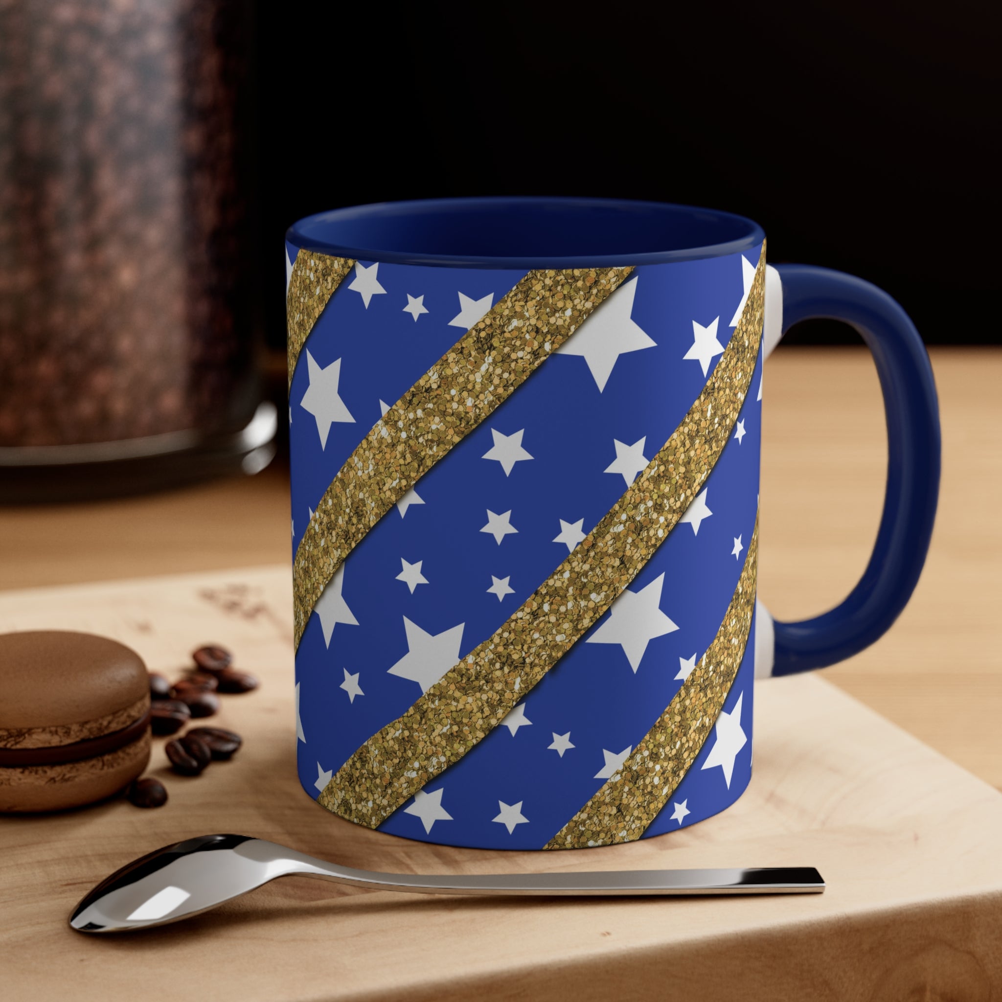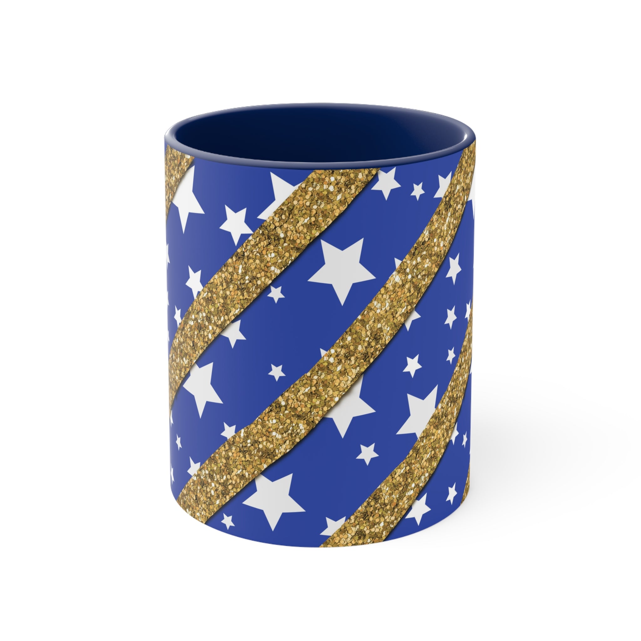 The mug is crafted from high – quality ceramic with a glazed finish, offering a smooth and durable surface. The exterior features a dominant blue (navy) background, adorned with a repeating pattern of white stars in various sizes, from small to large. Diagonal gold stripes with a glittery texture add a touch of sparkle and a festive, patriotic feel.
