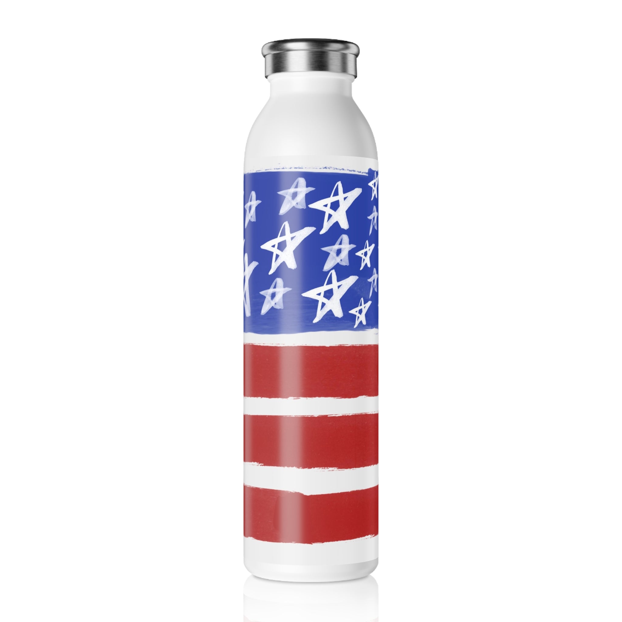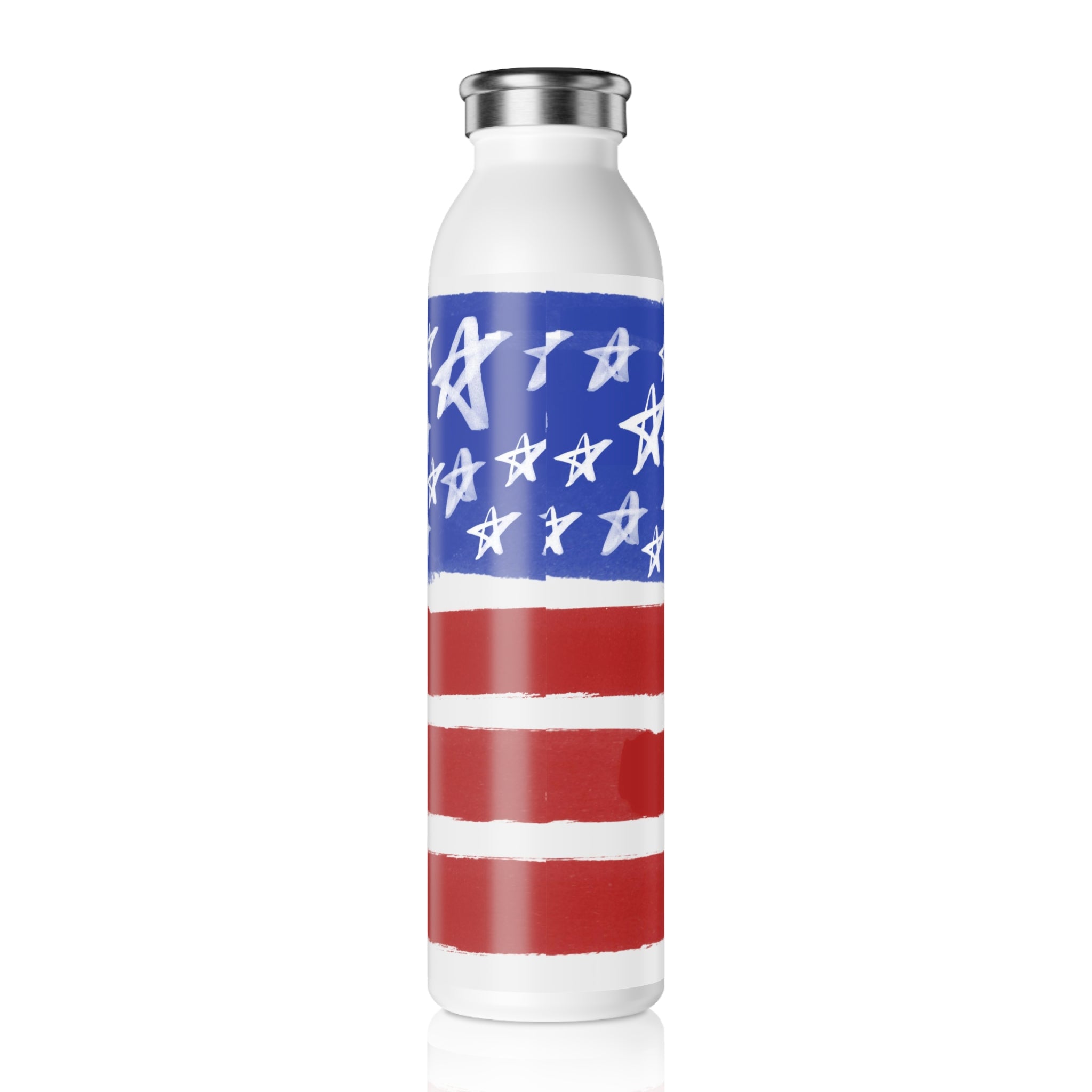 The bottle features a unique and artistic American flag design. The primary colors of red, white, and blue are prominently displayed, with a blue section as the background adorned with white stars of varying sizes. The stars have an irregular placement, giving a hand – drawn, artistic “painted” effect. The red and white stripes, three red ones separated by white, have brushstroke – like, uneven edges, enhancing the casual and whimsical aesthetic. The base color of the bottle’s unprinted areas is white, creating a beautiful contrast with the flag design.