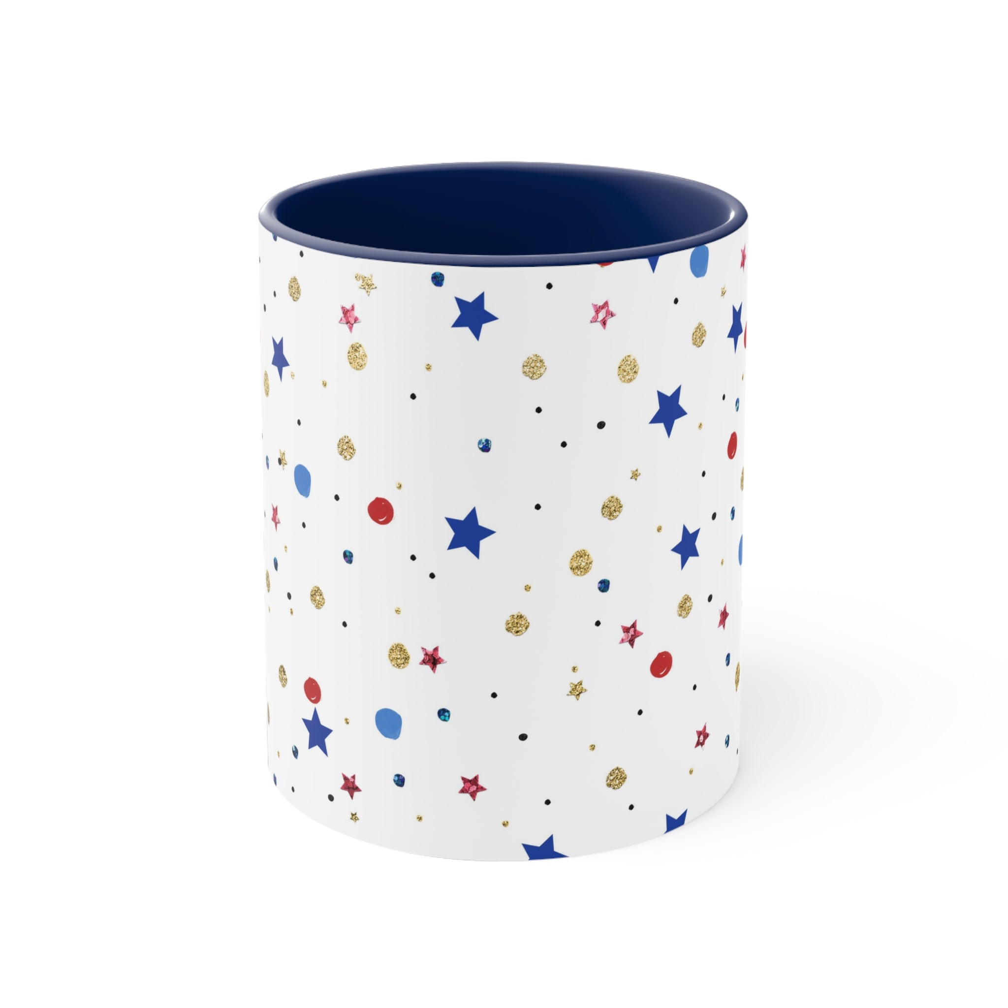 The mug features a white exterior adorned with a captivating repeating pattern. The pattern consists of large bold blue stars, delicate red/pink stars, glittery gold circular shapes, solid glossy red circles, solid matte blue circles, and tiny black dots, creating a festive and patriotic look, especially suitable for 4th of July celebrations.