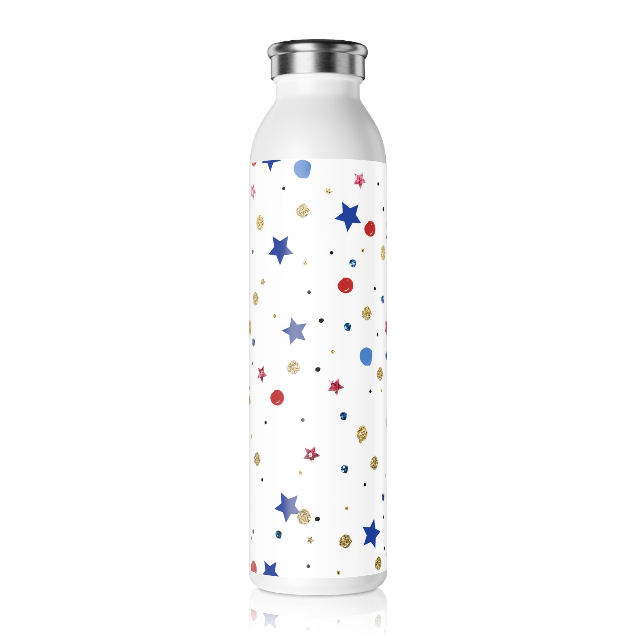 The bottle showcases a playful, celebratory confetti – inspired pattern. Against the white solid background, there are large solid blue stars with a subtle sheen, smaller red/pink stars that match the festive theme, glittery/gold circular dots with a textured, confetti – like appearance, small blue circular dots resembling gemstones or confetti, and tiny black dots to fill the negative space. The pattern is evenly distributed across the visible surface, achieved through full – wrap digital printing with a crisp, even application and no visible smudging, ensuring long – lasting durability.