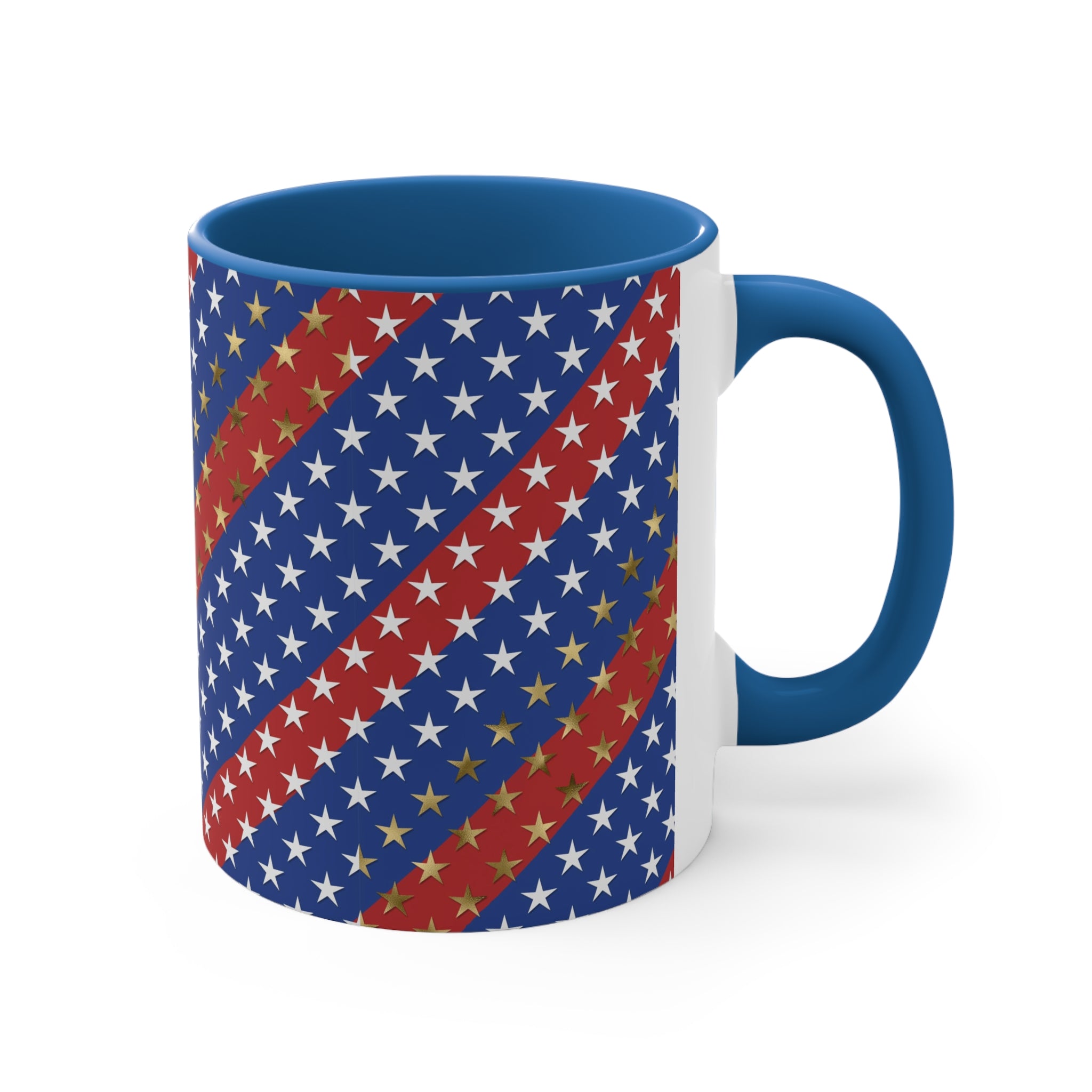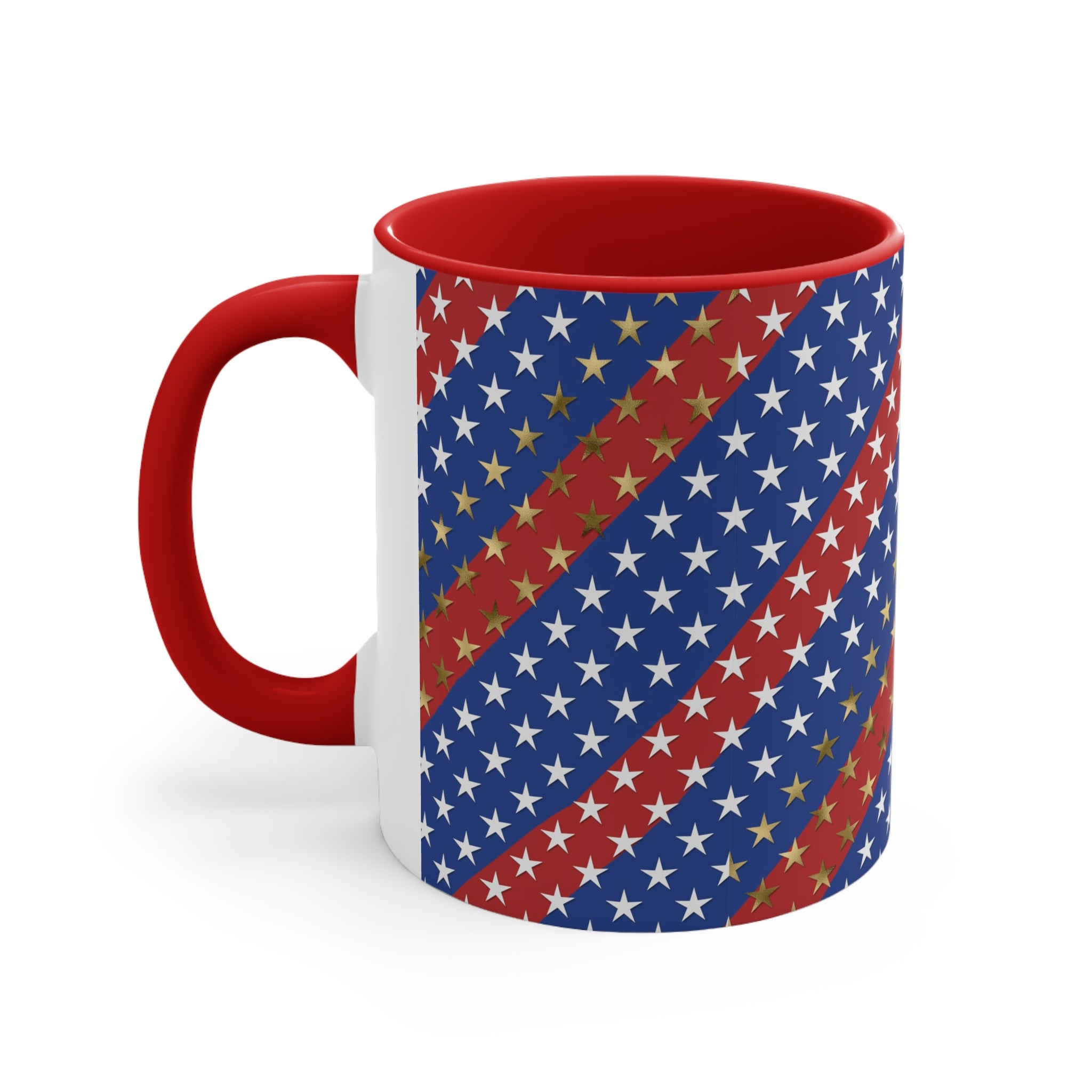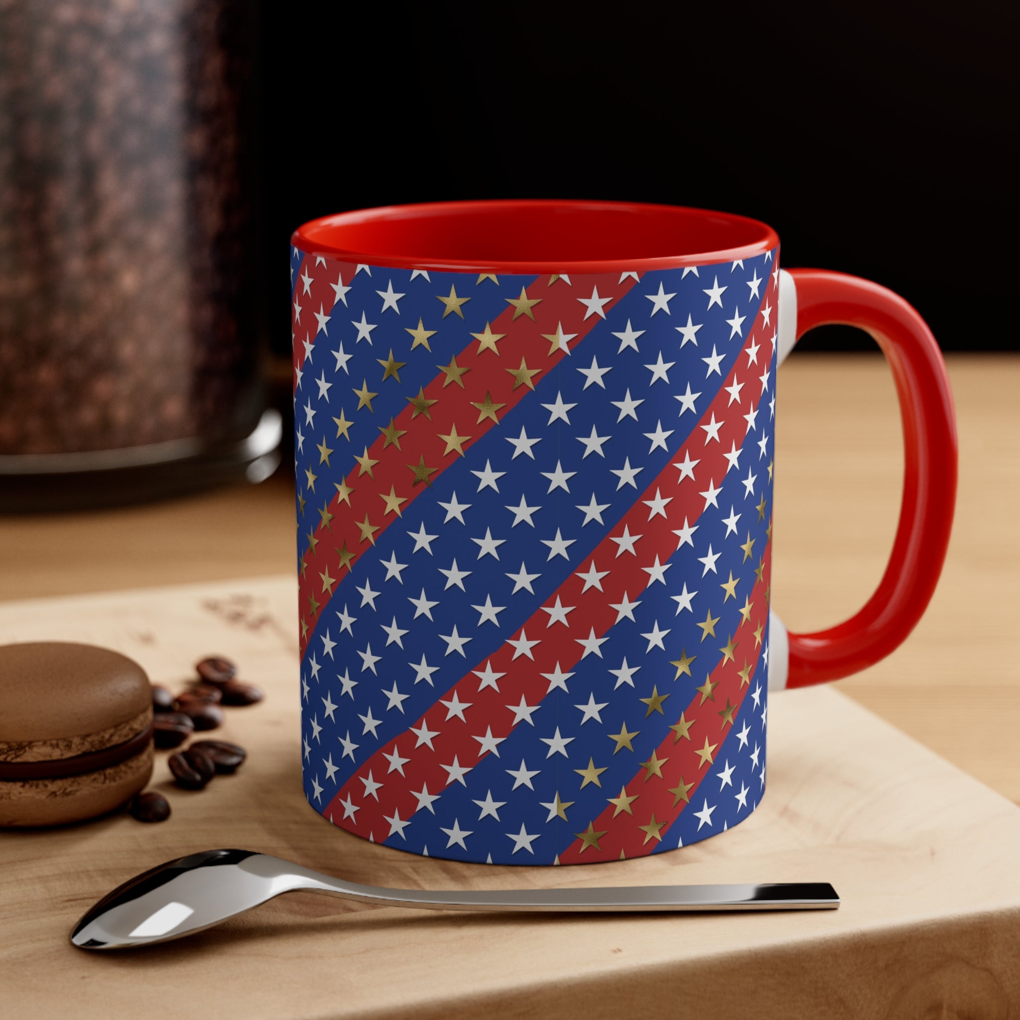 The mug features a striking diagonal stripe pattern in red and blue, with star motifs that mimic the American flag. The blue sections are adorned with white stars, while the red sections showcase gold (or golden – yellow) stars. It has a dual – tone interior/exterior and handle design, with the interior rim available in red or blue to match the exterior stripes. The handle comes in red, blue, or white, and some variants even have white handle accents on colored handles.