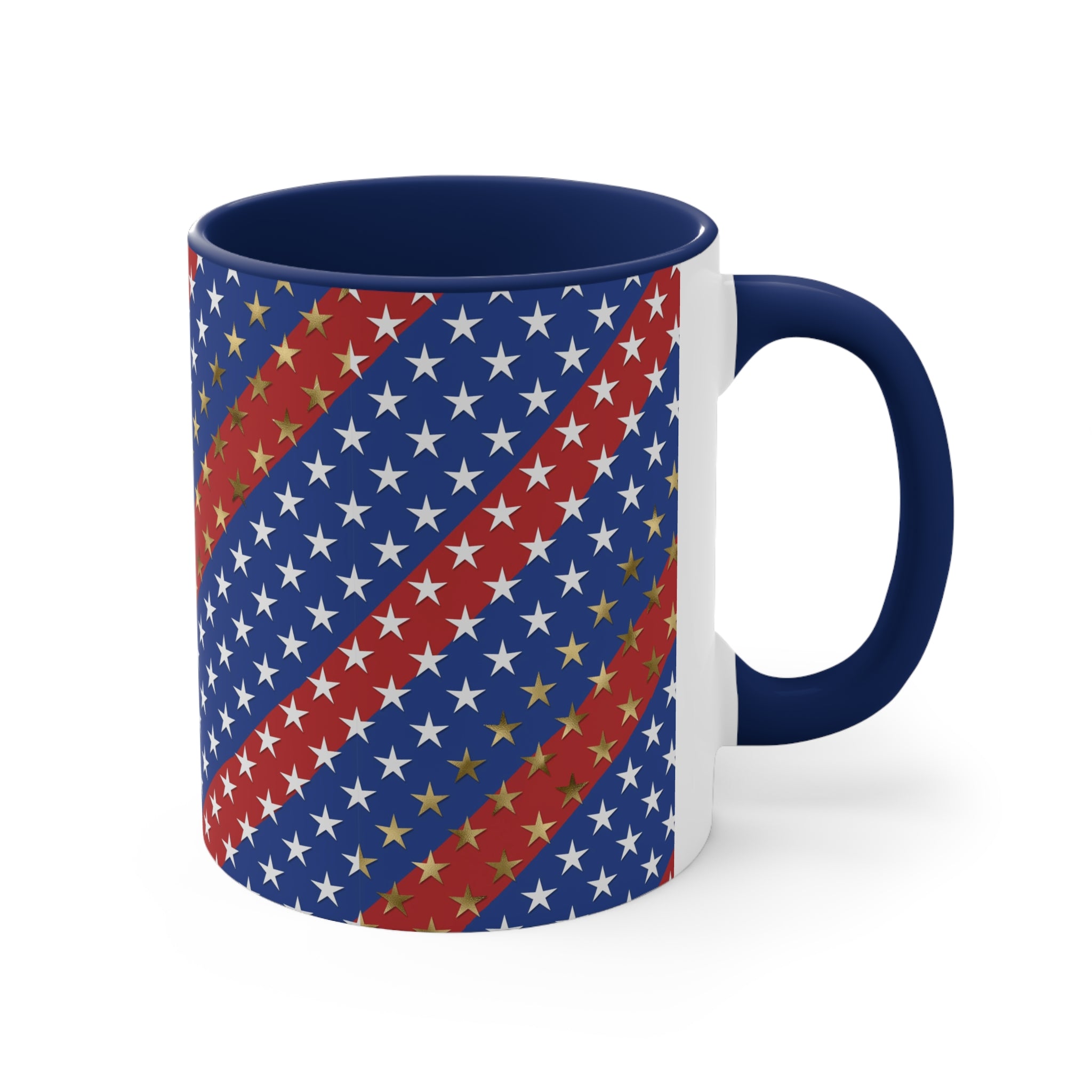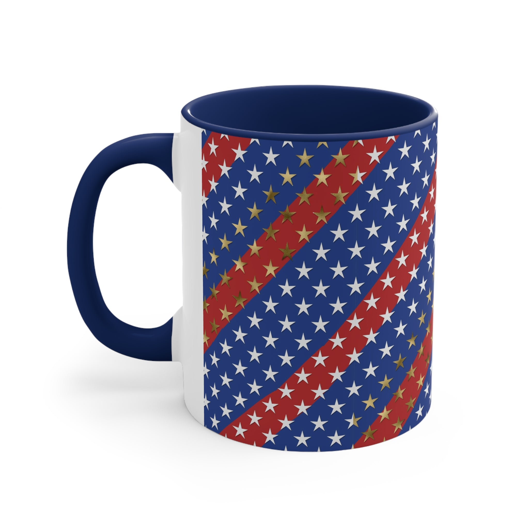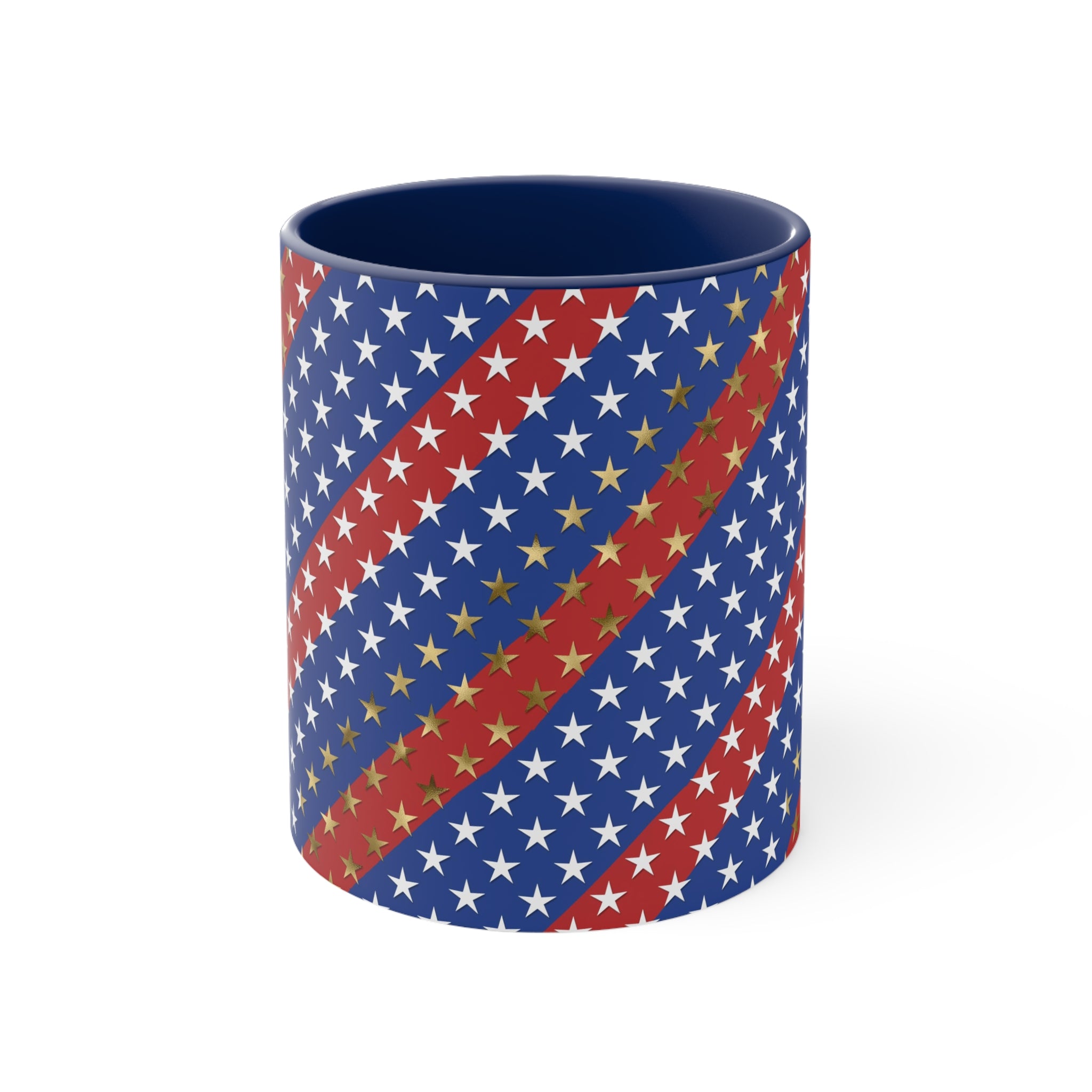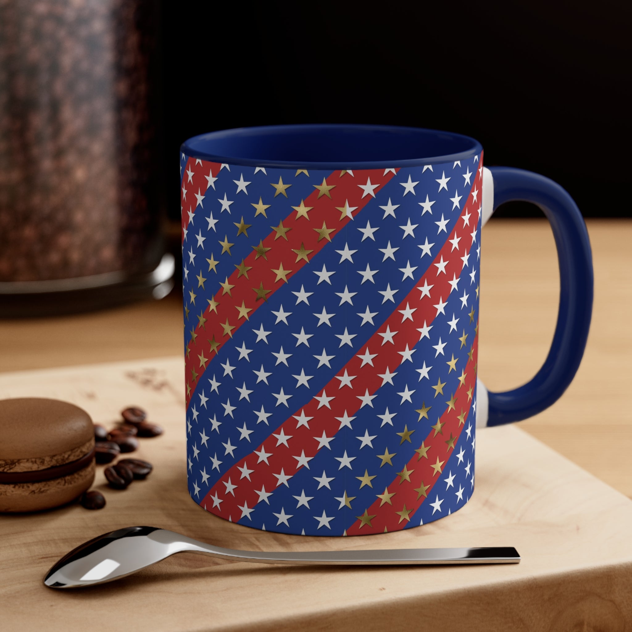 The mug features a striking diagonal stripe pattern in red and blue, with star motifs that mimic the American flag. The blue sections are adorned with white stars, while the red sections showcase gold (or golden – yellow) stars. It has a dual – tone interior/exterior and handle design, with the interior rim available in red or blue to match the exterior stripes. The handle comes in red, blue, or white, and some variants even have white handle accents on colored handles.