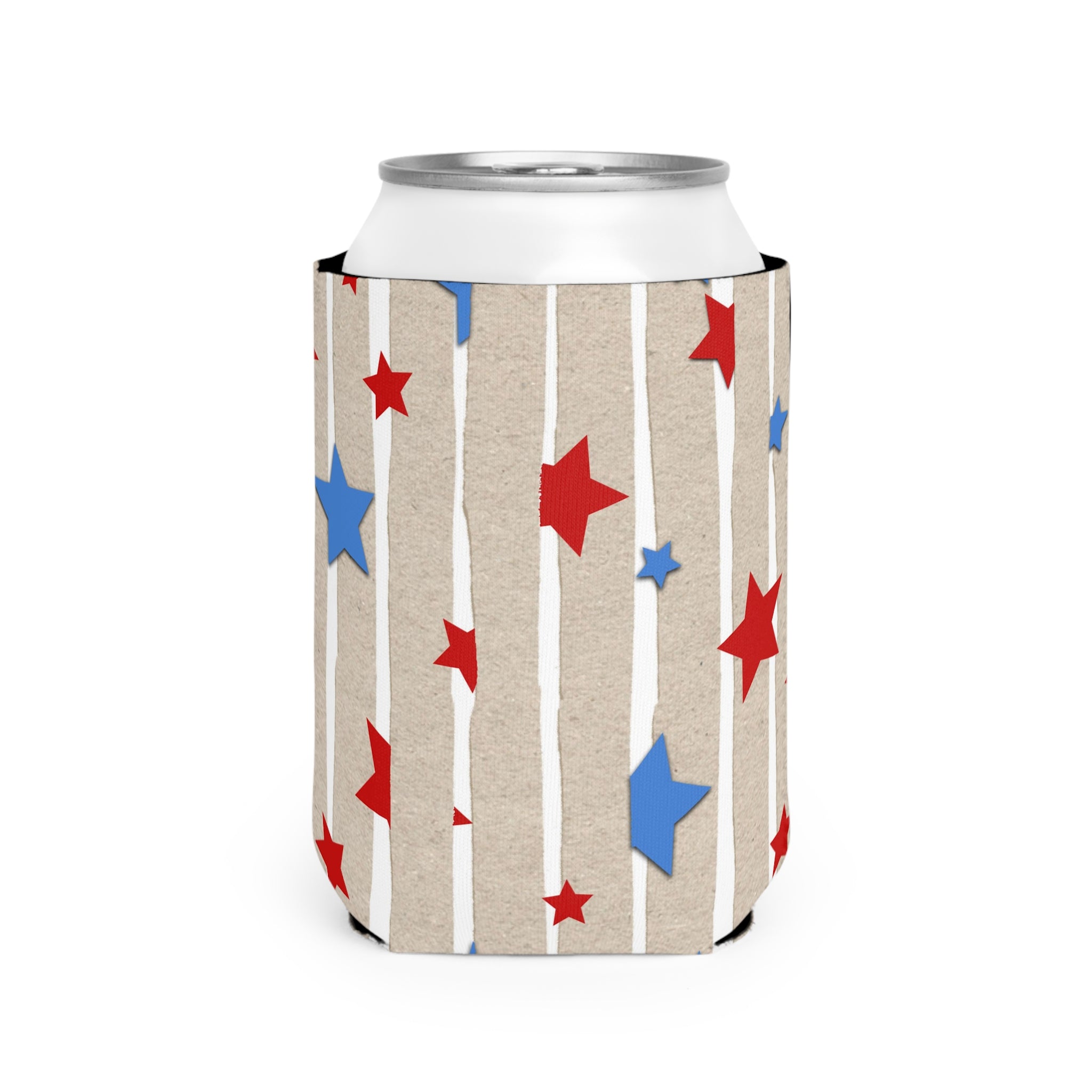 The outer surface of this cooler sleeve is crafted from a durable neoprene or synthetic fabric, which is common for koozies. It features a printed patriotic star pattern with a combination of beige as the background, white irregular vertical stripes, and red and blue stars of various sizes. The stars have a slightly raised/cut – out effect, adding visual depth to the overall design. The theme is patriotic, perfect for 4th of July, Memorial Day, or any themed gathering, bringing a festive and casual touch to your events.