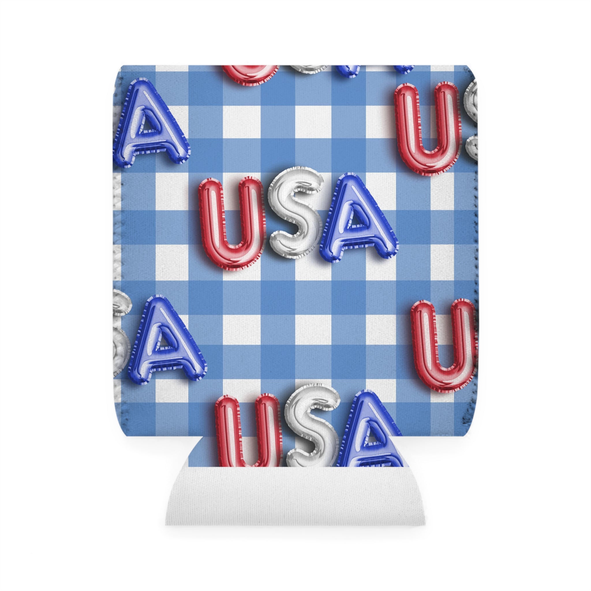 The exterior of the cooler is crafted from neoprene, a flexible and insulating synthetic rubber. It features a blue – and – white gingham pattern with alternating light blue and white squares. The eye – catching accent is the metallic foil – style letters in red (“U”), silver (“S”), and blue (“A”), forming repeated “USA” motifs that overlap playfully across the gingham background. These letters have a shiny, balloon – like texture, creating a 3D effect with red edges, silver highlights, and blue shine for added visual depth.