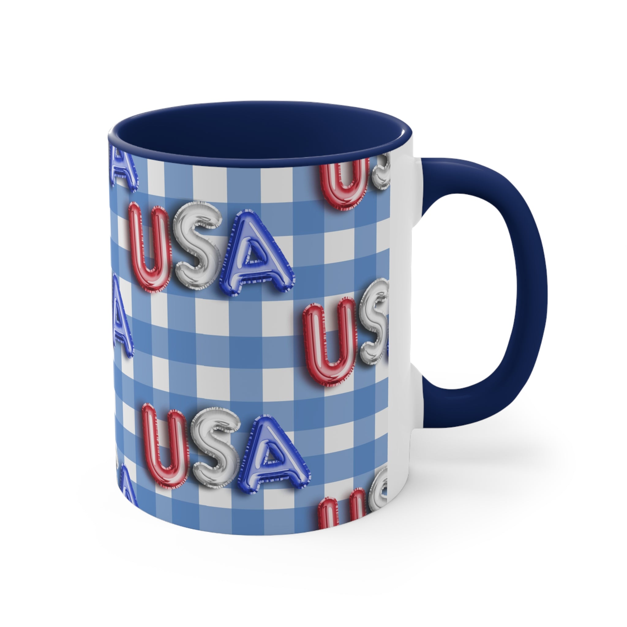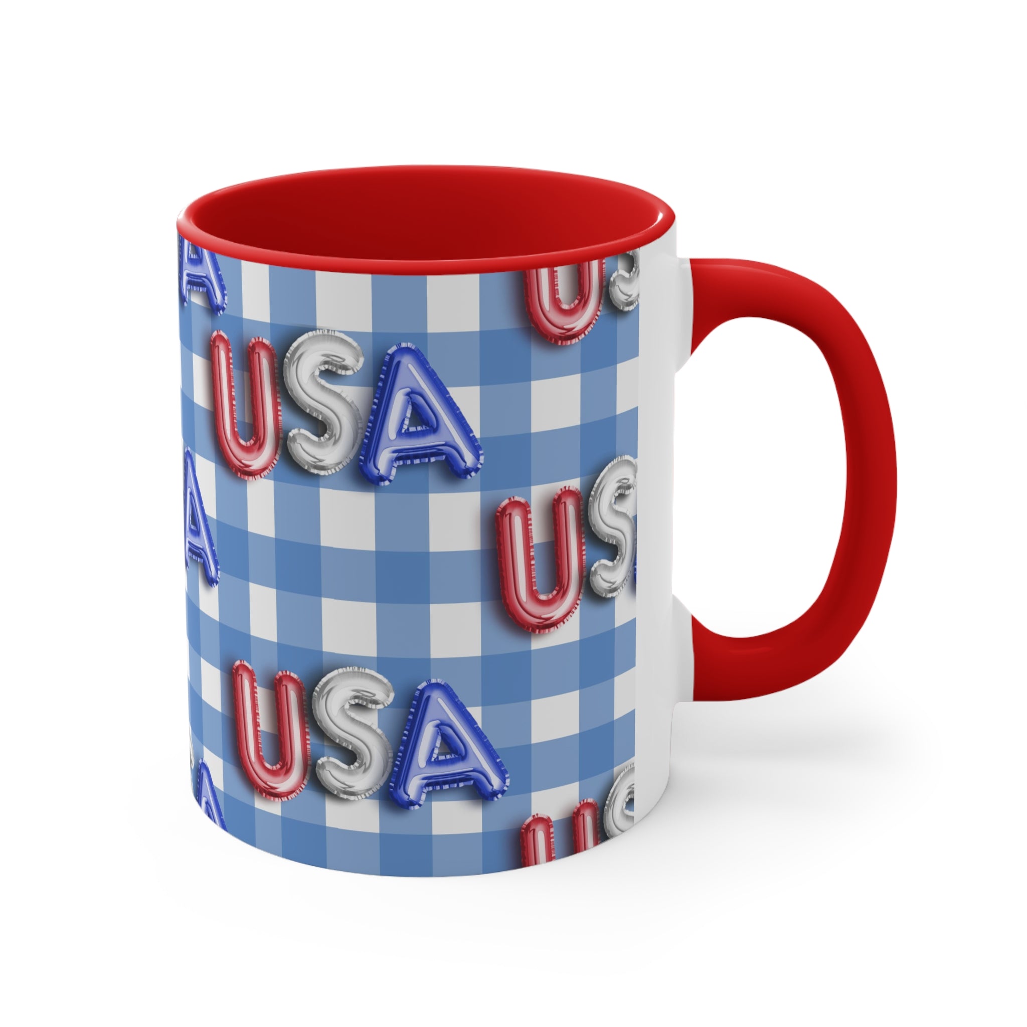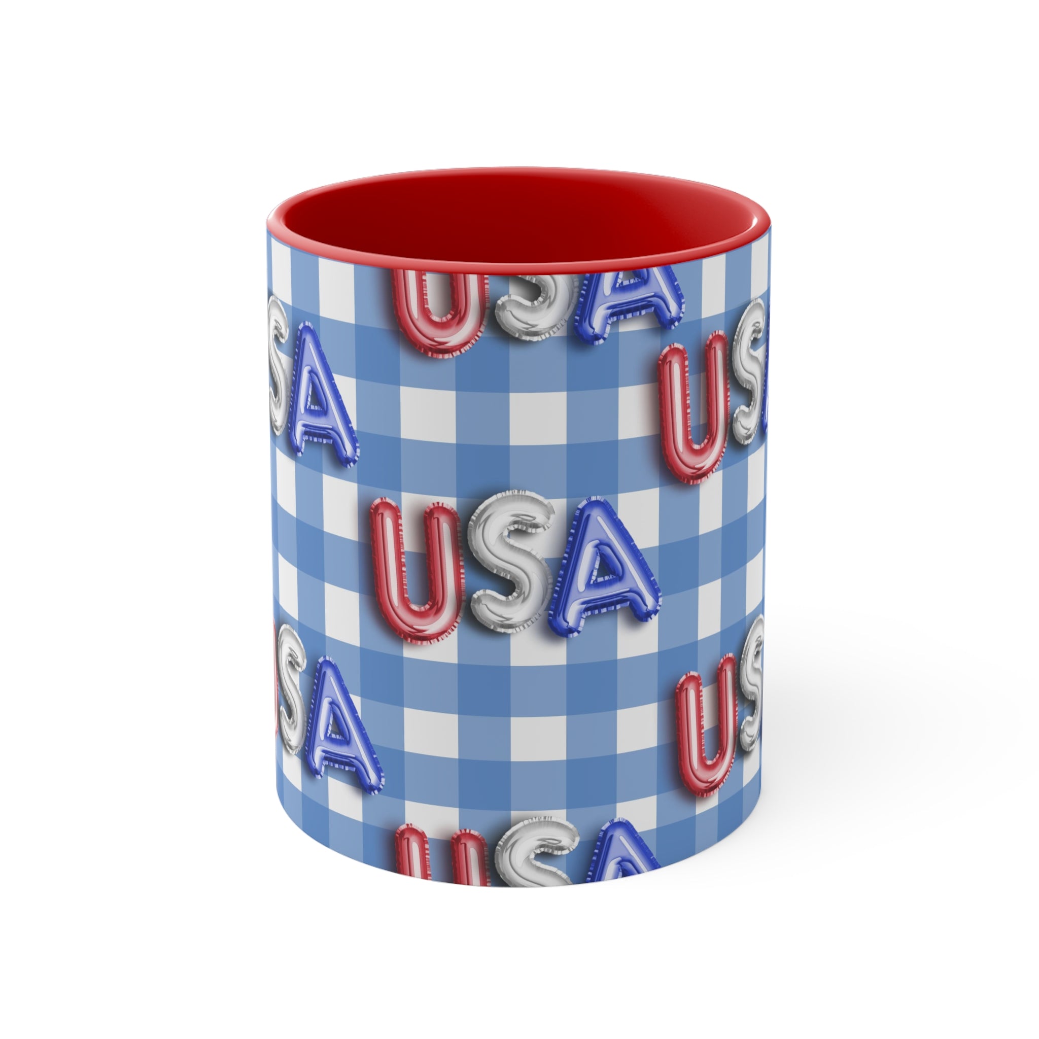 The mug features a beautiful blue – and – white gingham checkered background, a classic symbol of American patriotism. The “USA” letters are printed in red, silver, and blue, styled to resemble foil/balloon letters with a 3D, embossed appearance. Multiple versions offer different color combinations for the interior and handle. You can choose from red or blue for the interior, and red, blue, or white with colored accents for the handle, creating a striking dual – tone effect.