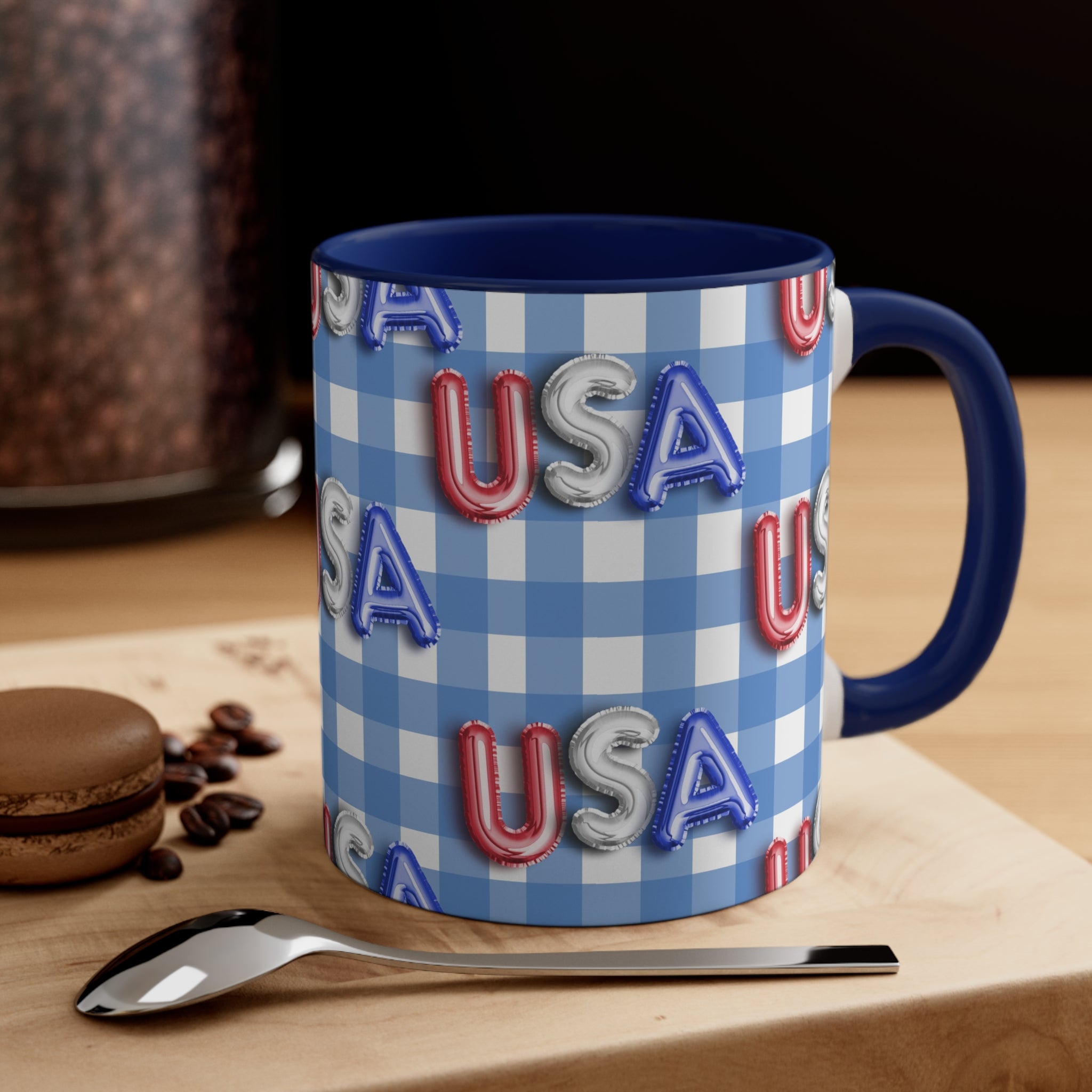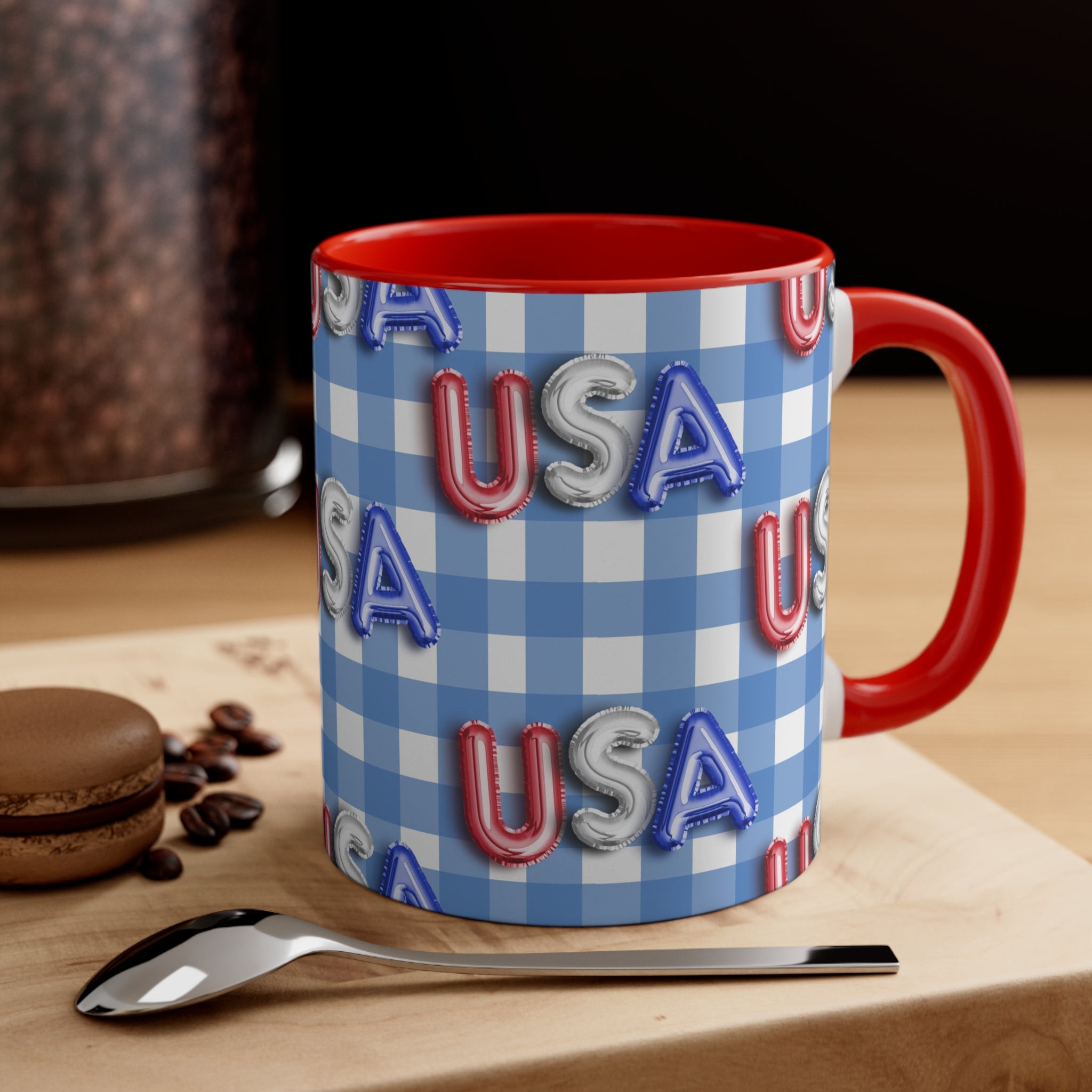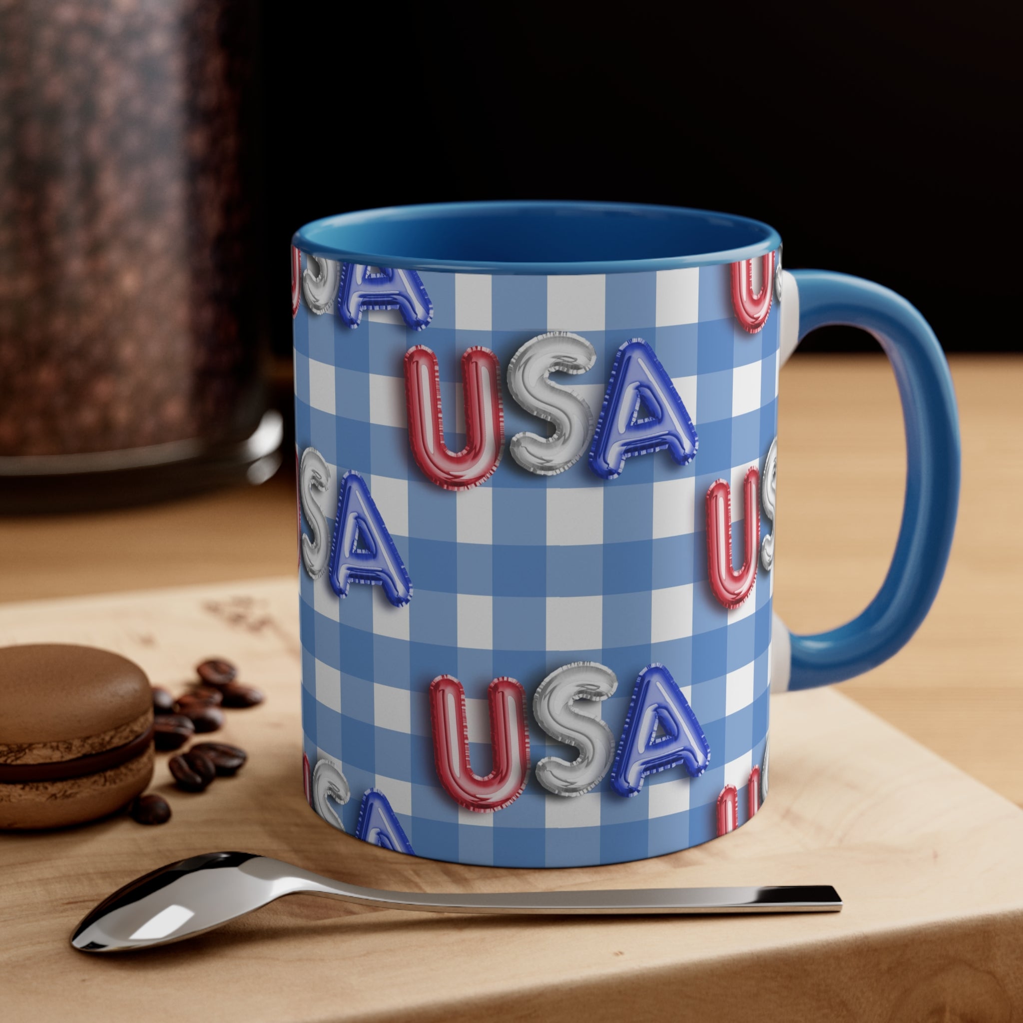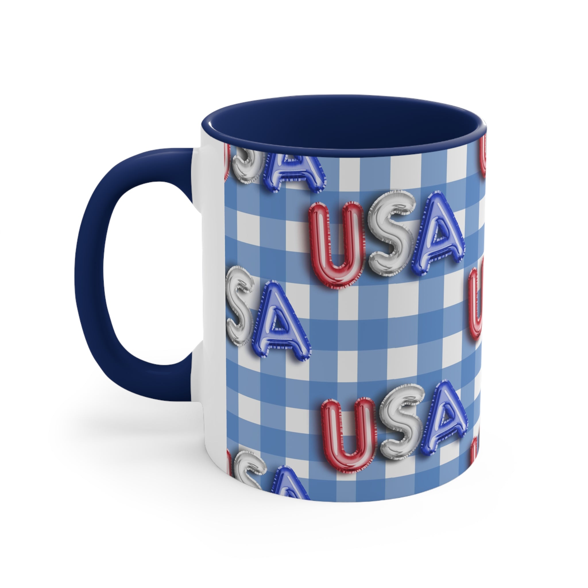 The mug features a beautiful blue – and – white gingham checkered background, a classic symbol of American patriotism. The “USA” letters are printed in red, silver, and blue, styled to resemble foil/balloon letters with a 3D, embossed appearance. Multiple versions offer different color combinations for the interior and handle. You can choose from red or blue for the interior, and red, blue, or white with colored accents for the handle, creating a striking dual – tone effect.