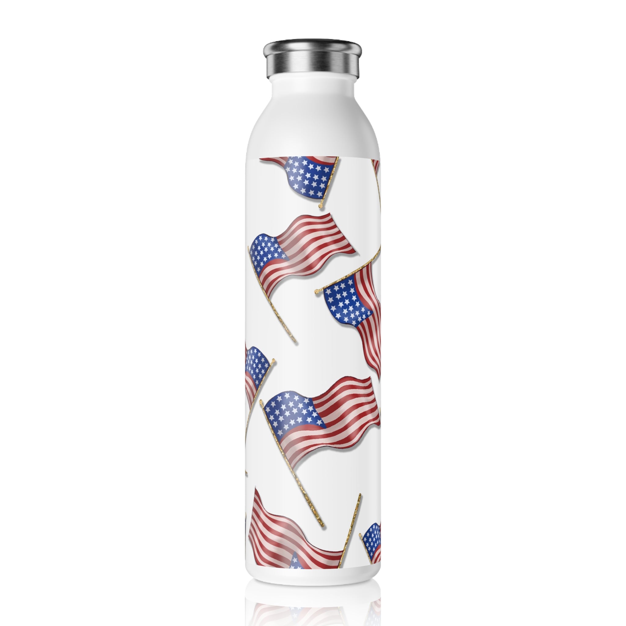 Unleash your patriotic spirit with our American Flags Themed Slim Water Bottle! This reusable water bottle is a perfect blend of style and functionality, designed to accompany you on all your daily adventures.