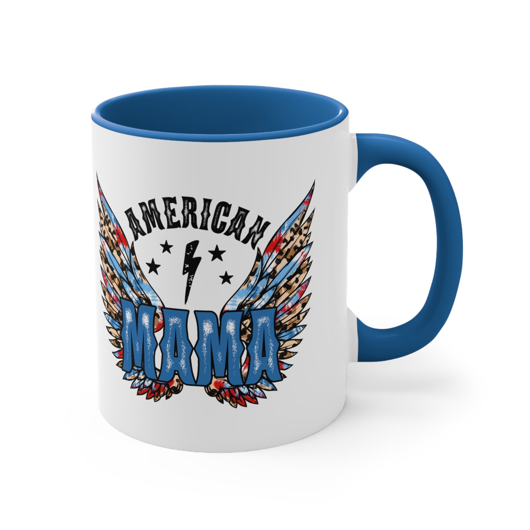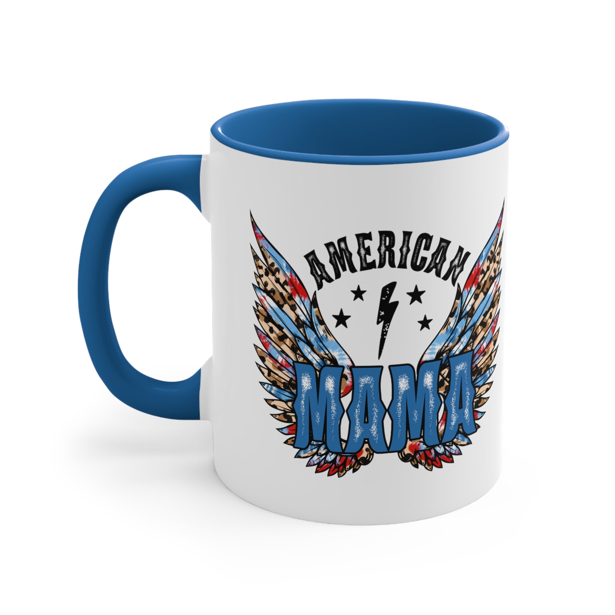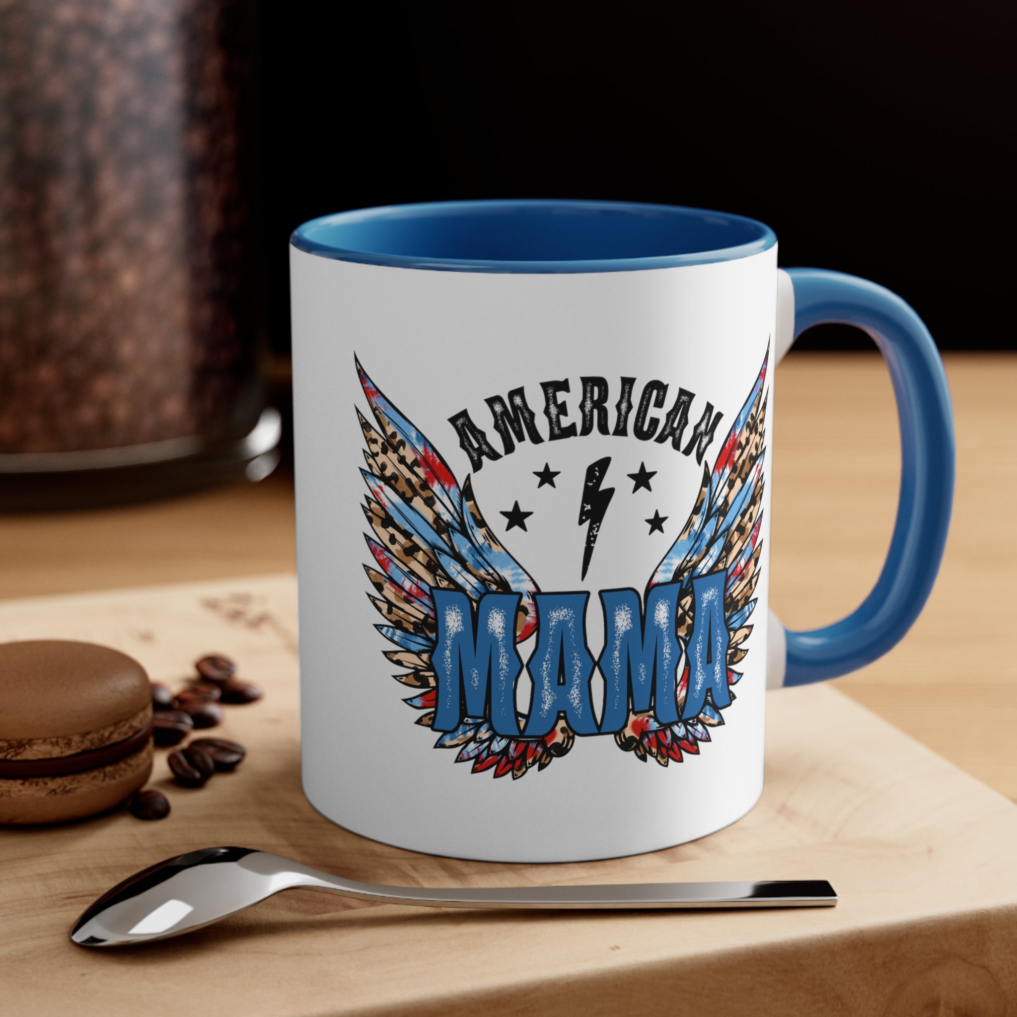 The mug’s body is white, while the interior and handle come in two vibrant color options: red or blue. The design is truly eye – catching, with the text “AMERICAN” in a bold, black, vintage – style curved font at the upper section, and “MAMA” in large, distressed blue letters with white speckles at the lower section, giving it a worn, retro feel. A black lightning bolt and four small black stars are centered between the text, and behind it, large, detailed wings combine leopard print (brown/black spots) with red, white, and blue, resembling the American flag, creating a patriotic and rockabilly aesthetic.