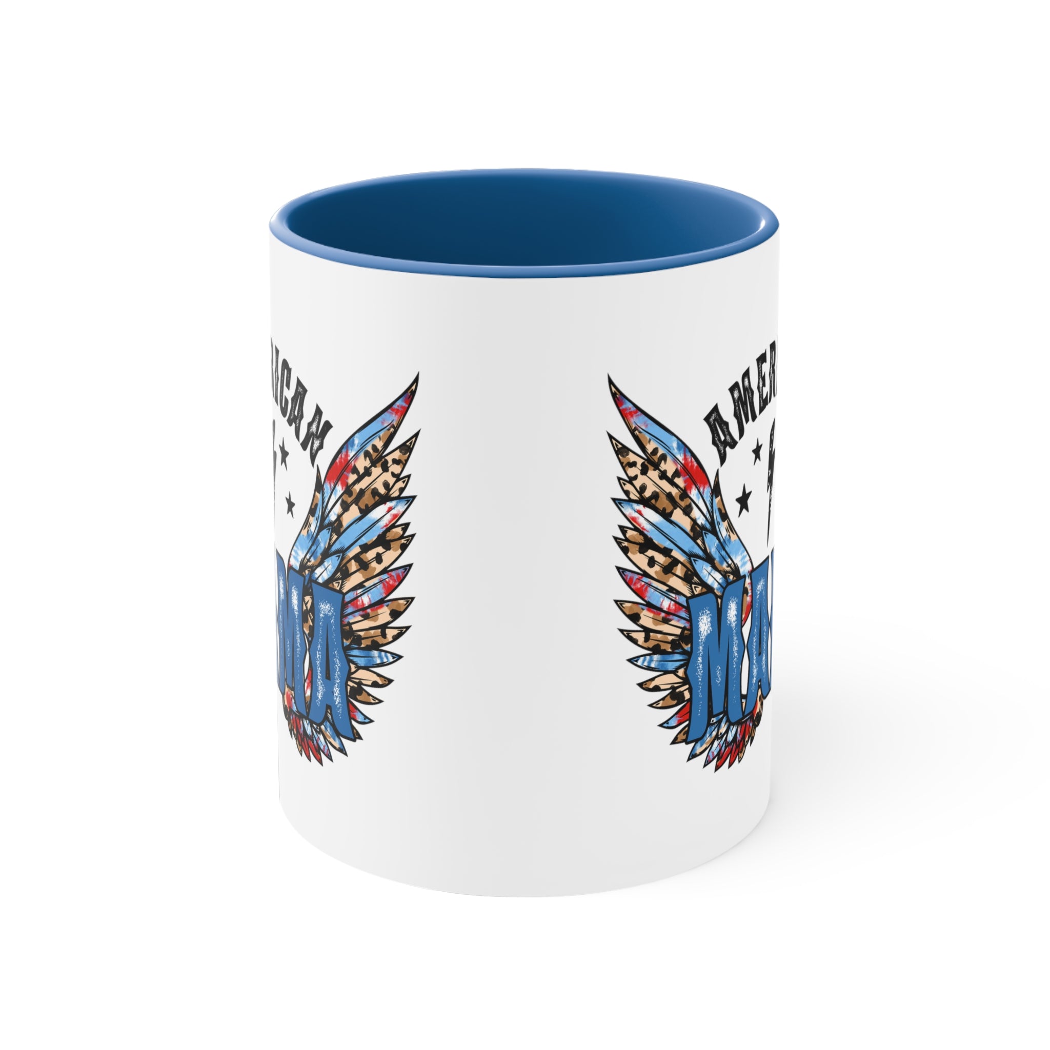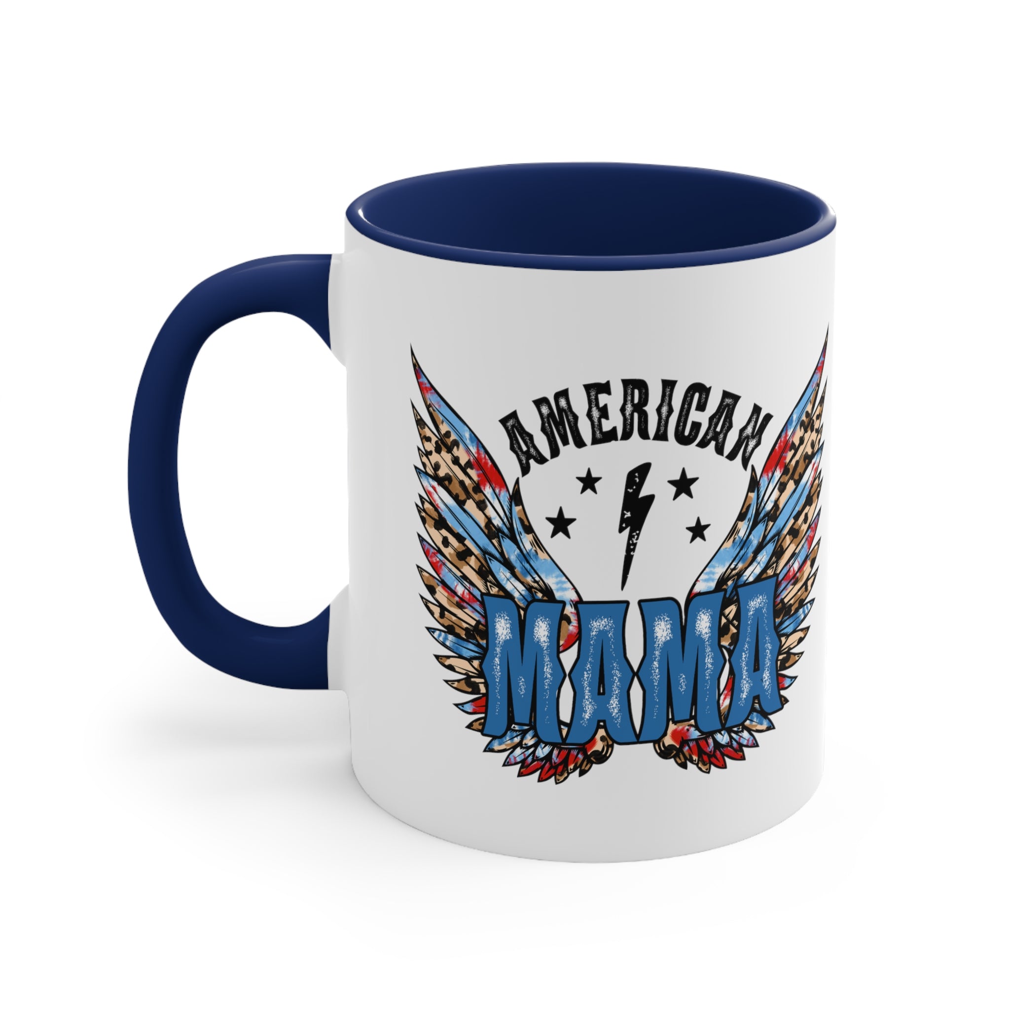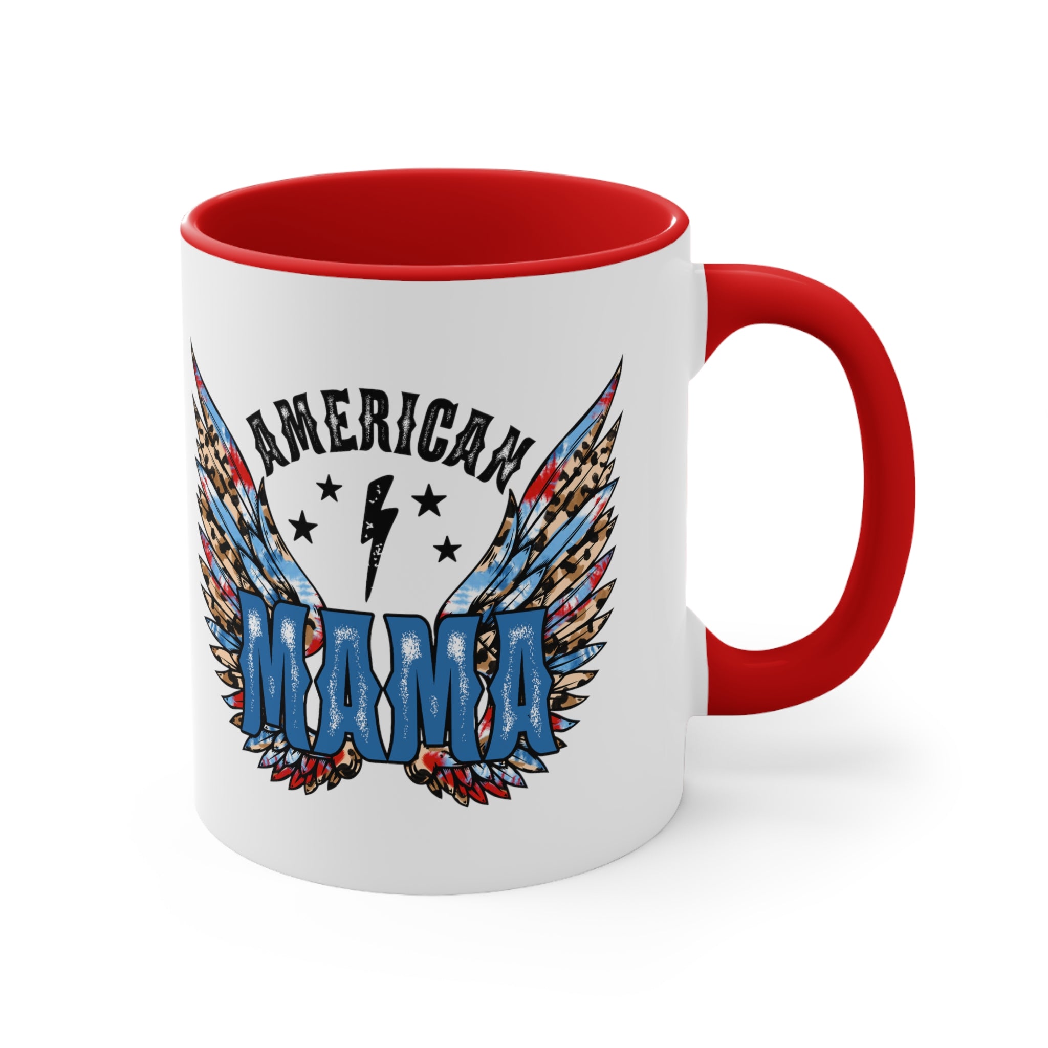 The mug’s body is white, while the interior and handle come in two vibrant color options: red or blue. The design is truly eye – catching, with the text “AMERICAN” in a bold, black, vintage – style curved font at the upper section, and “MAMA” in large, distressed blue letters with white speckles at the lower section, giving it a worn, retro feel. A black lightning bolt and four small black stars are centered between the text, and behind it, large, detailed wings combine leopard print (brown/black spots) with red, white, and blue, resembling the American flag, creating a patriotic and rockabilly aesthetic.