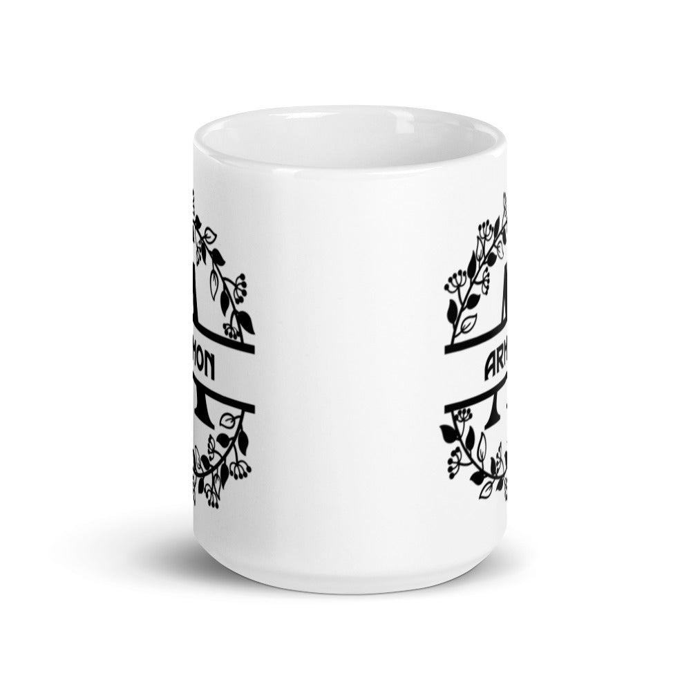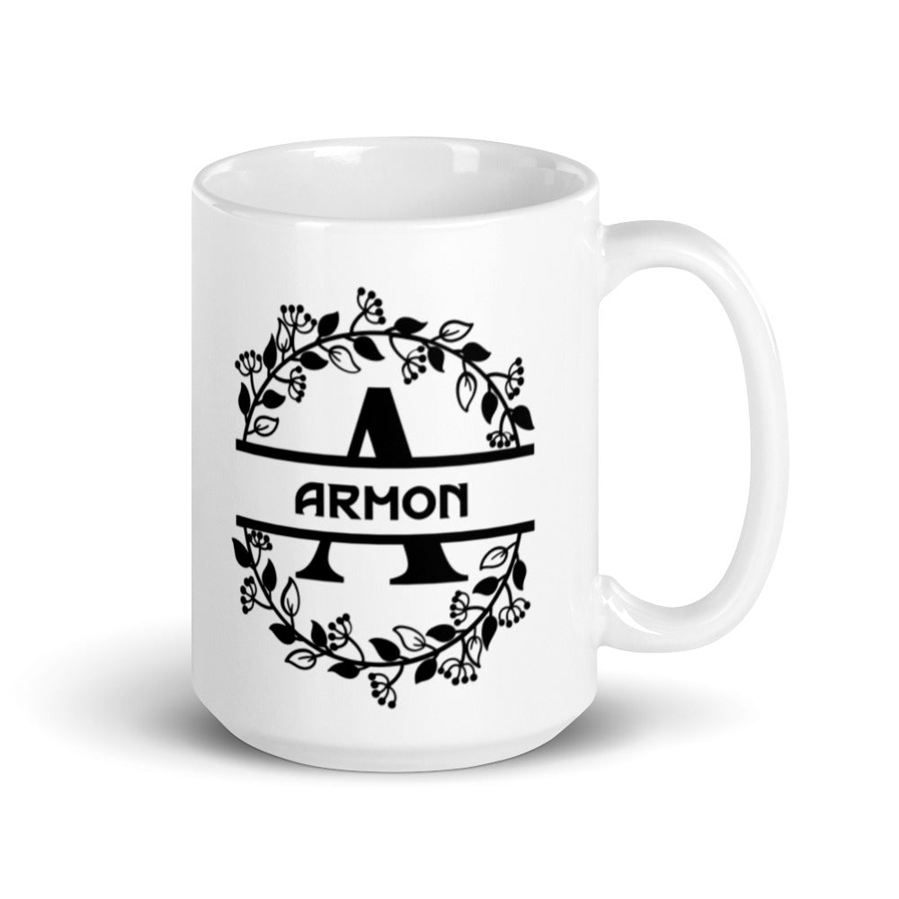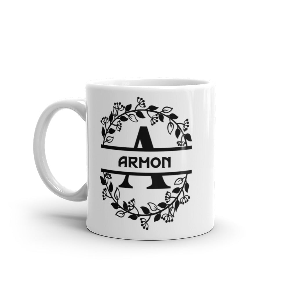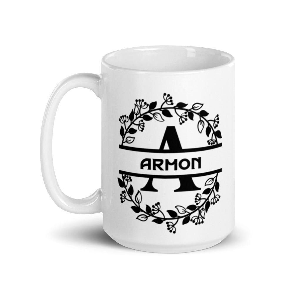 - Design: A symmetrical, circular floral wreath frames a stylized black letter “A” and the bold text “ARMON”