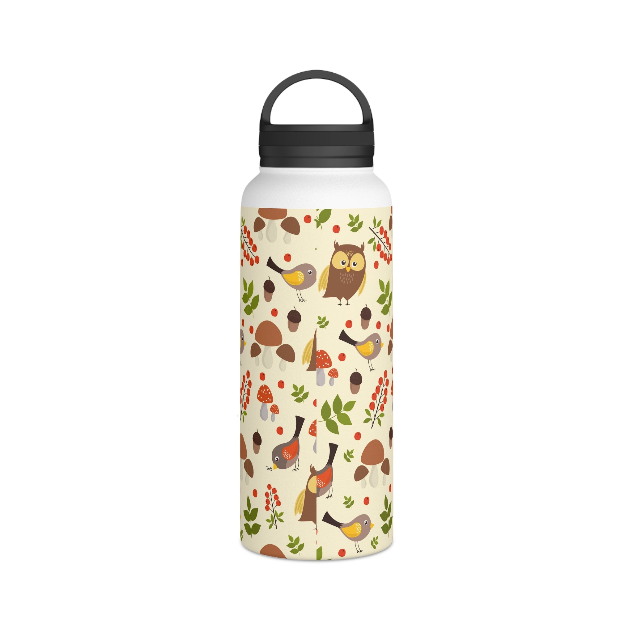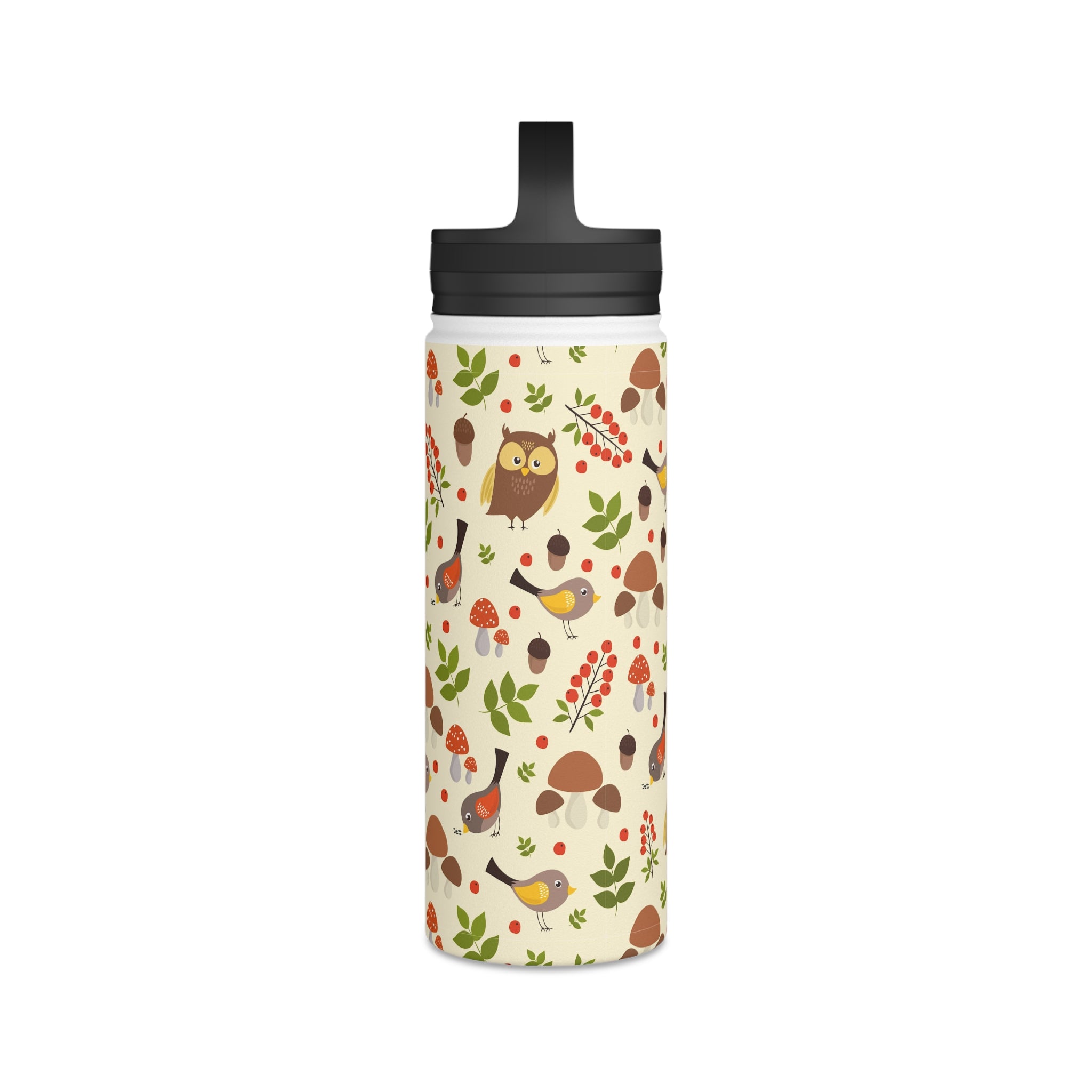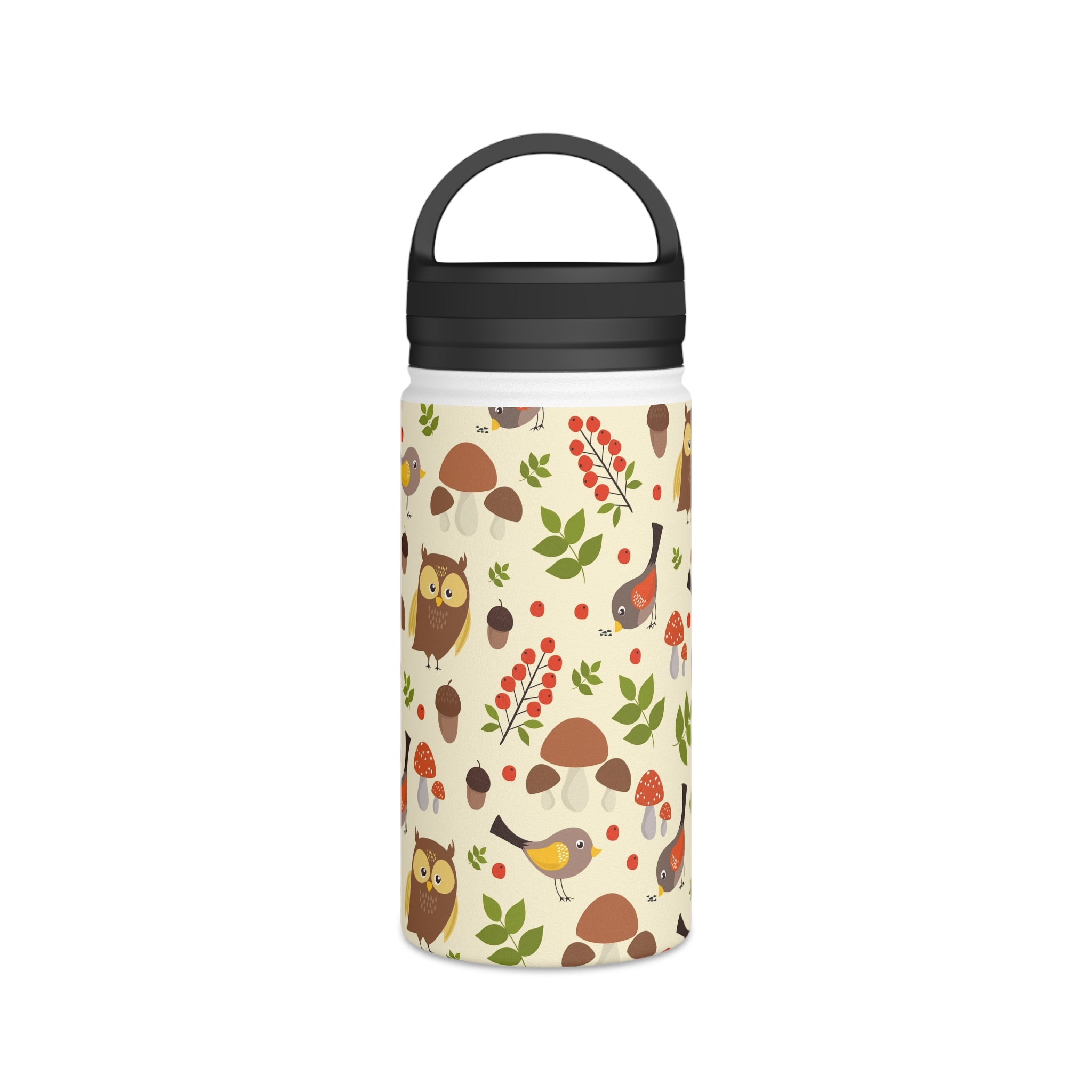 The bottle showcases a cream/light beige background with a seamless, repeating woodland pattern. The pattern elements include brown owls with yellow accents, small birds with yellow/brown feathers and red/orange underwings, and tiny birds with yellow wings. You’ll also find red berries like holly/rowan, green leaves of varied shapes, brown acorns, and mushrooms, some with red caps resembling Amanita. Earthy tones of browns, reds, greens, and yellows are complemented by black on the lid and handle for a striking contrast. The all – over print wraps around the entire bottle, ensuring consistent design visibility from all angles.