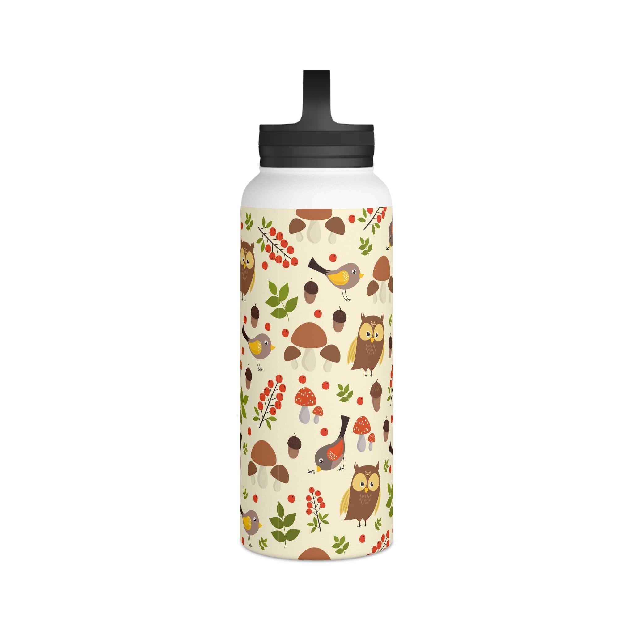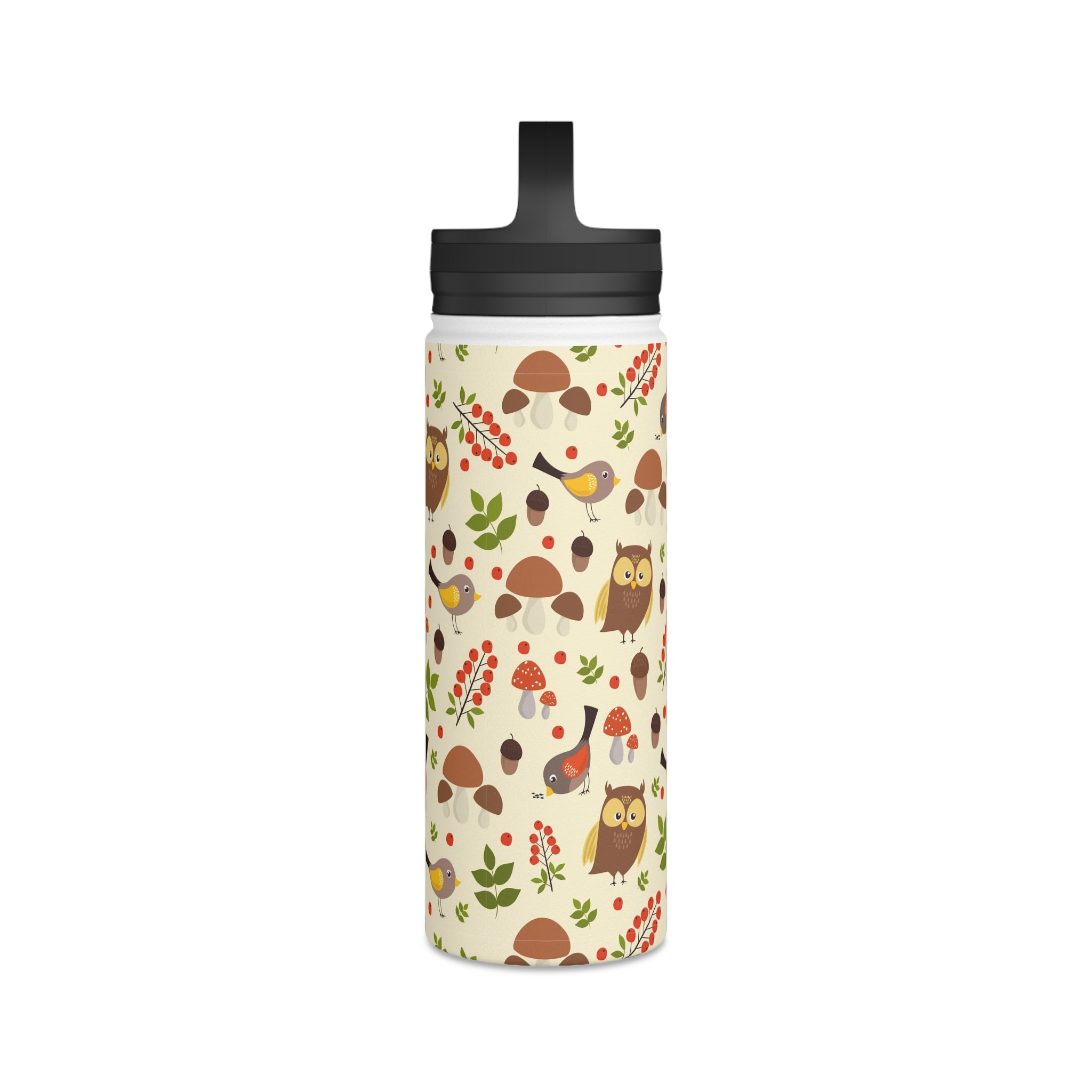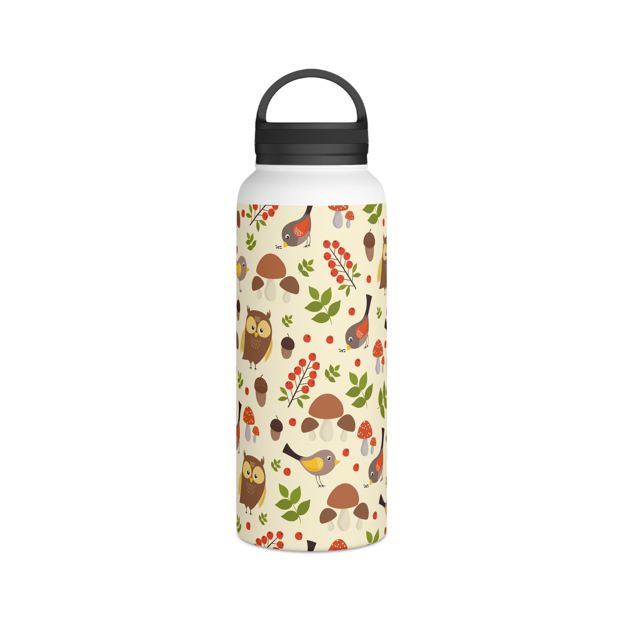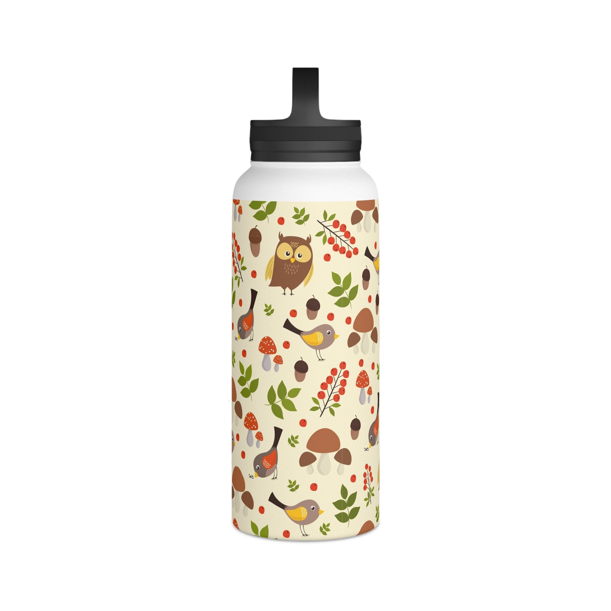 The bottle showcases a cream/light beige background with a seamless, repeating woodland pattern. The pattern elements include brown owls with yellow accents, small birds with yellow/brown feathers and red/orange underwings, and tiny birds with yellow wings. You’ll also find red berries like holly/rowan, green leaves of varied shapes, brown acorns, and mushrooms, some with red caps resembling Amanita. Earthy tones of browns, reds, greens, and yellows are complemented by black on the lid and handle for a striking contrast. The all – over print wraps around the entire bottle, ensuring consistent design visibility from all angles.