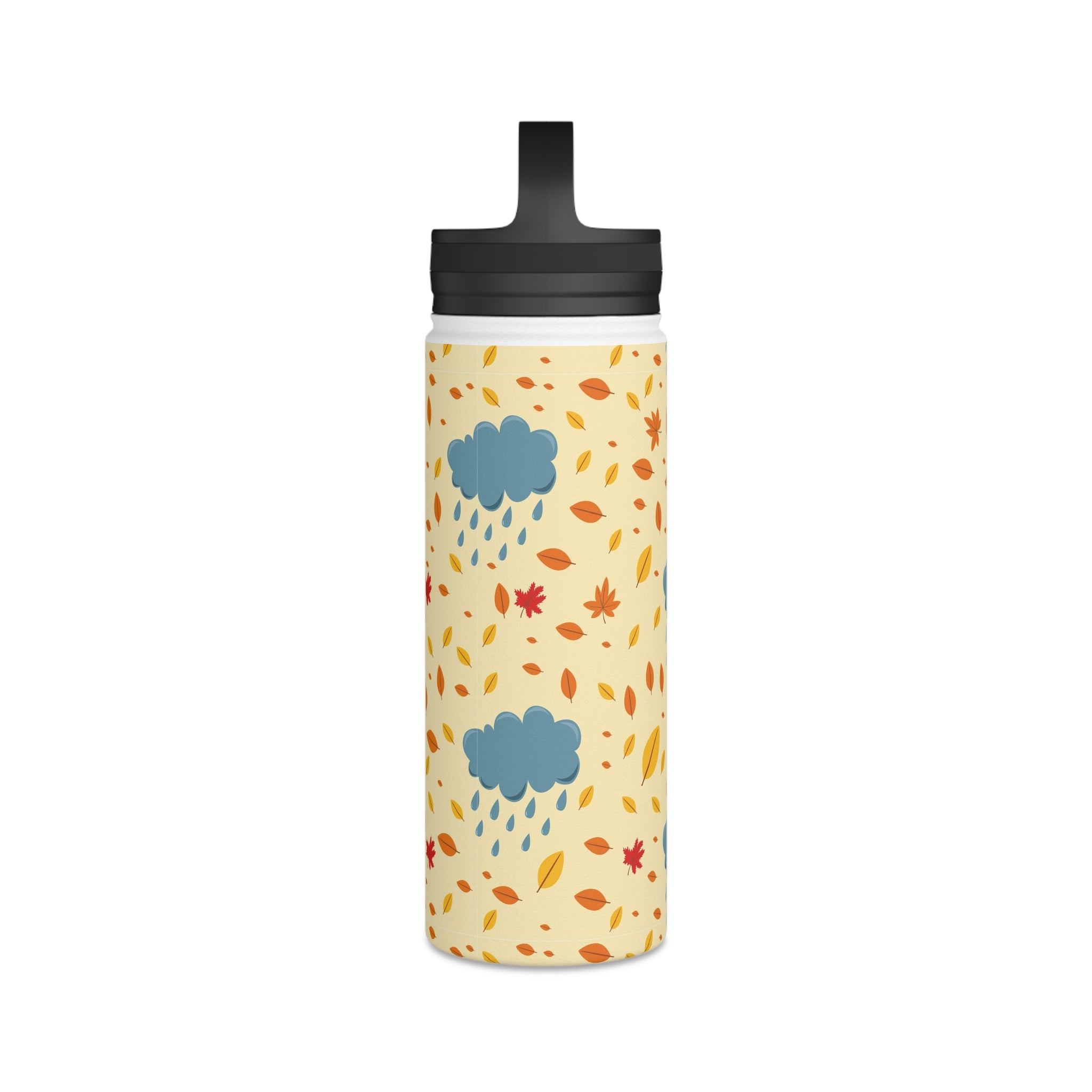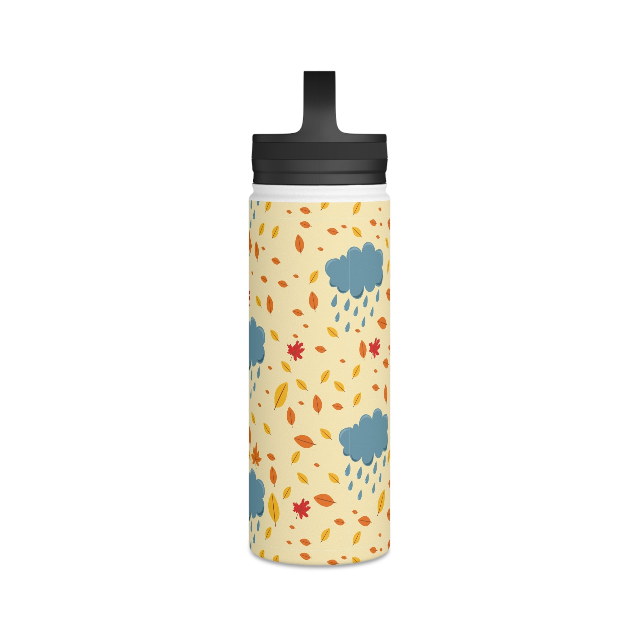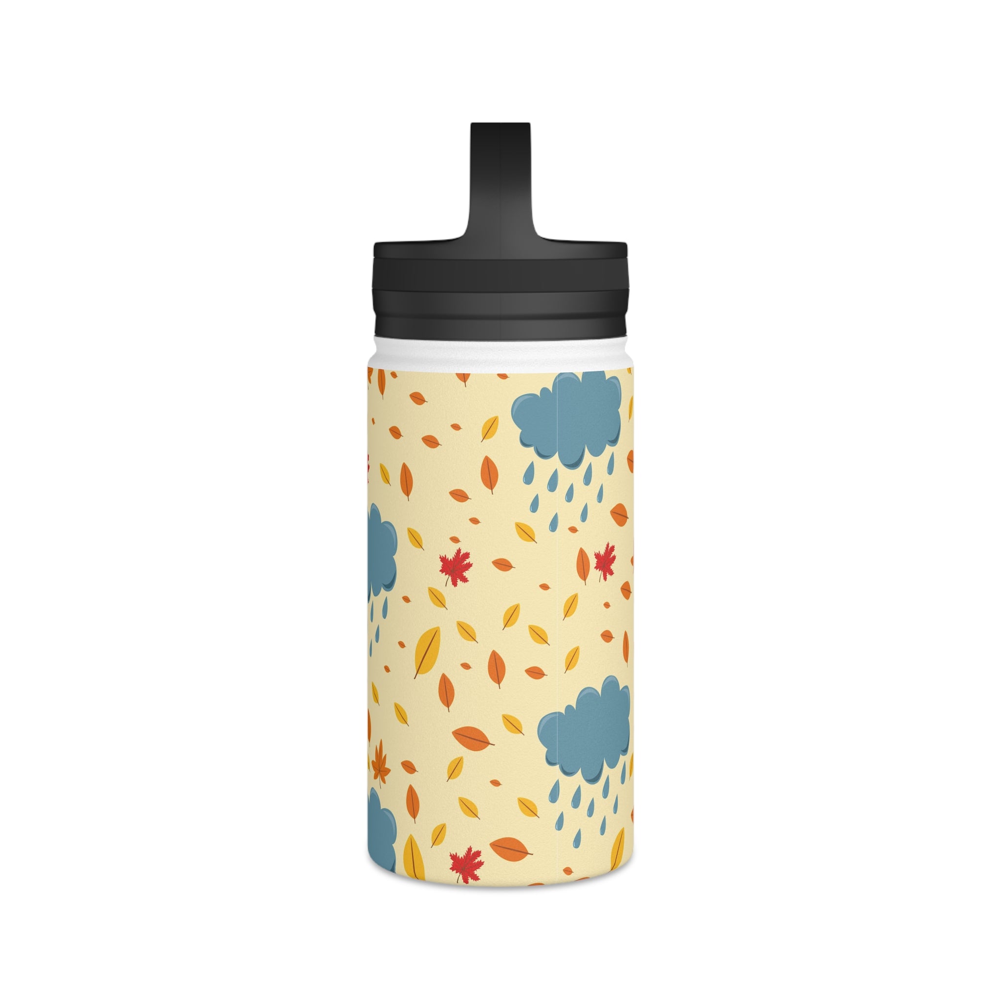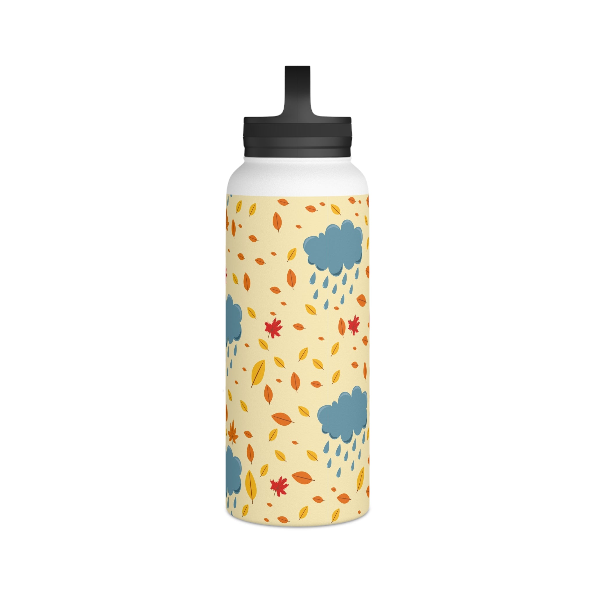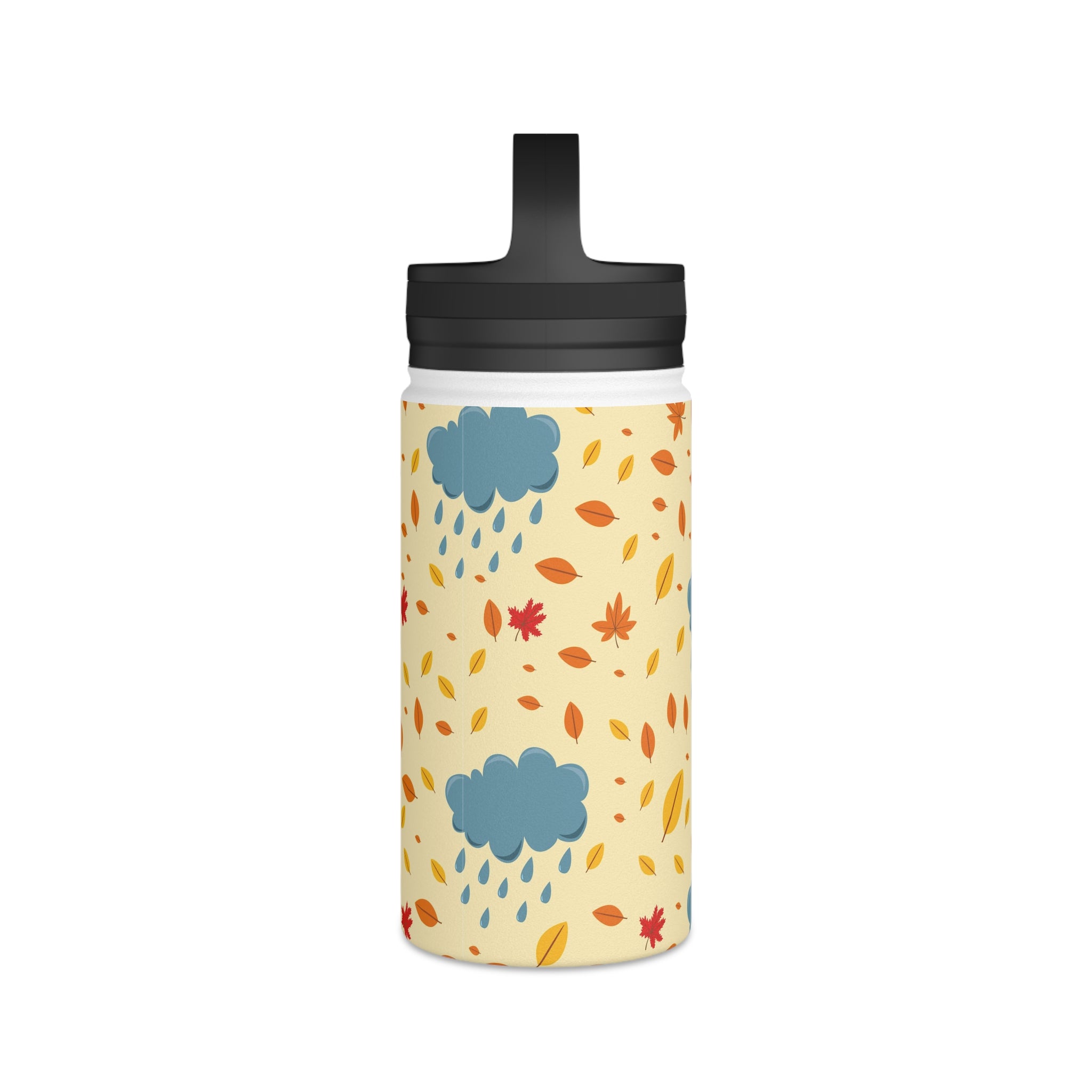 The water bottle features a light cream (pale yellow) base color on its stainless – steel exterior, adorned with a captivating pattern. Cartoonish blue clouds with raindrops, along with a variety of fall leaves in red, orange, yellow, and greenish hues, create a playful and cohesive fall aesthetic. The small blue raindrops beneath the clouds add to the seasonal charm.