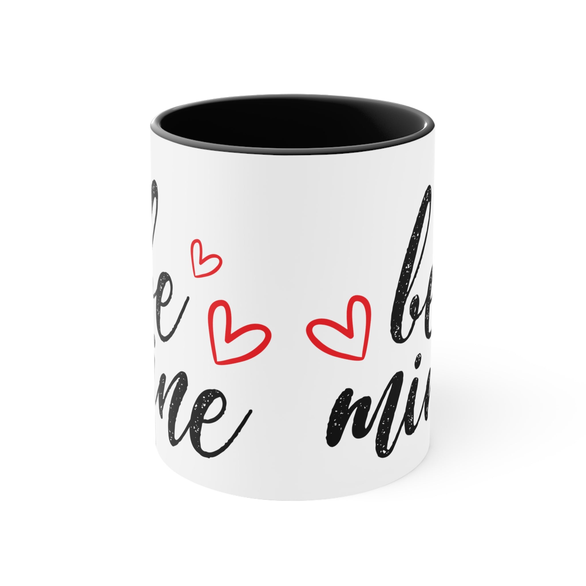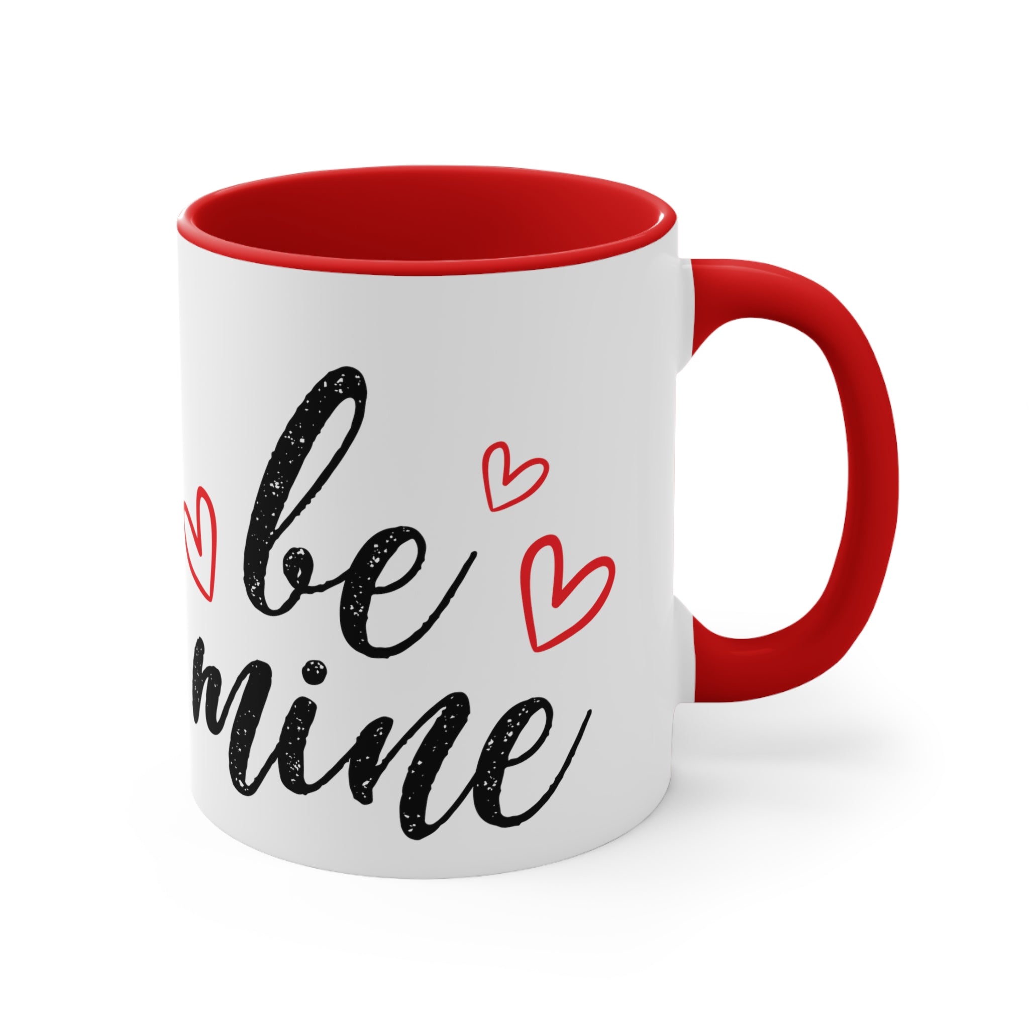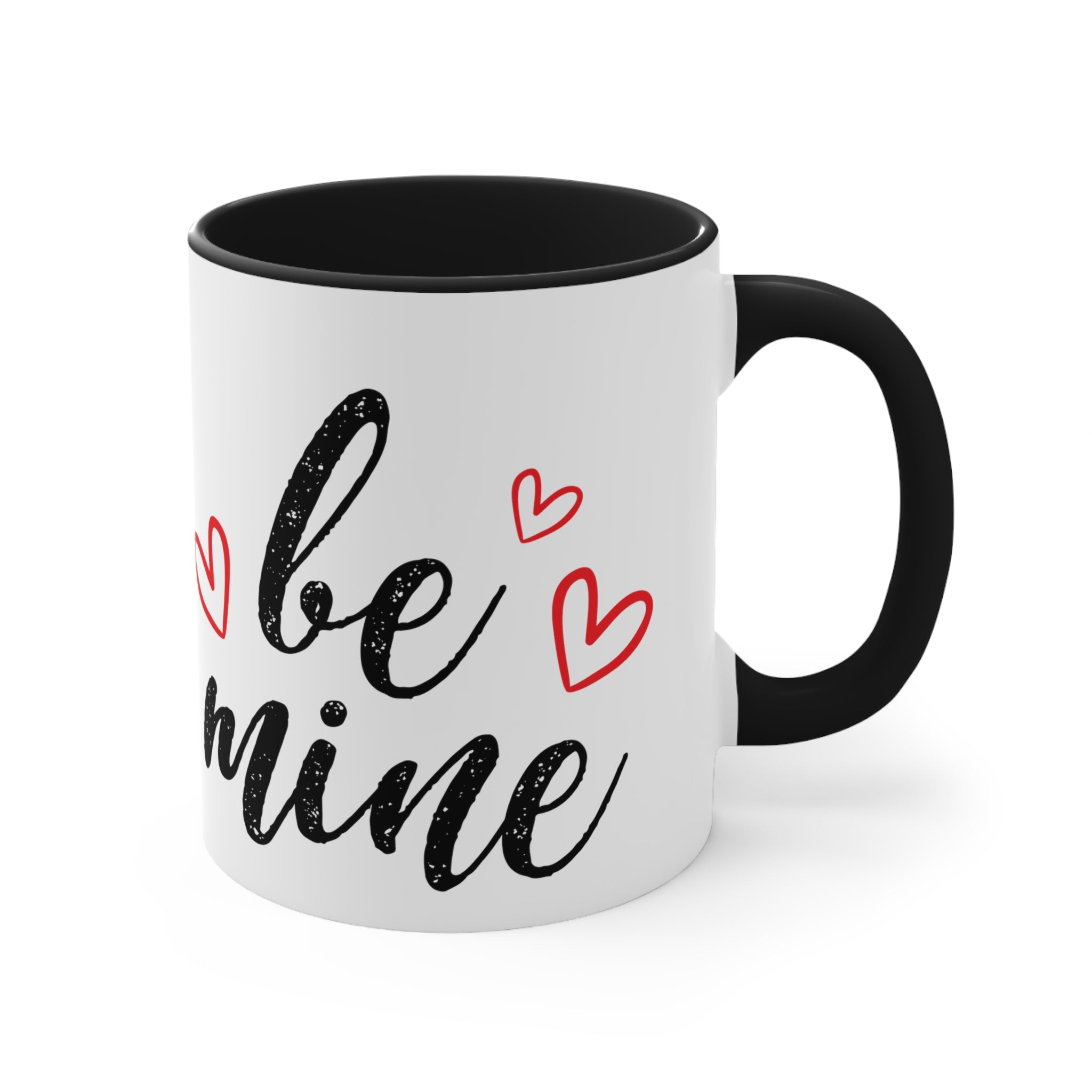 Centered on the mug, you’ll find the bold, black, brushstroke-style text “be mine” with a distressed/grungy texture, giving it a handwritten, vintage feel. Red heart shapes, both filled and with simple outlines, are scattered around the text, emphasizing the romantic theme and adding a playful touch. The design is screen-printed or heat-transferred, ensuring durability and vibrant colors that won’t fade easily.