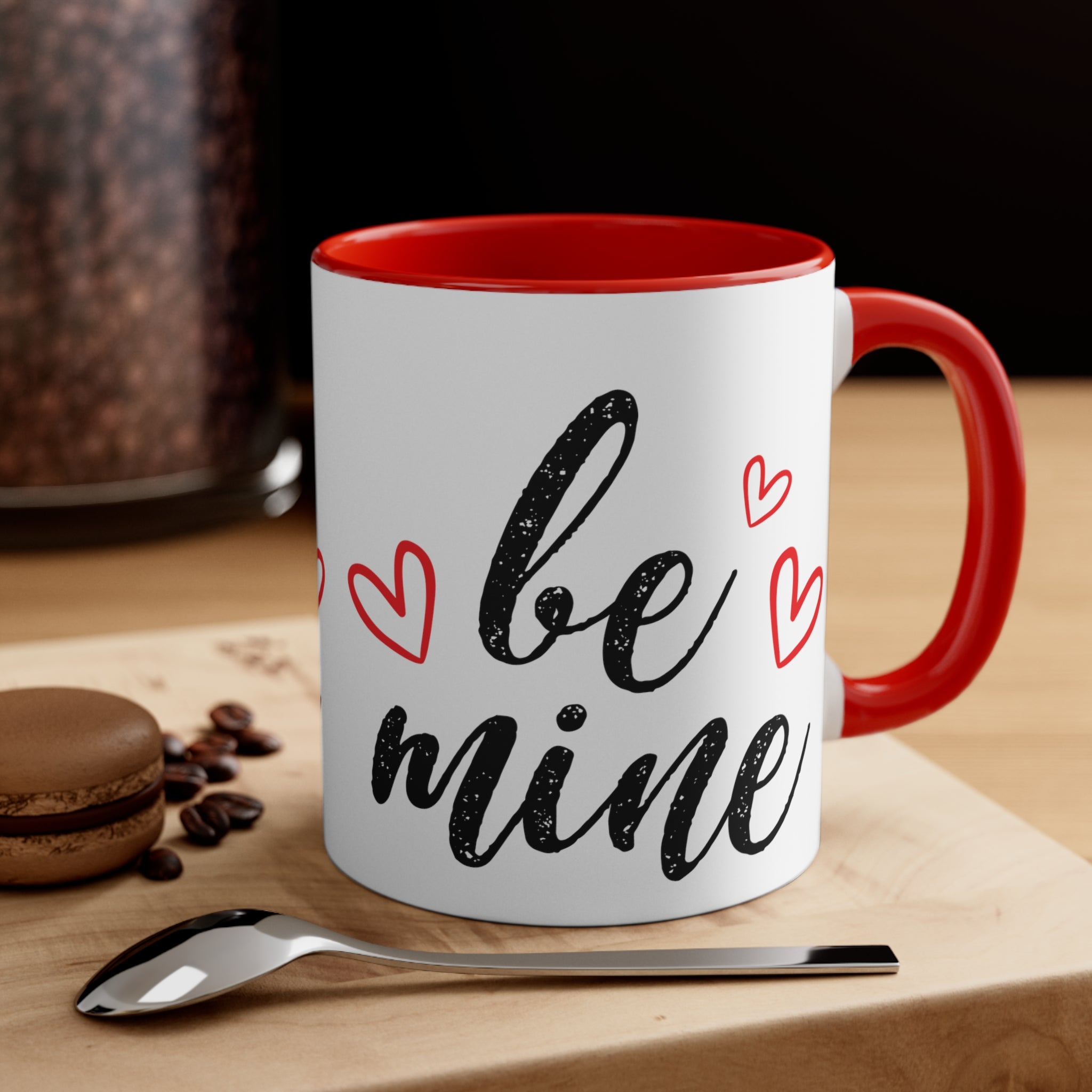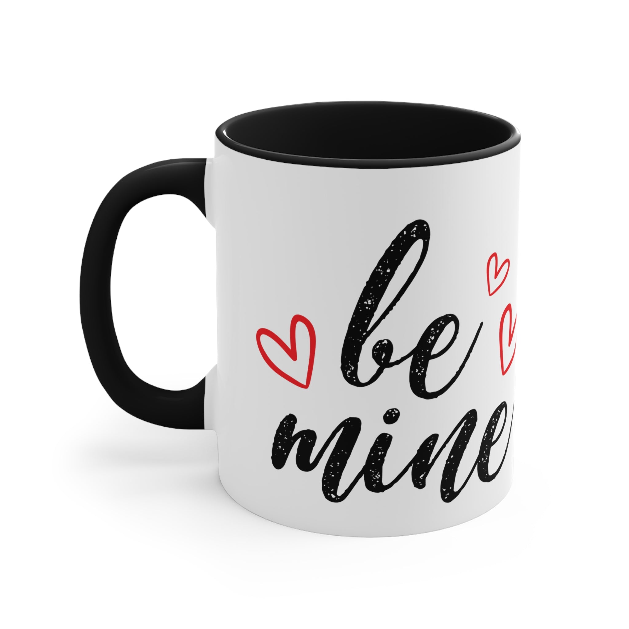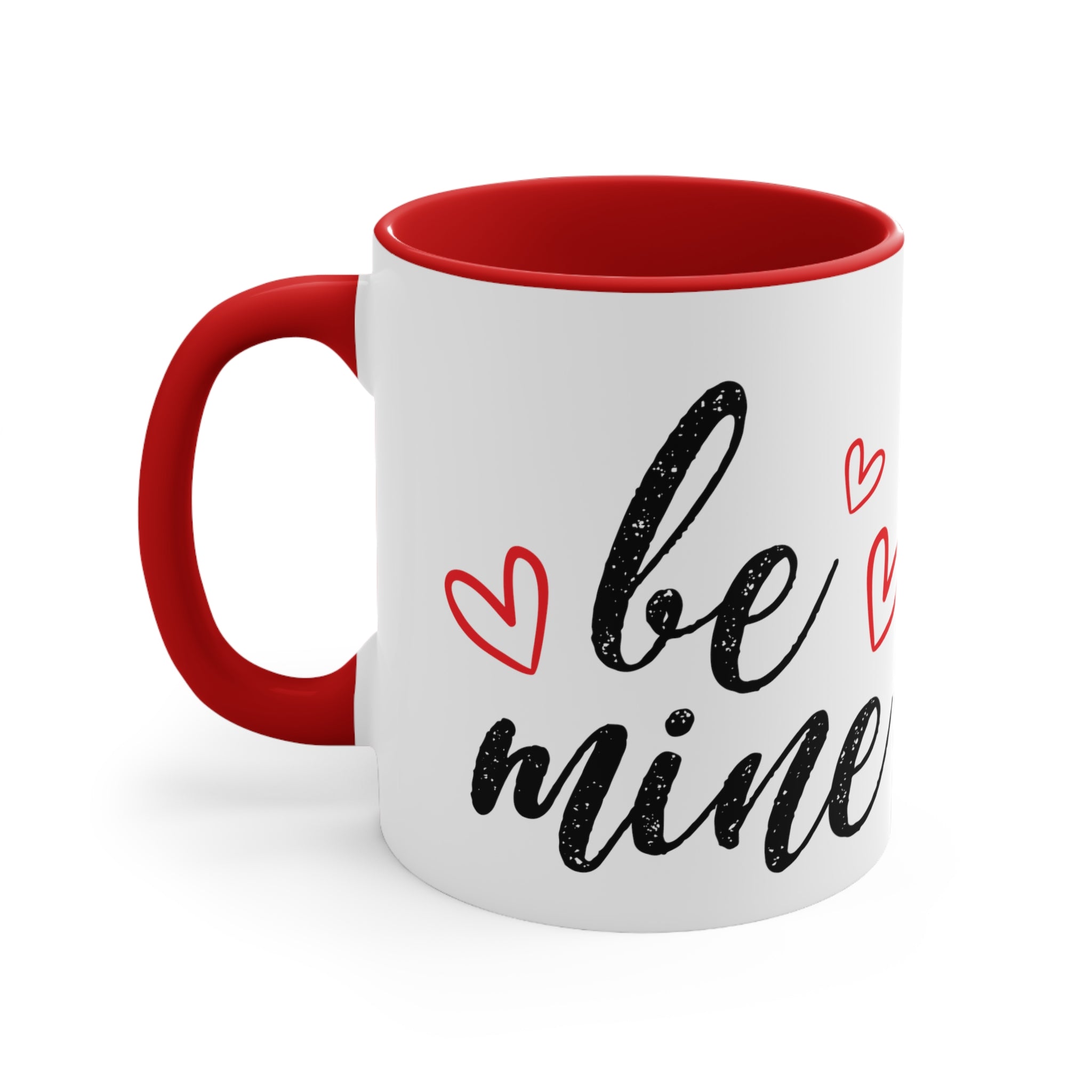 Centered on the mug, you’ll find the bold, black, brushstroke-style text “be mine” with a distressed/grungy texture, giving it a handwritten, vintage feel. Red heart shapes, both filled and with simple outlines, are scattered around the text, emphasizing the romantic theme and adding a playful touch. The design is screen-printed or heat-transferred, ensuring durability and vibrant colors that won’t fade easily.