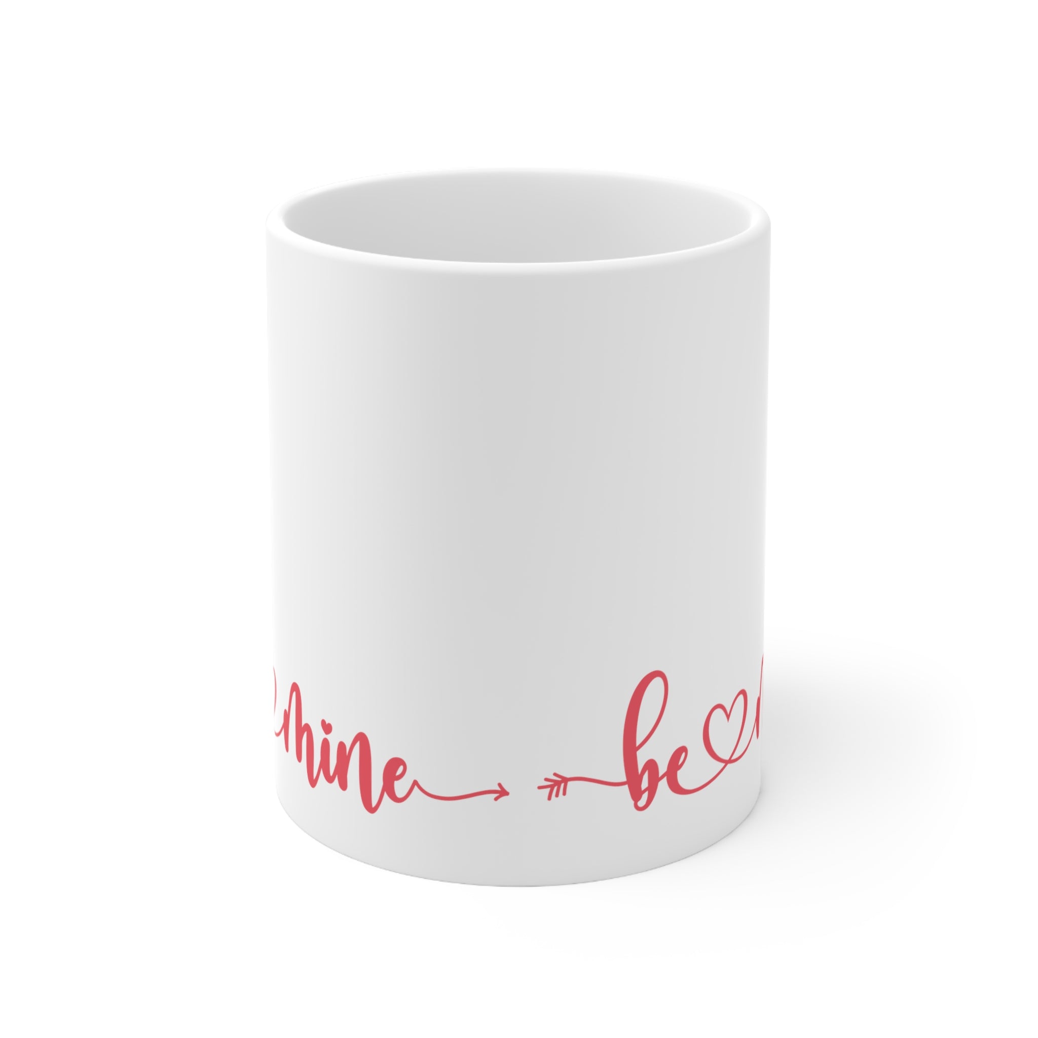 The mug is crafted from high – quality ceramic, likely porcelain or bone china, as evident from its smooth, glossy finish. It has a classic white color on both the exterior and interior, providing a clean and elegant backdrop for the vibrant red design. The phrase “be mine” is printed in a beautiful cursive font, with a heart symbol integrated between “be” and “mine” and an arrow extending from the end of “mine”. This love – themed design is both playful and romantic, and it wraps along the lower front of the mug, visible from multiple angles.