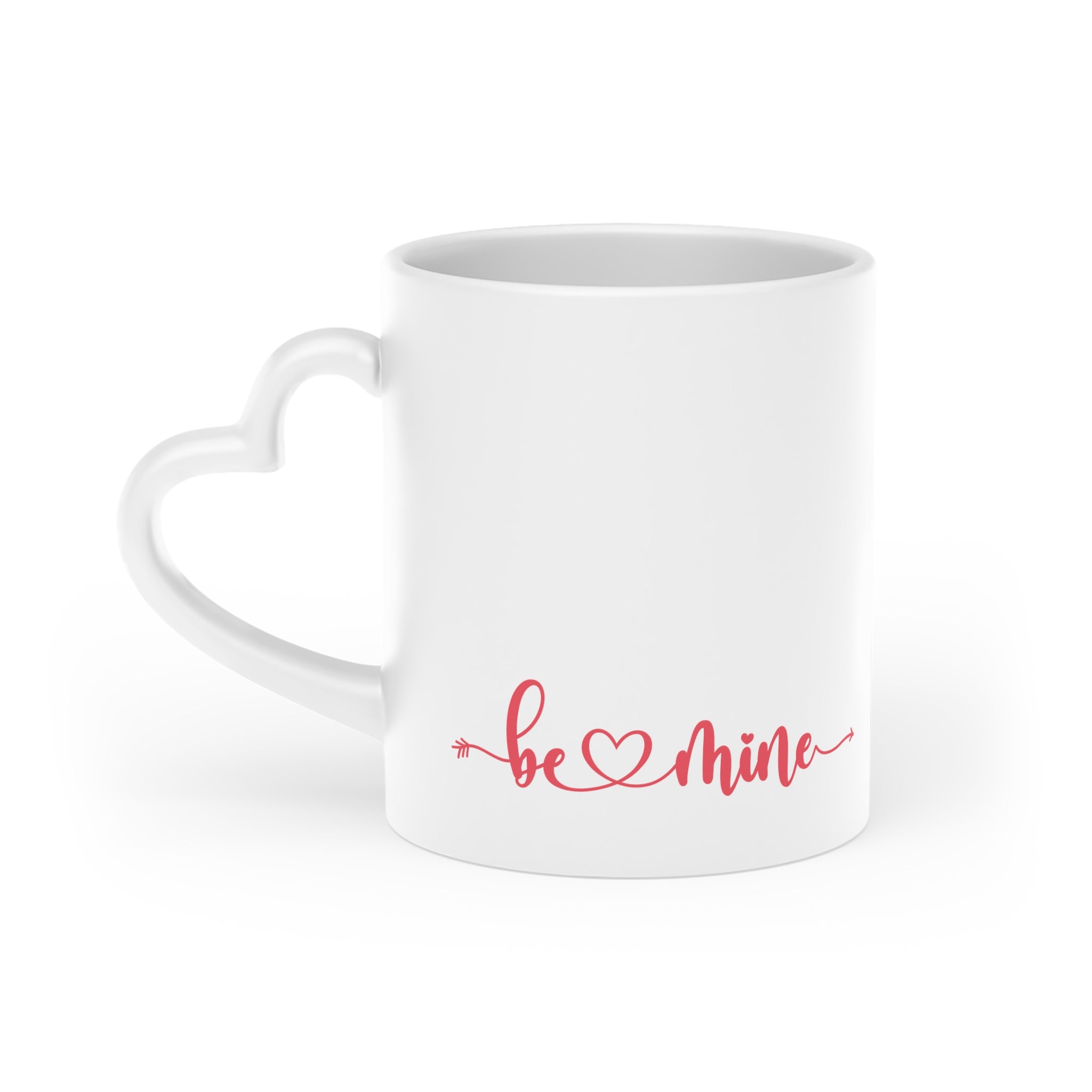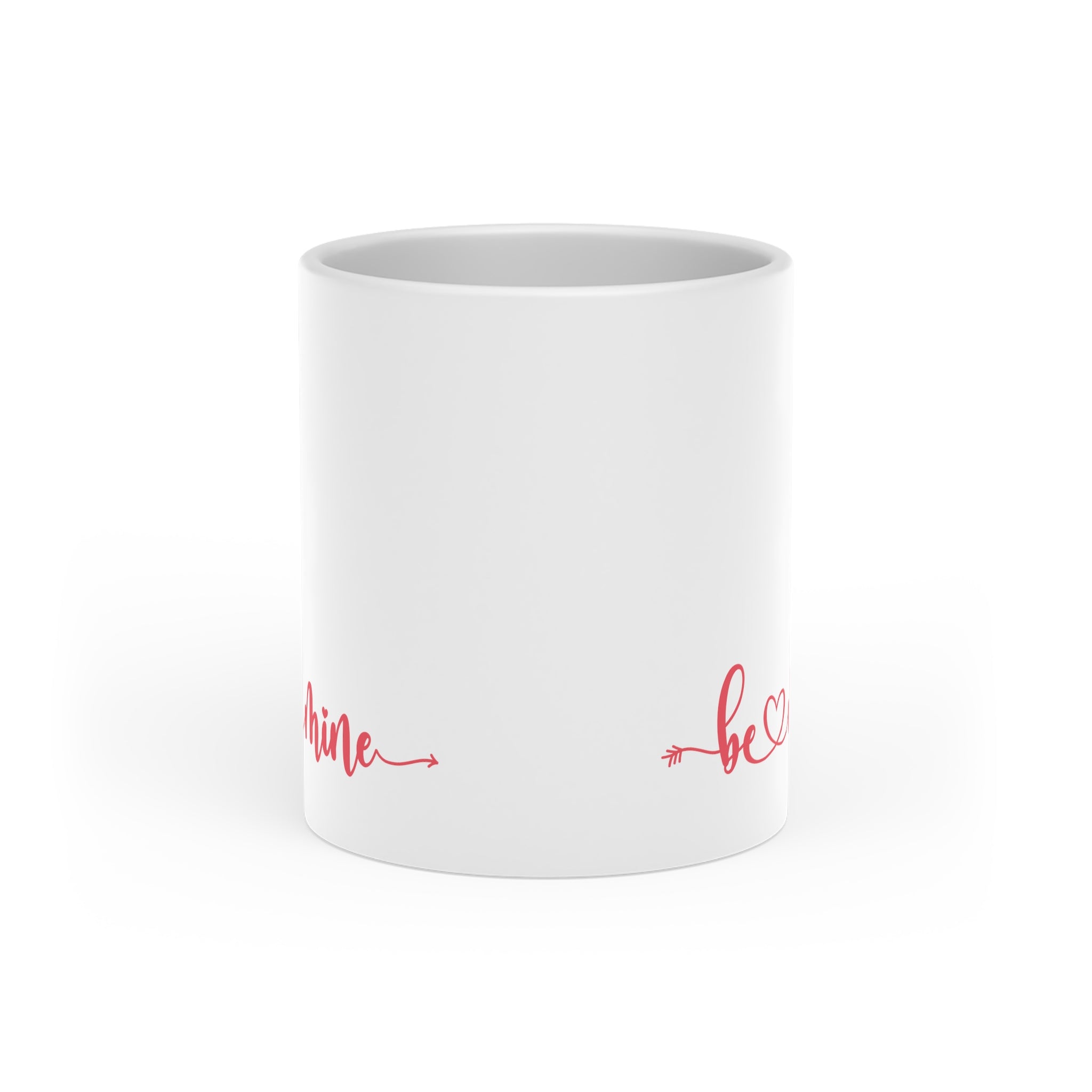 The mug features a base color of glossy white, with bright red serving as the accent color for the cursive text “be mine” in a stylized, handwritten font. An integrated heart symbol, sometimes replacing a letter like the “e” in “be,” and small arrow details pointing towards the heart further enhance the romantic theme.