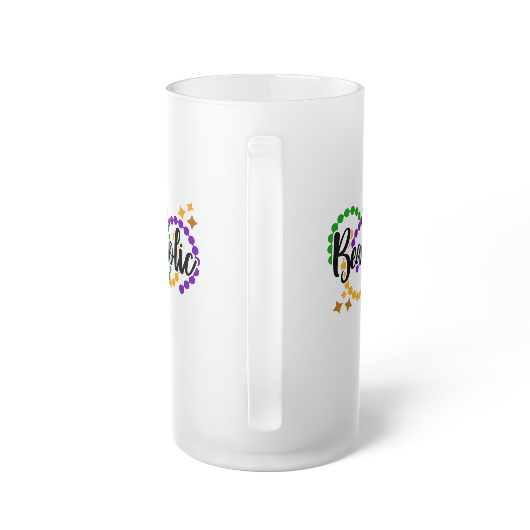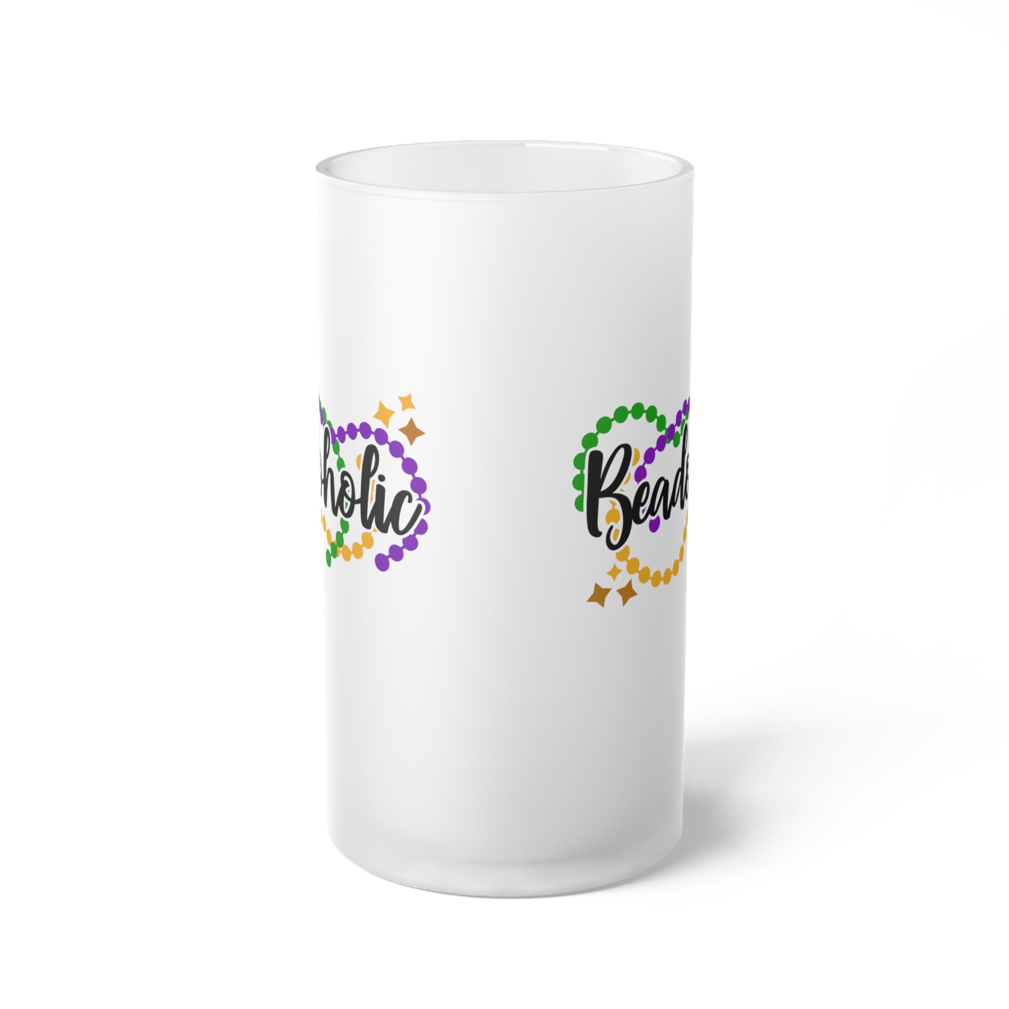 Crafted from a frosted, white material, likely frosted glass, this mug offers a sleek and modern look. The base color is a smooth, opaque frosted white, which not only provides an elegant aesthetic but also protects the vibrant design from chipping or fading. The design features the word “Beadoholic” in a bold, black, cursive/handwritten font, integrated with Mardi Gras – inspired beads in green, purple, and gold (yellow) colors. These beads are arranged in a continuous loop around the text, forming a cohesive and festive pattern. Small gold star shapes add a playful, celebratory touch to the overall design.