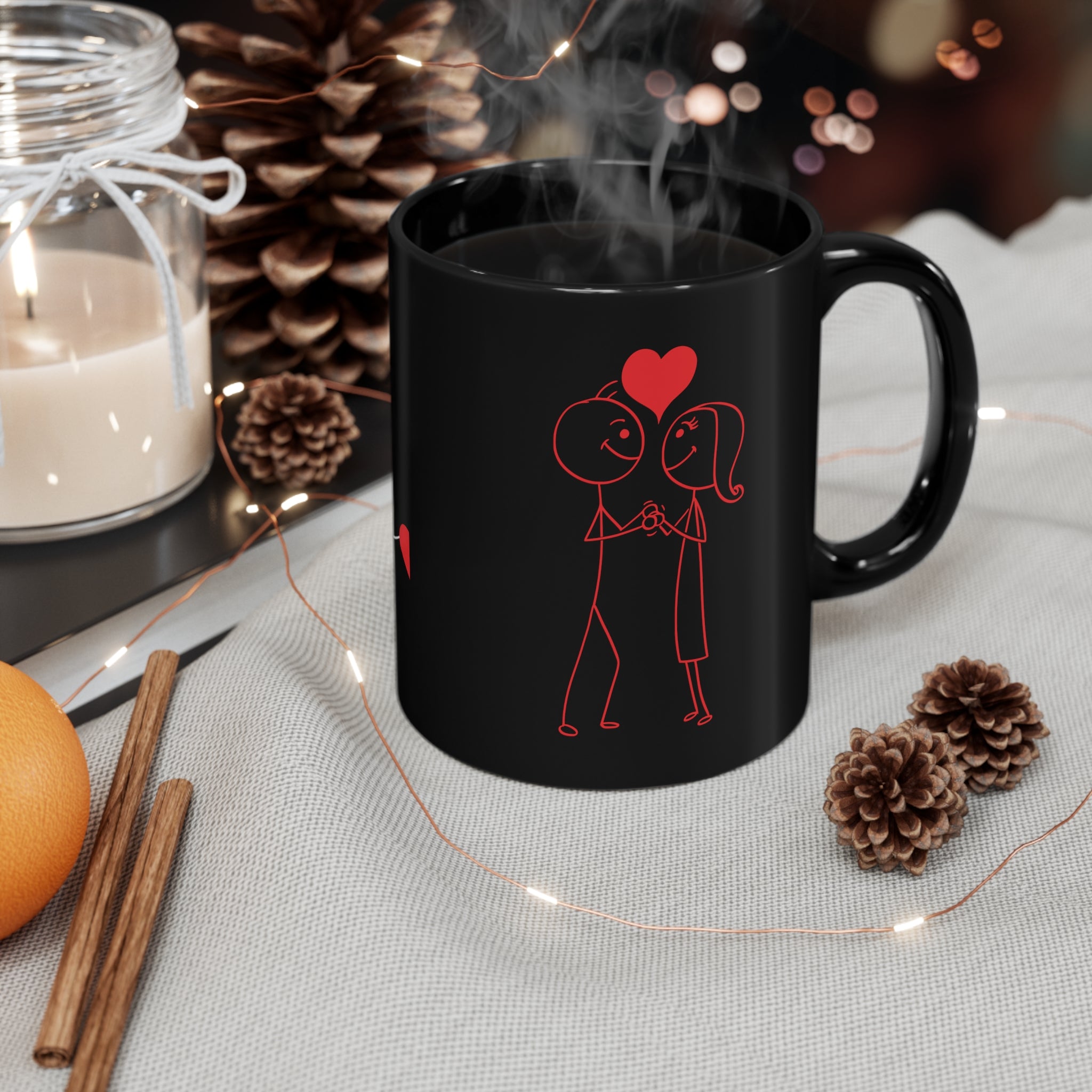 There are multiple design options available. You can choose from a simple red stick figure (possibly a man) with a small red heart on a white wavy line, a couple of red stick figures (man and woman) holding hands with a larger red heart above them, or a white stick figure with a red heart on a white string, standing with one hand on its hip. These minimalist, line – drawn stick figures and hearts bring a touch of whimsy and romance, making the mug ideal for Valentine’s Day, anniversaries, or as a festive addition to holiday decor.