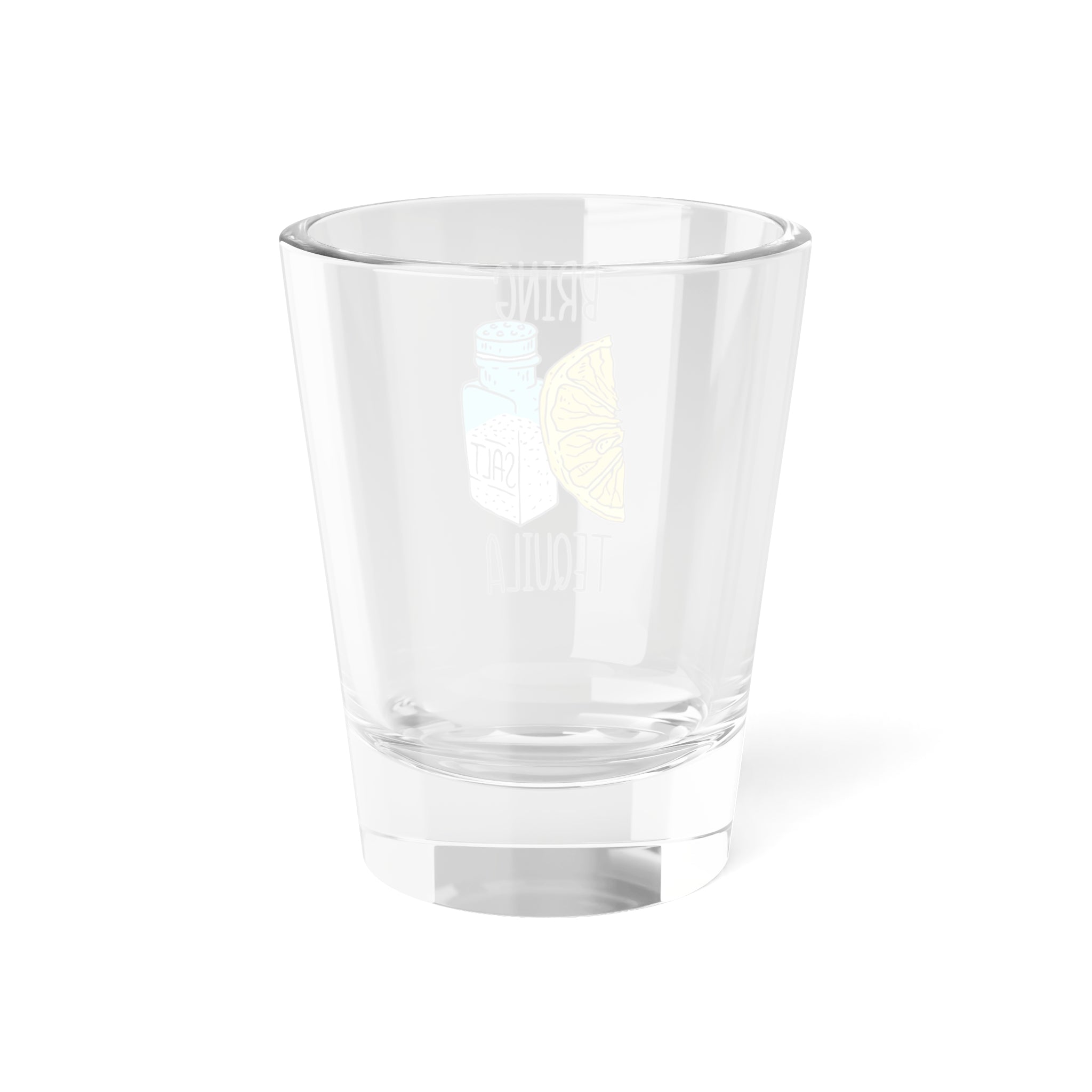 The shot glass features a playful, hand – drawn design with a salt shaker labeled “SALT”, a lemon wedge, and the text “BRING” at the top and “TEQUILA” at the bottom. The primary colors of black, blue, yellow, white, and clear create a vibrant and eye – catching look. The design is printed on the exterior glass surface, with a crisp and long – lasting finish that can withstand potential dishwasher use.