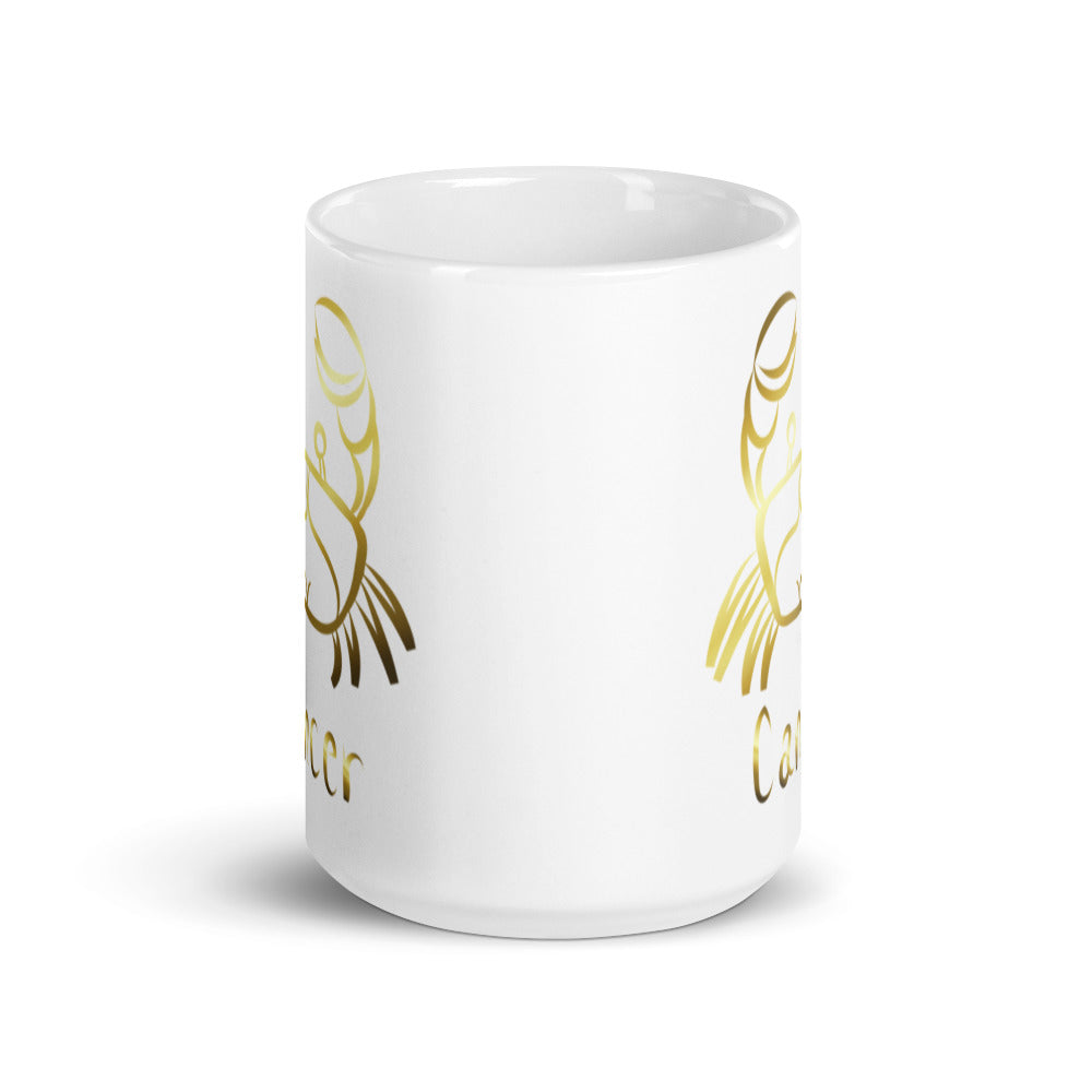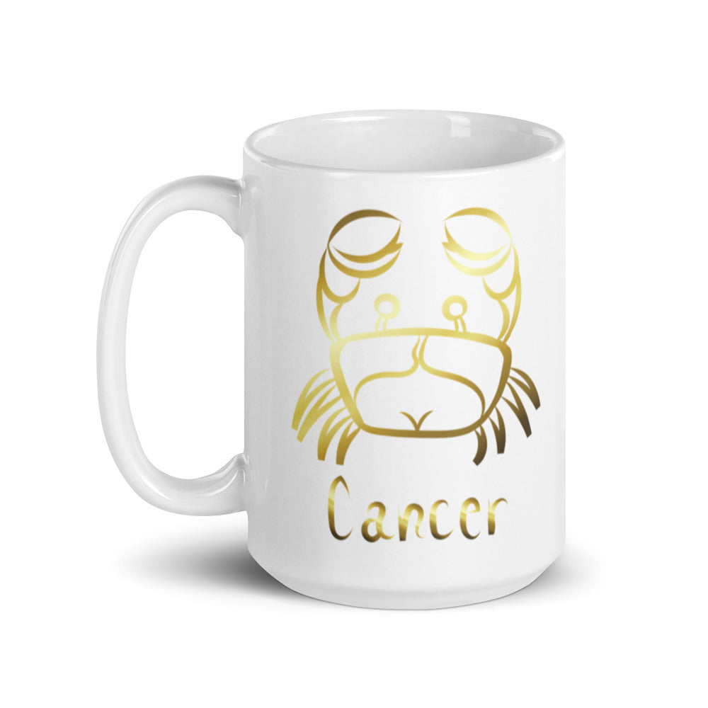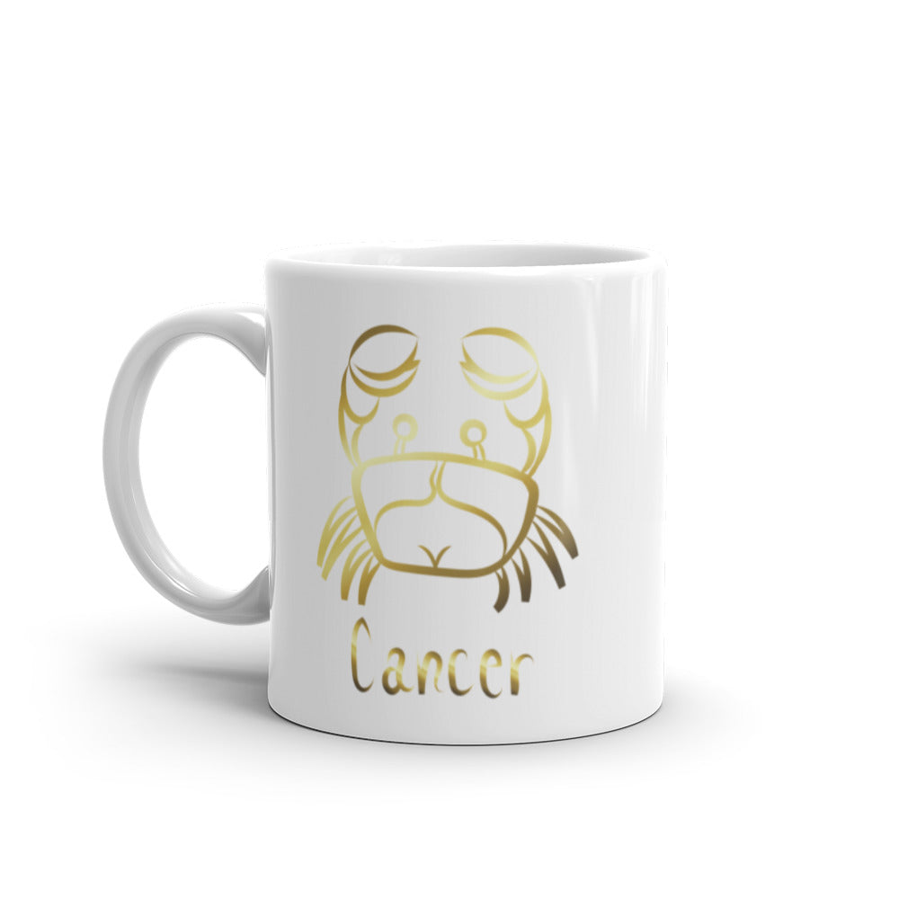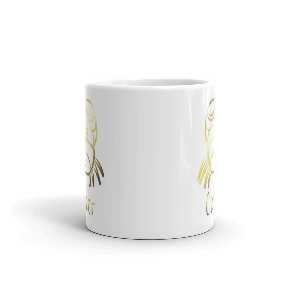 - Design: Golden foil crab illustration (Cancer symbol) and “Cancer” text, wrapped around the mug