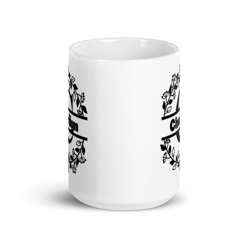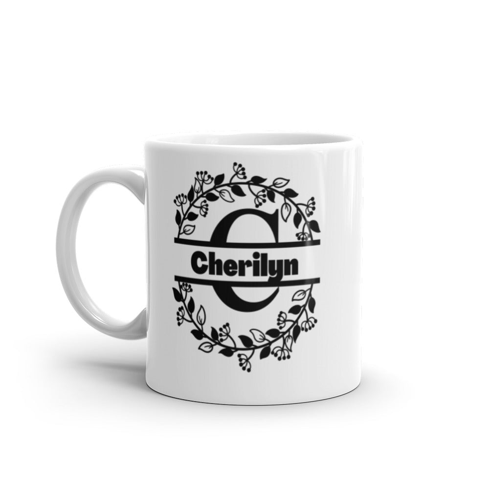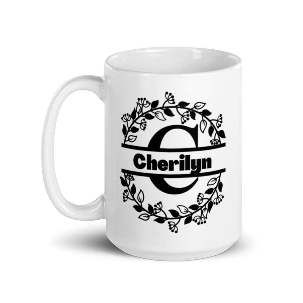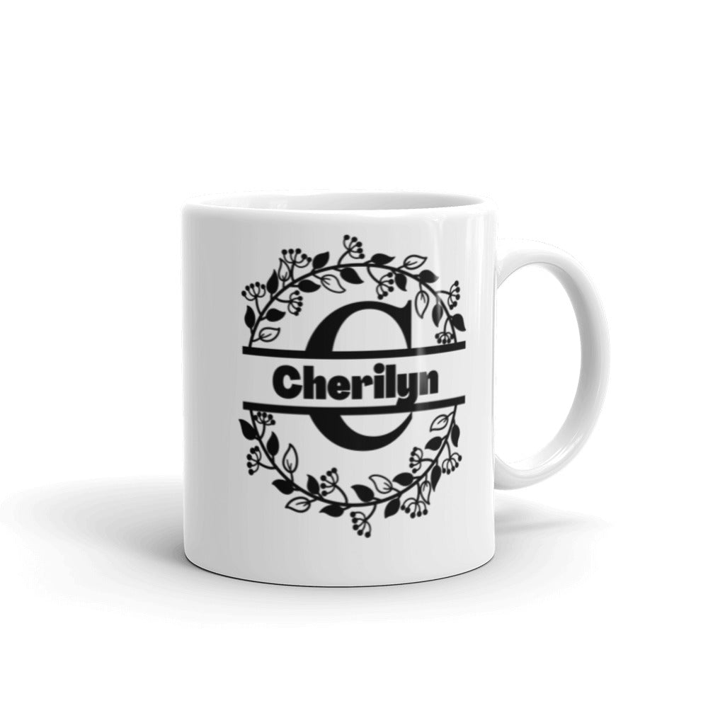 - Design: Personalized with a large black monogram ‘C’, the name ‘Cherilyn’ in bold black sans – serif text, and a circular floral wreath