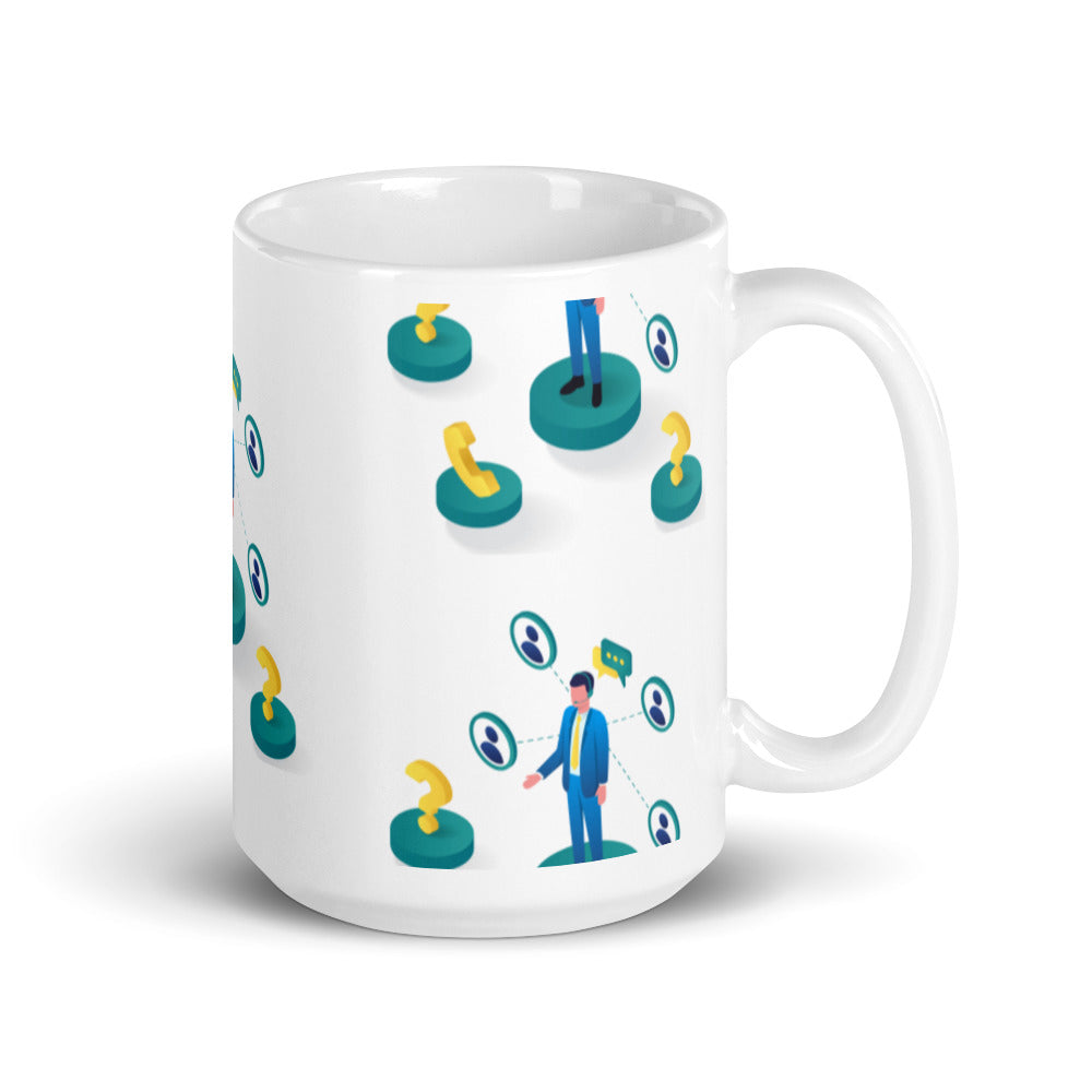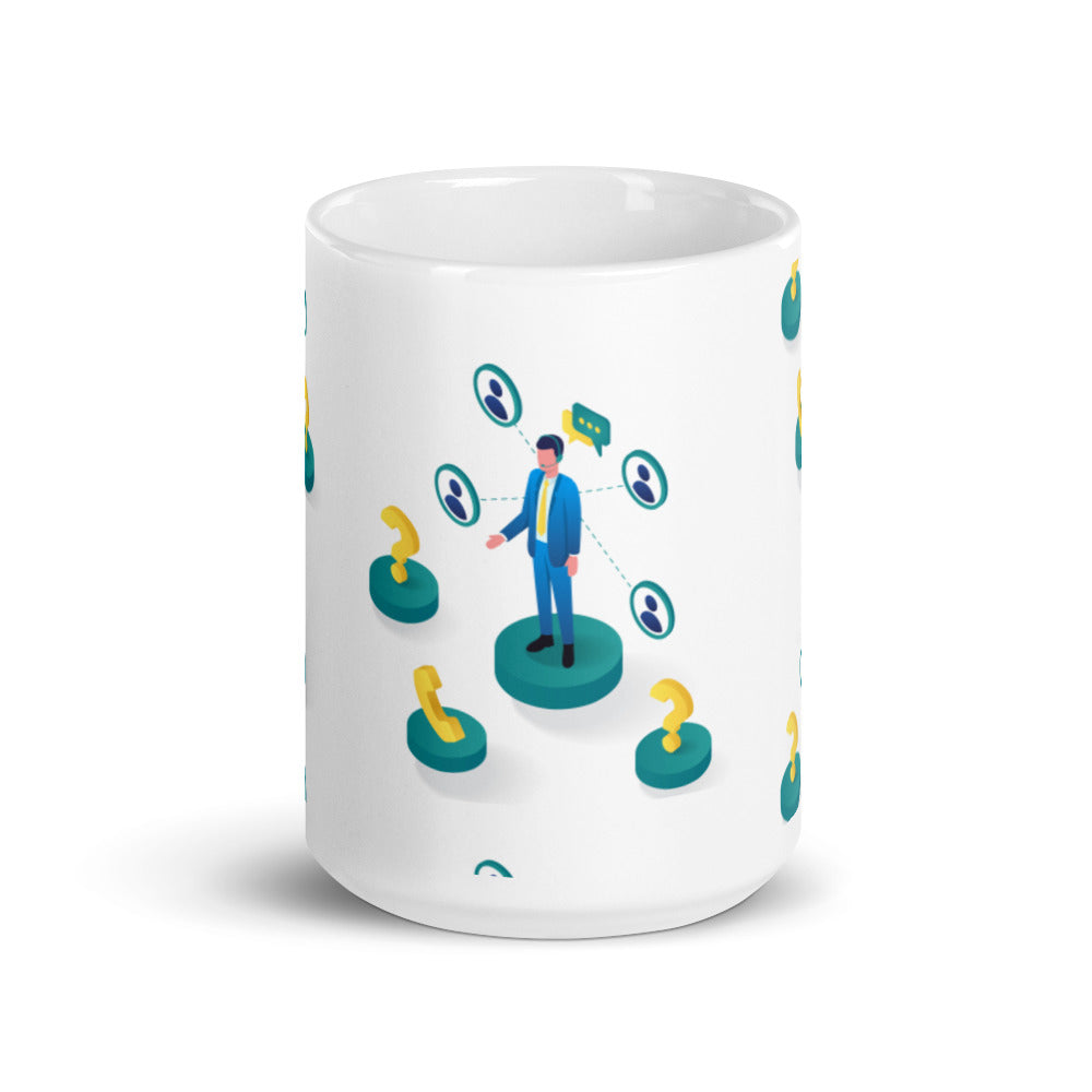 - Design: Repeating isometric illustration pattern with professional figures, circular platforms, question – mark/telephone icons, and user – circle icons