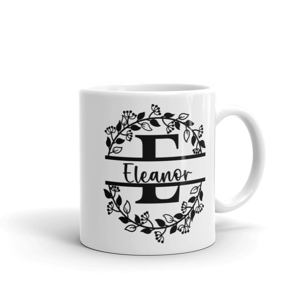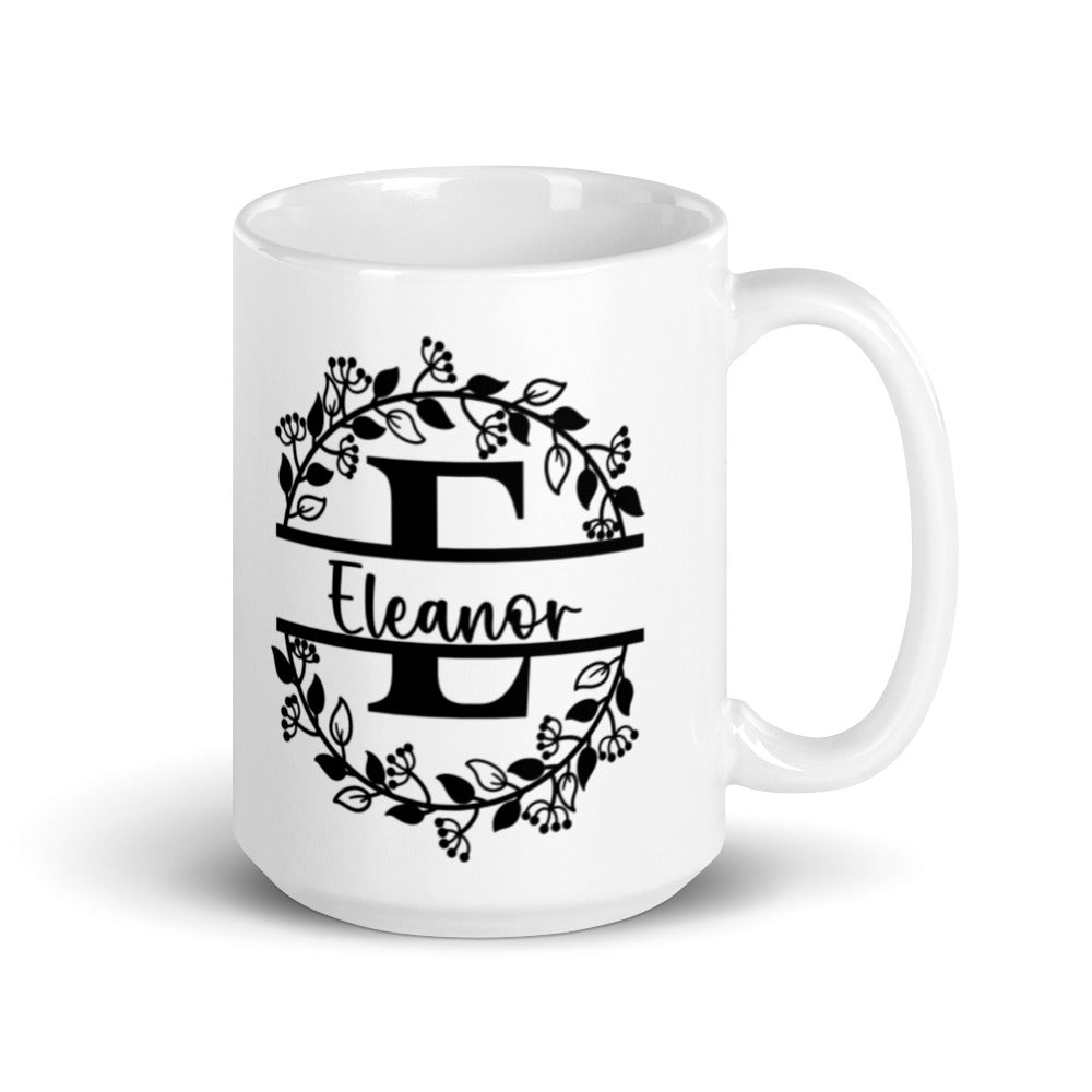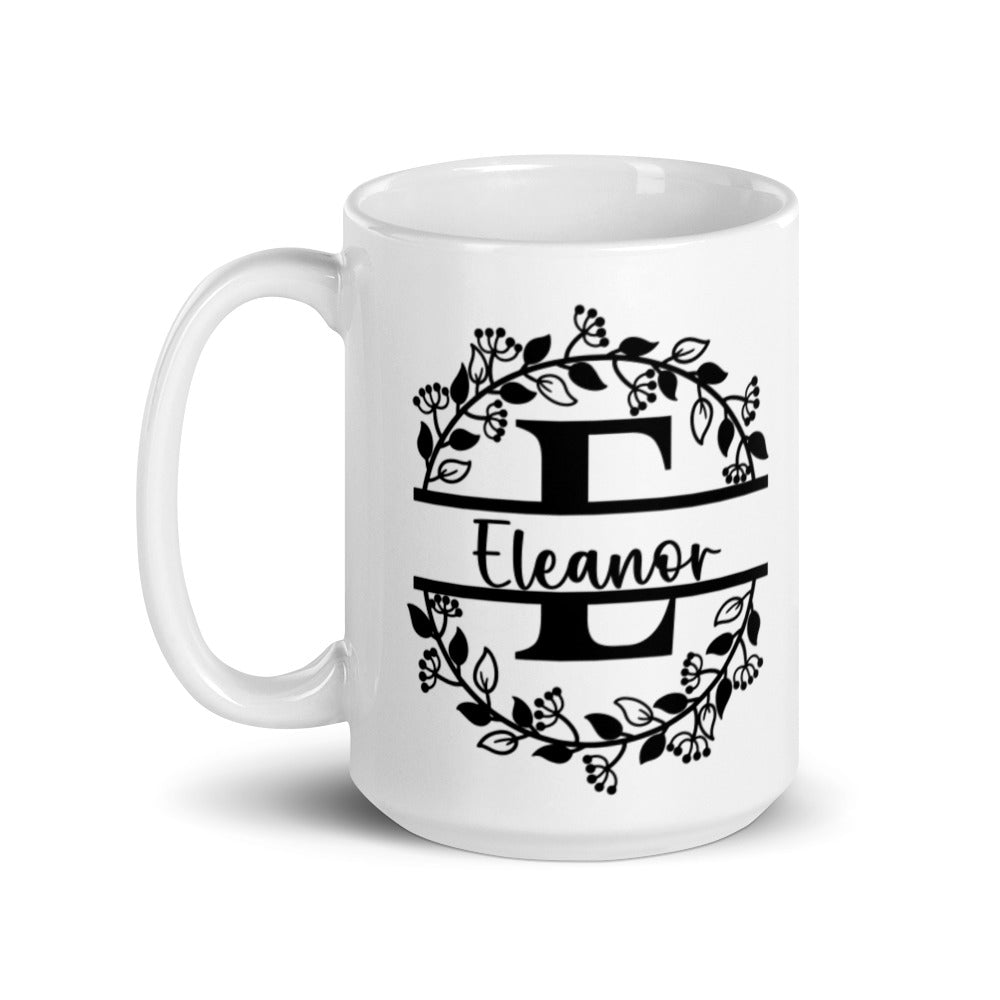 - Design: A symmetrical floral wreath with a monogrammed ‘E’ and the name ‘Eleanor’ in cursive, framed by two horizontal black lines