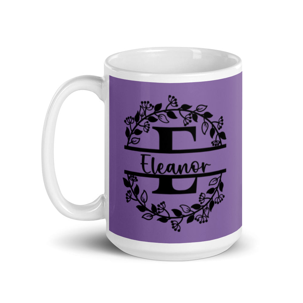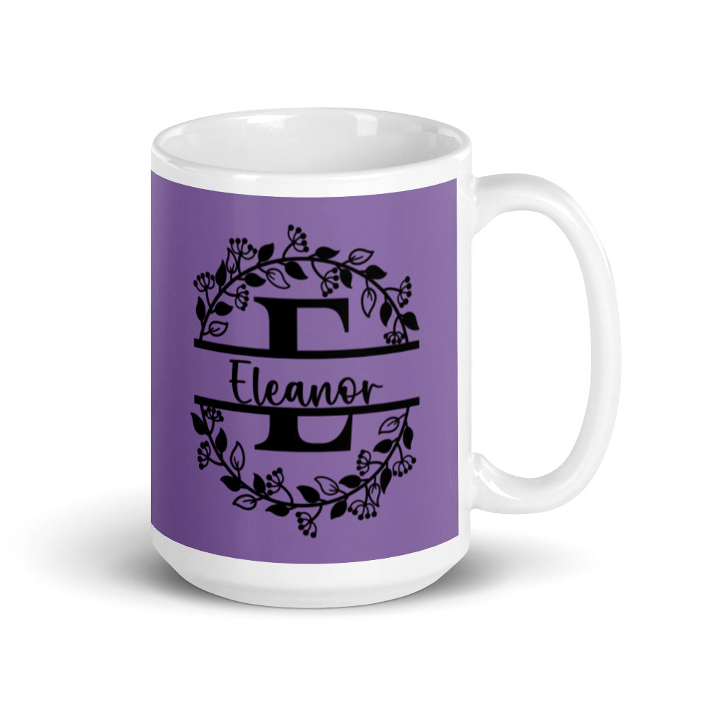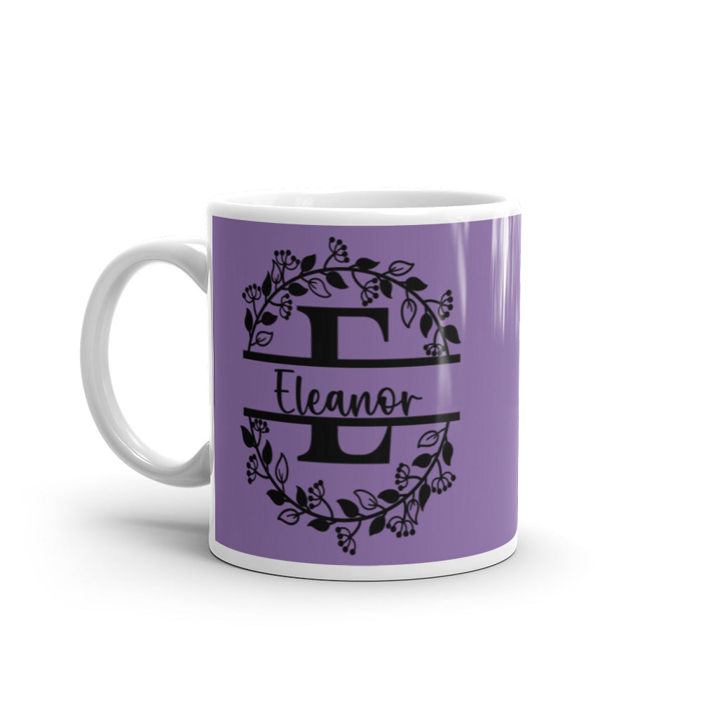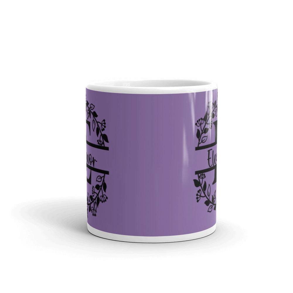 - Design: Personalized with a black monogram, handwritten name, and floral wreath on a purple exterior with a white interior and handle