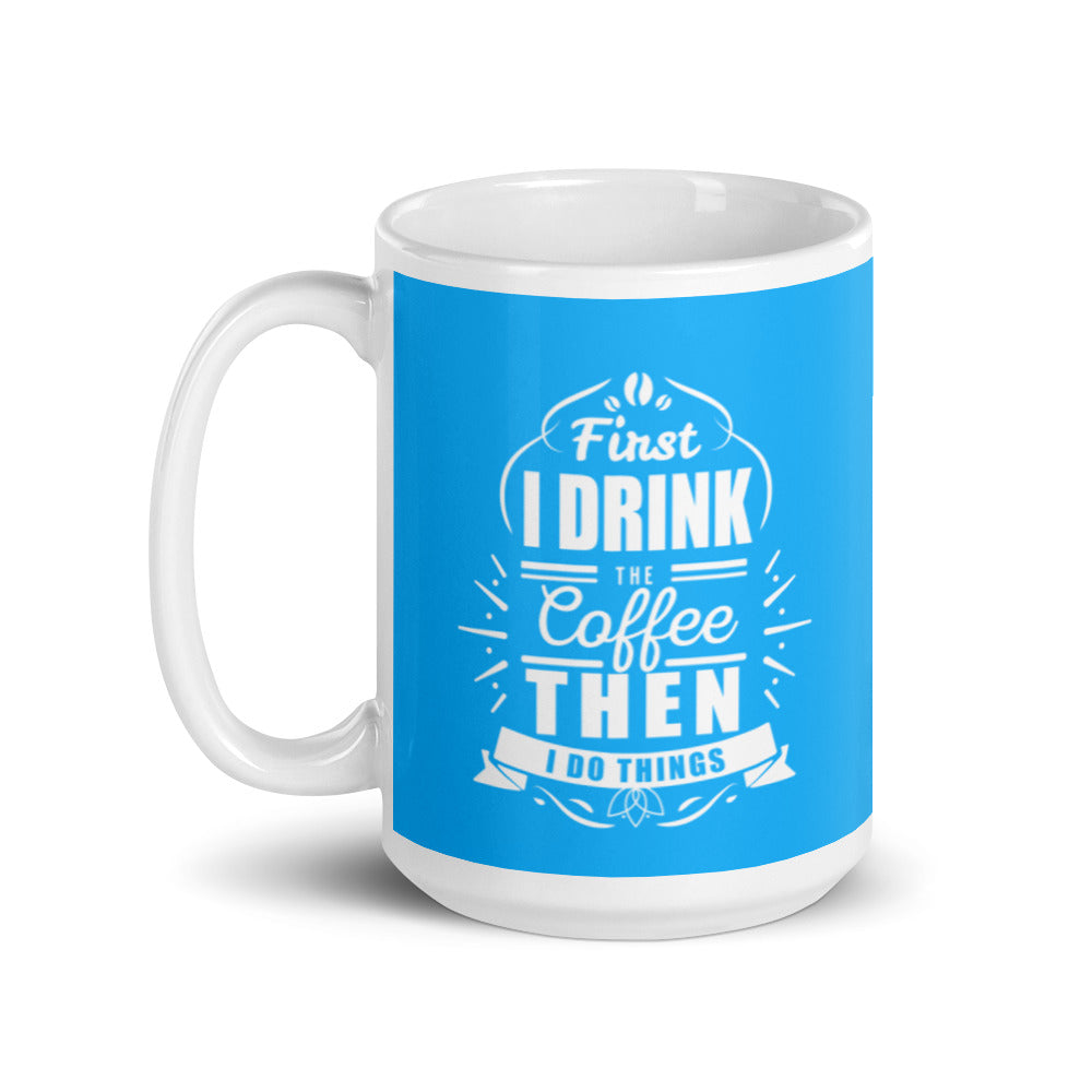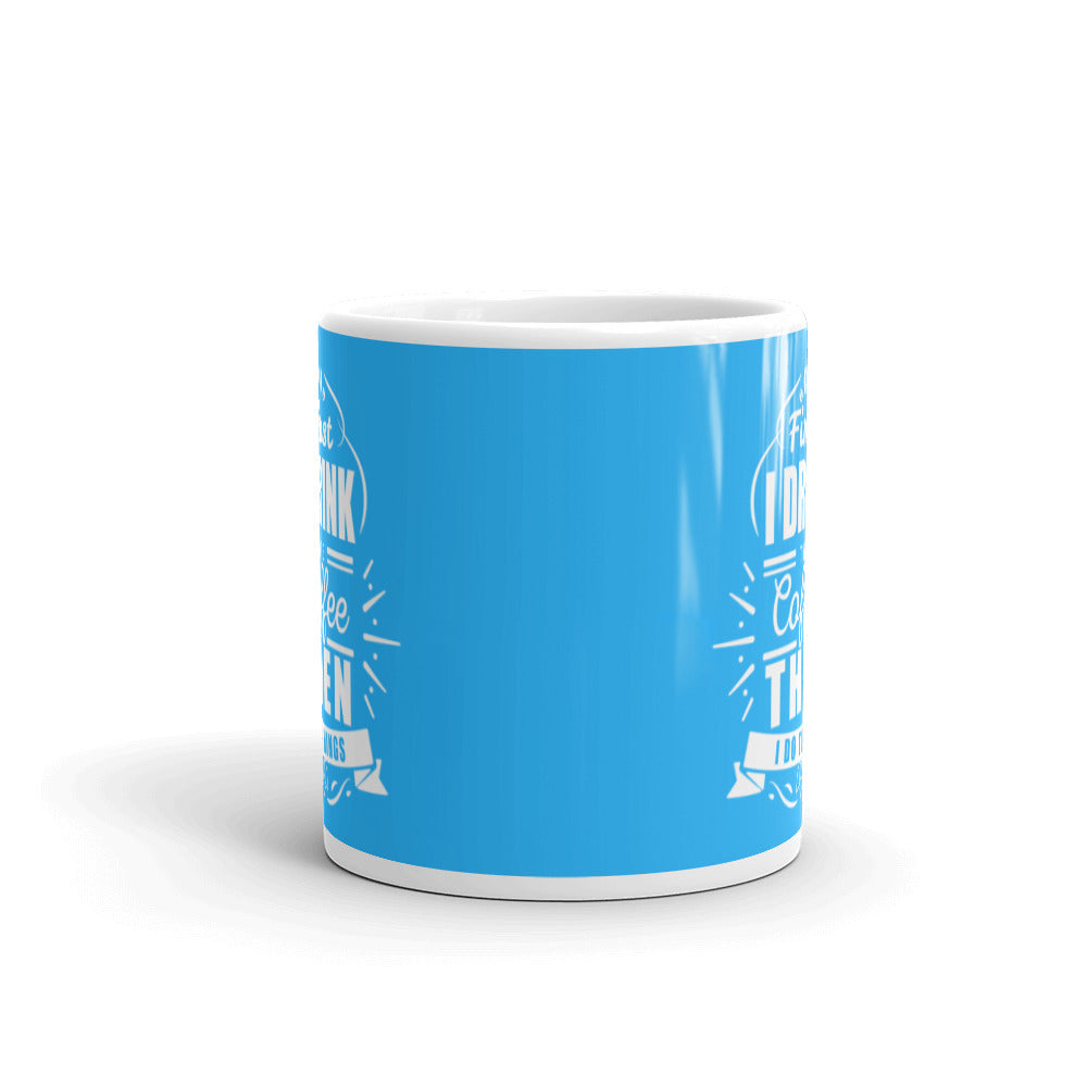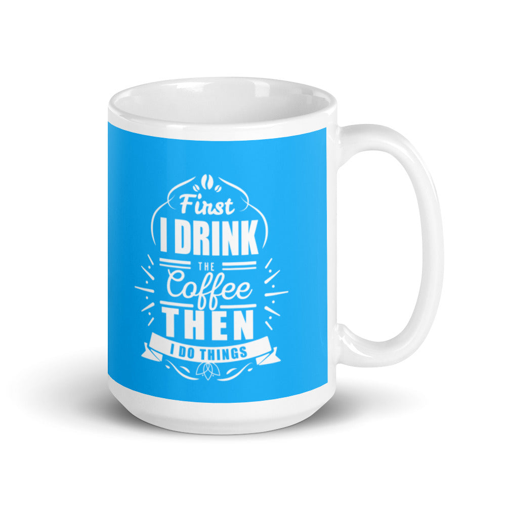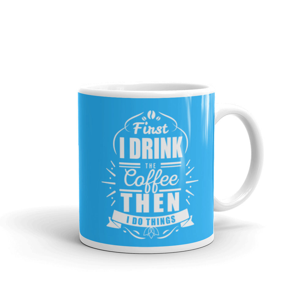 - Design: Humorous coffee – themed message with decorative elements in white on a blue background