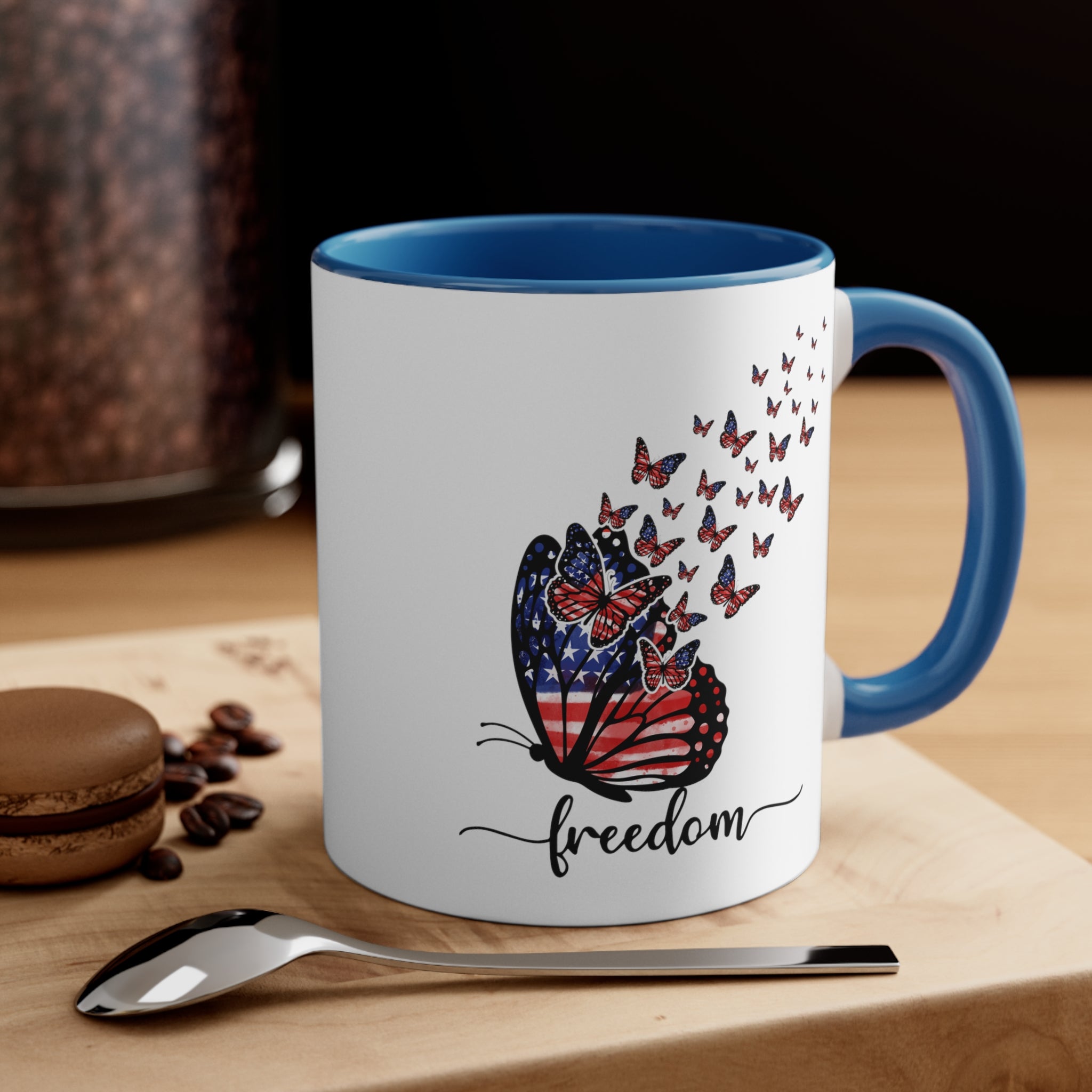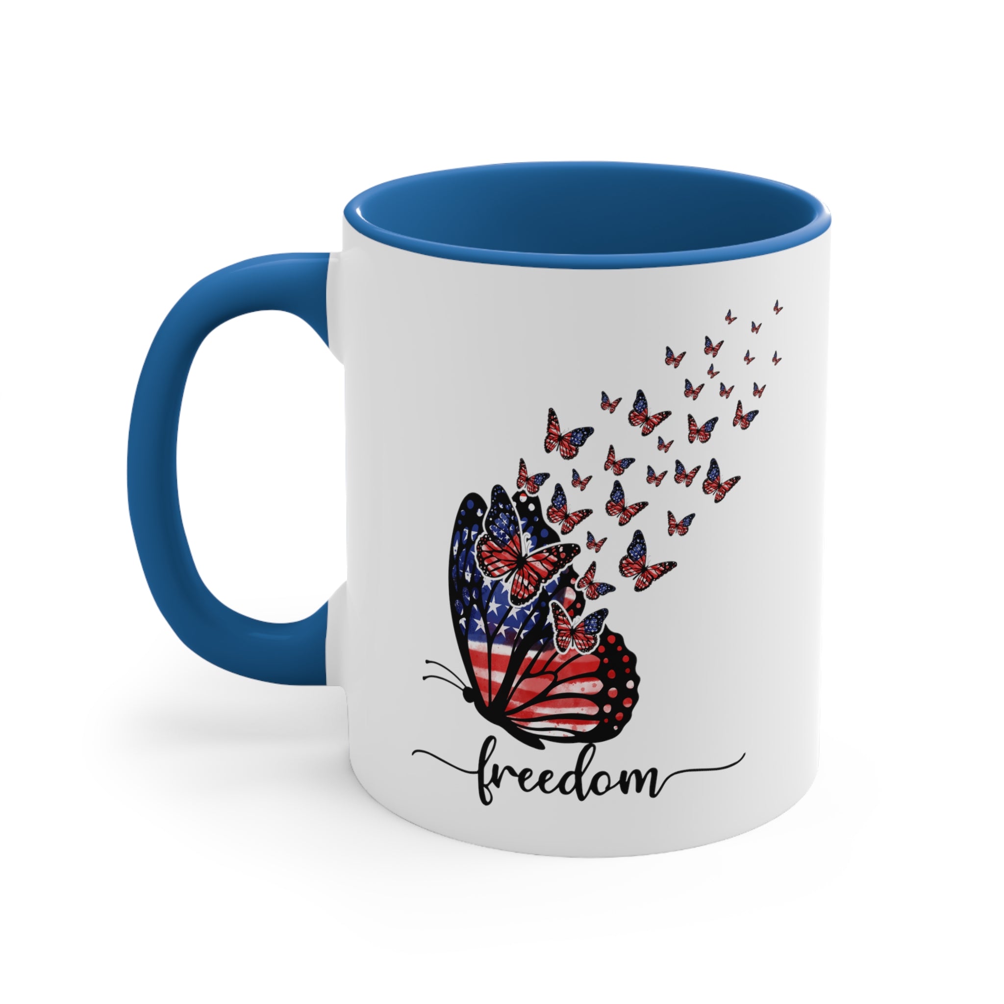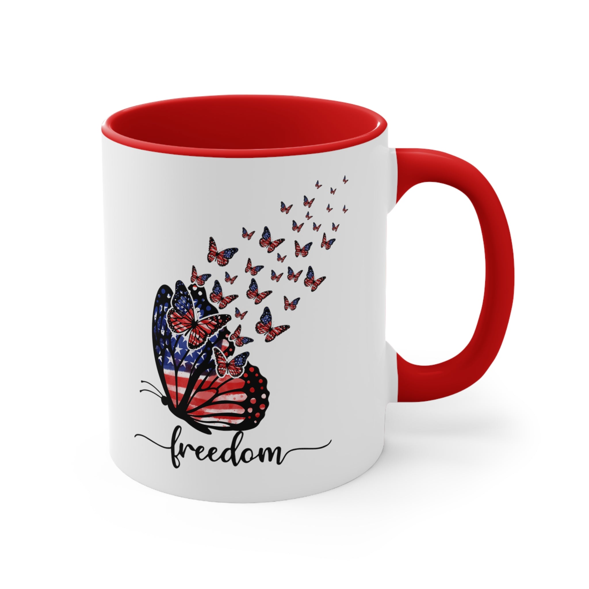 Introducing the Freedom Accent Coffee Mug, a 11oz ceramic masterpiece that combines functionality with a touch of patriotism. This mug is not just a vessel for your favorite hot or cold beverages; it’s a statement piece that celebrates freedom and national pride.