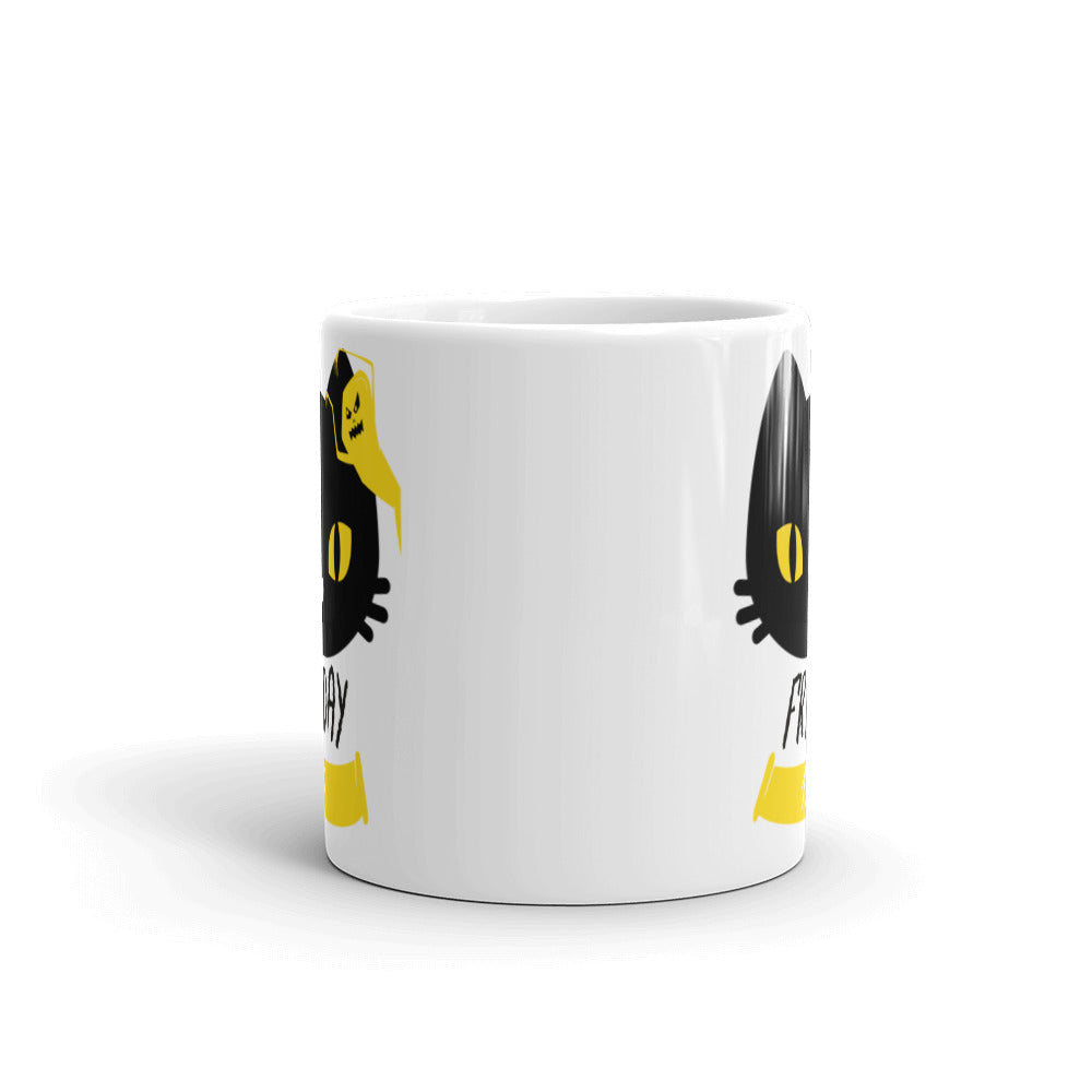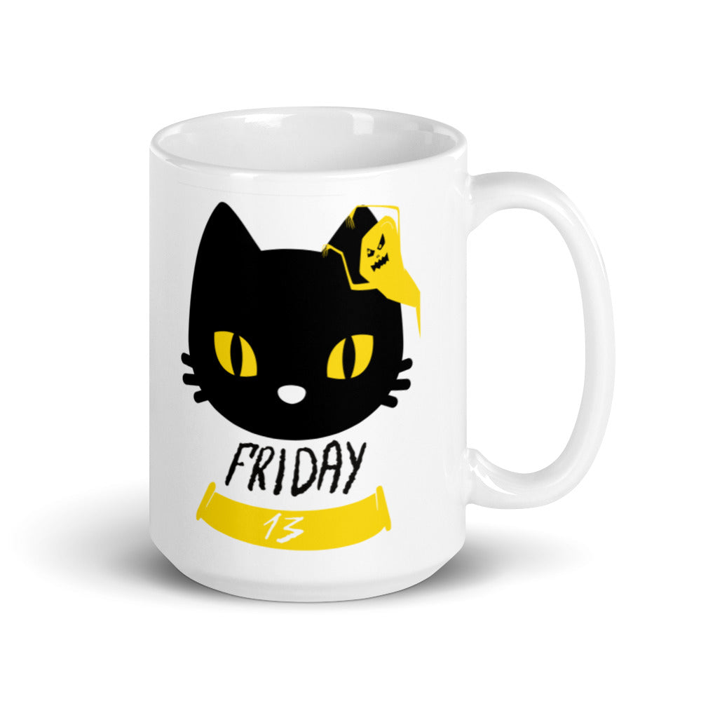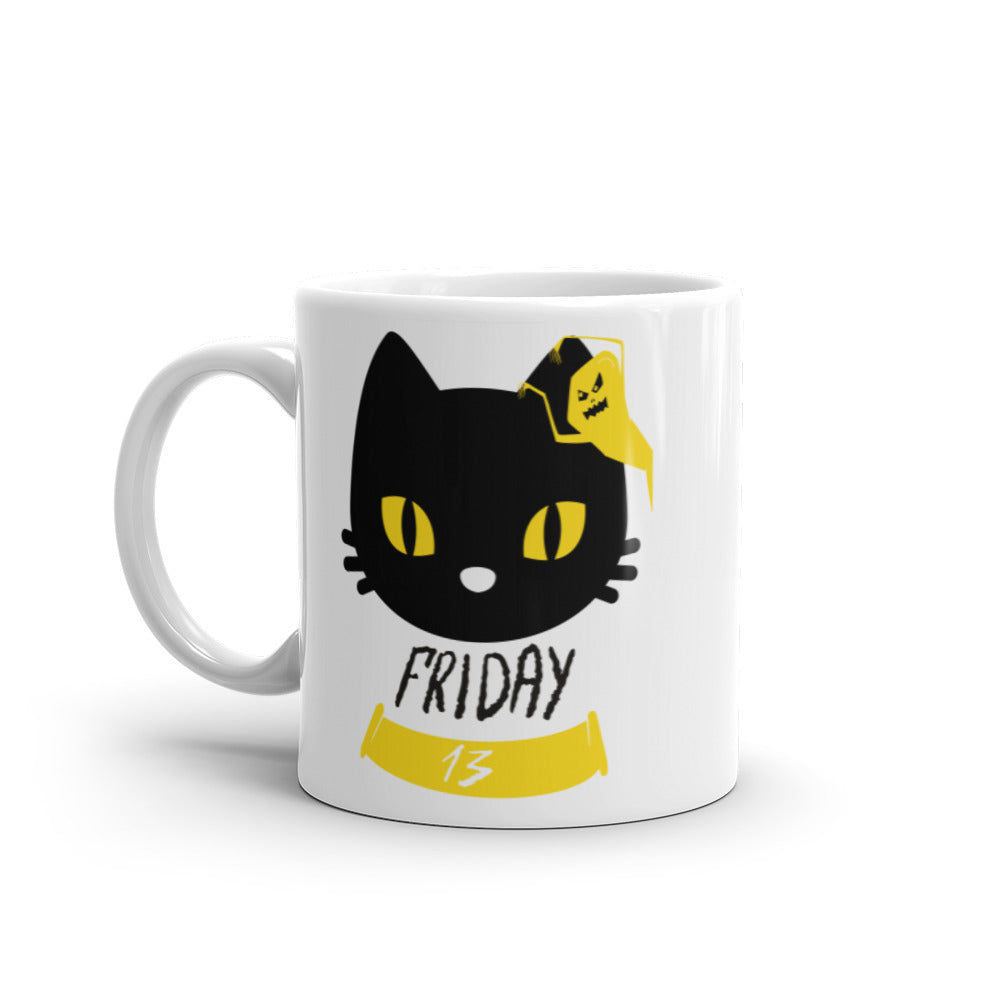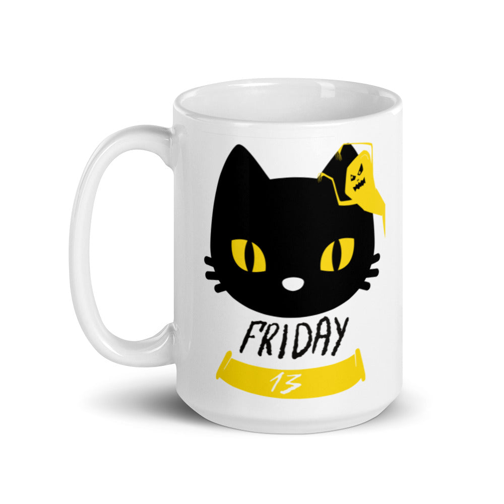 - Design: Features a black cat, yellow ghost, and bold text on a white glossy surface