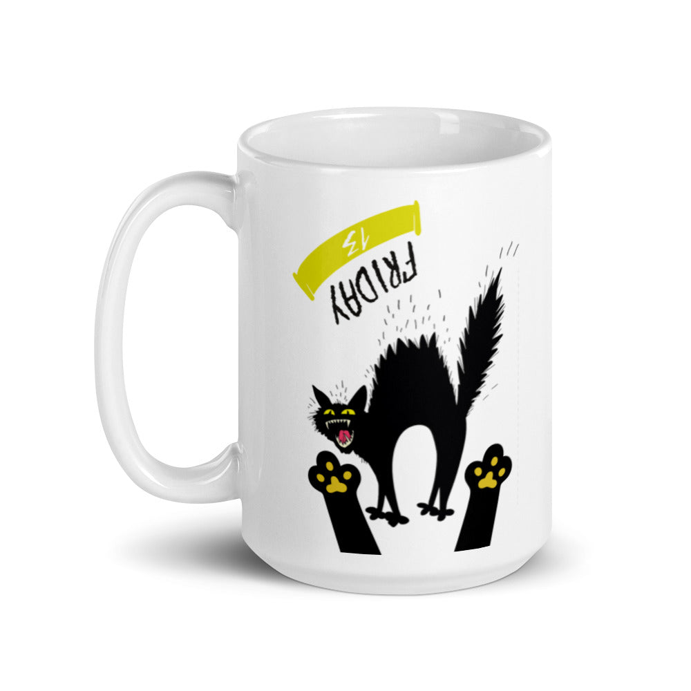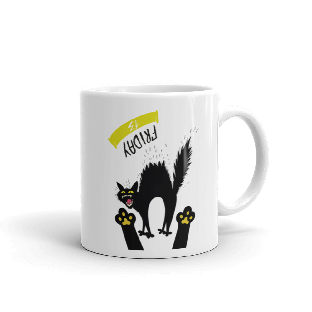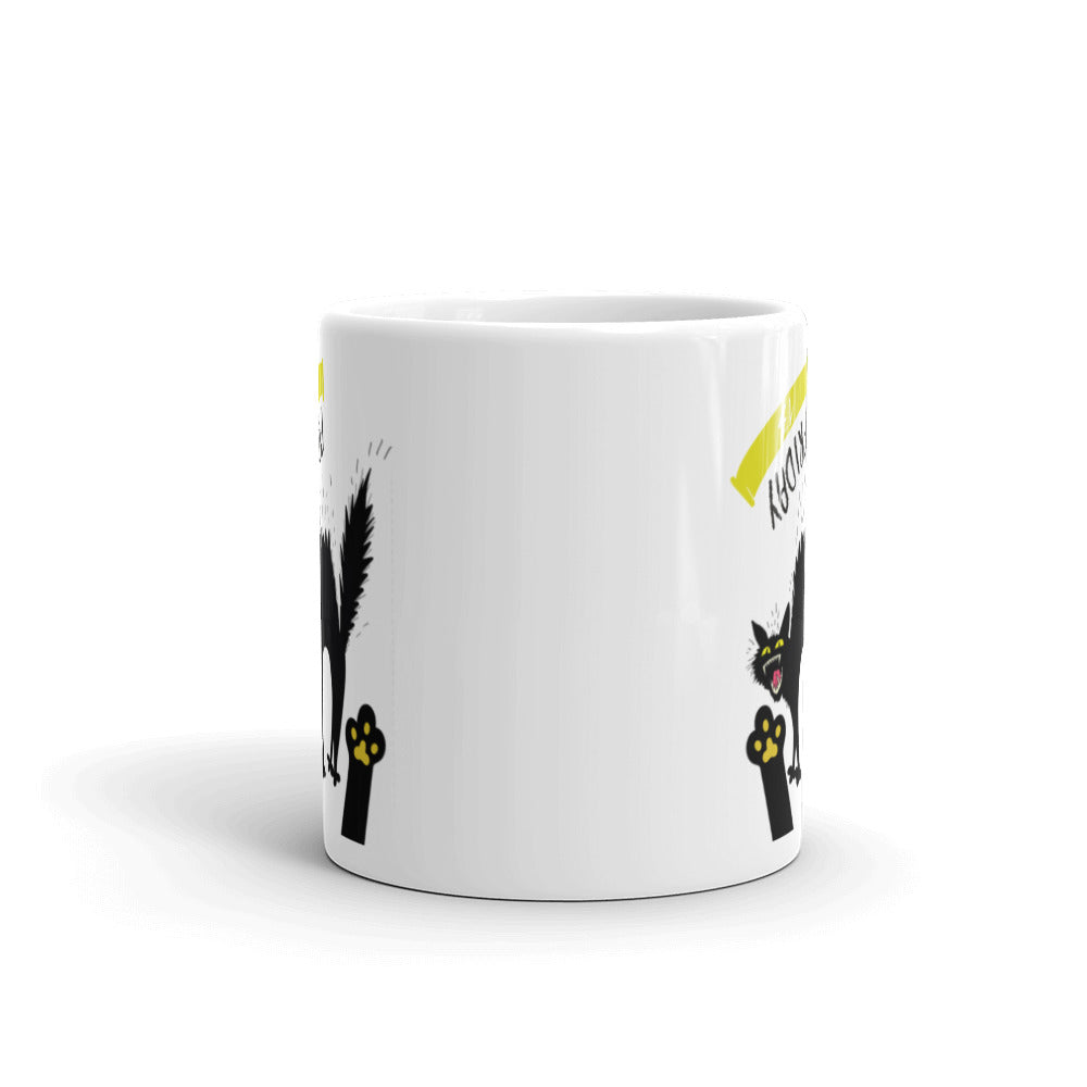- Design: A stylized black cat with spiky fur, arched back, yellow eyes, red tongue, a yellow curved banner with black text, and two black paw shapes with yellow paw pads