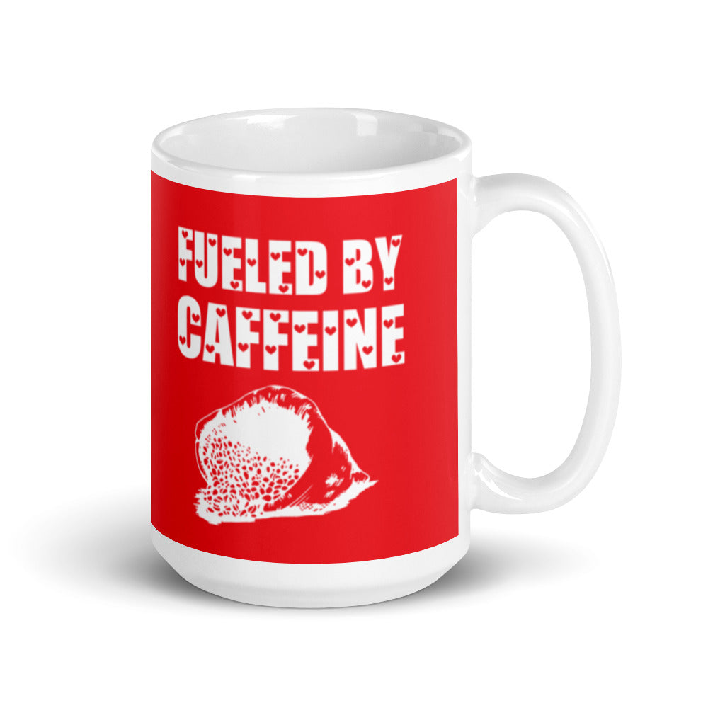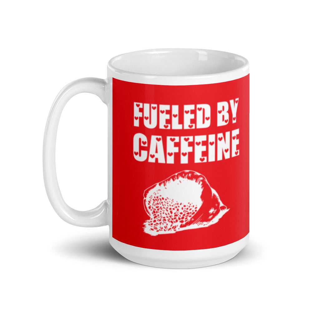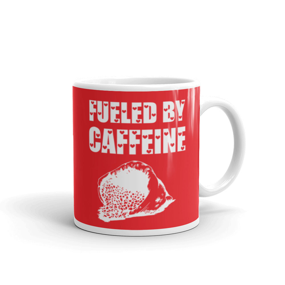 - Design: Bold white text ‘FUELLED BY CAFFEINE’ with red heart motifs, a white coffee cup graphic