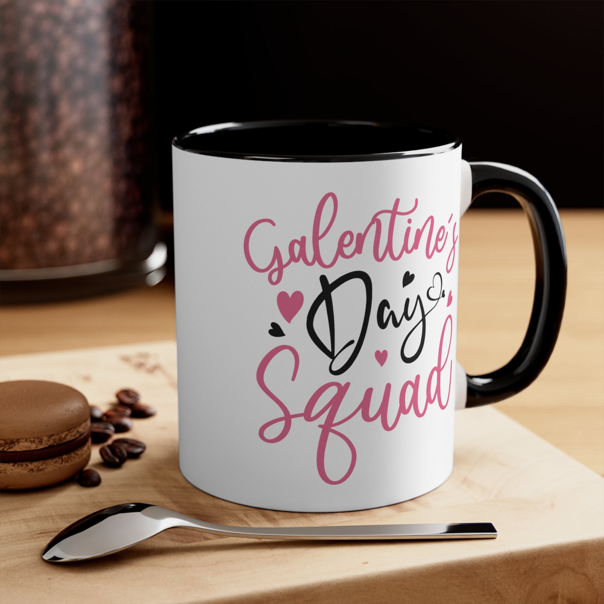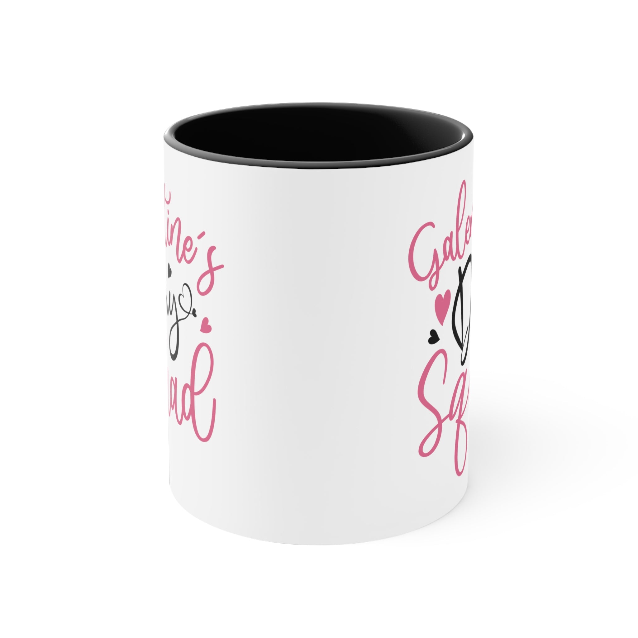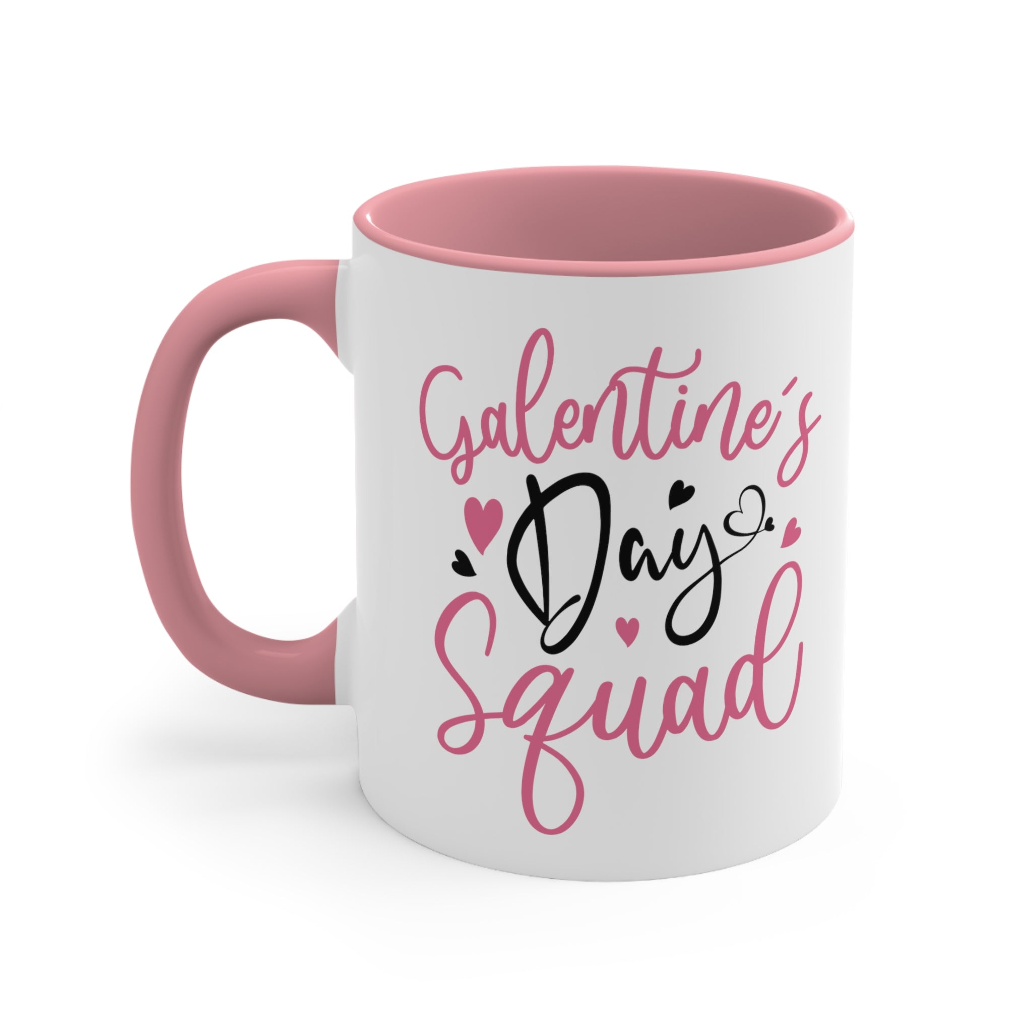 The decorative text on the mug is a highlight. “Galentine’s” and “Squad” are written in a light pink/coral script font, while “Day” is in bold black cursive with a heart integrated into the letter “y”. Surrounding the text are small hearts – one large pink heart and three smaller hearts in pink or black, adding a playful and festive touch without cluttering the design.