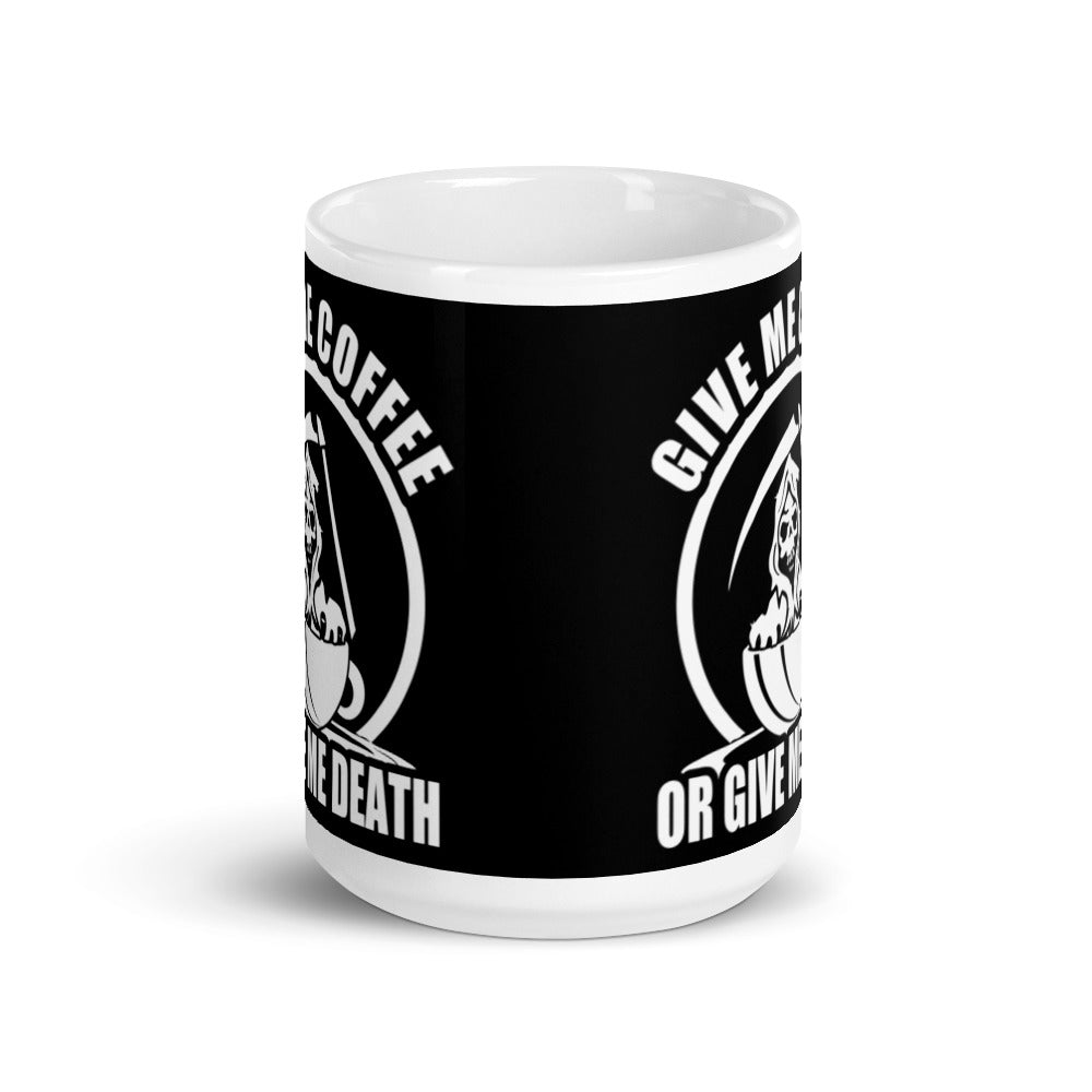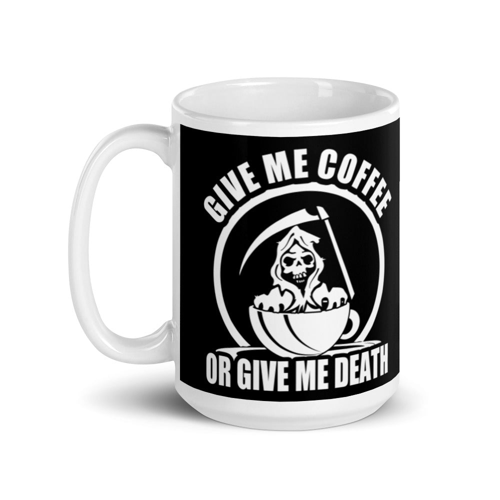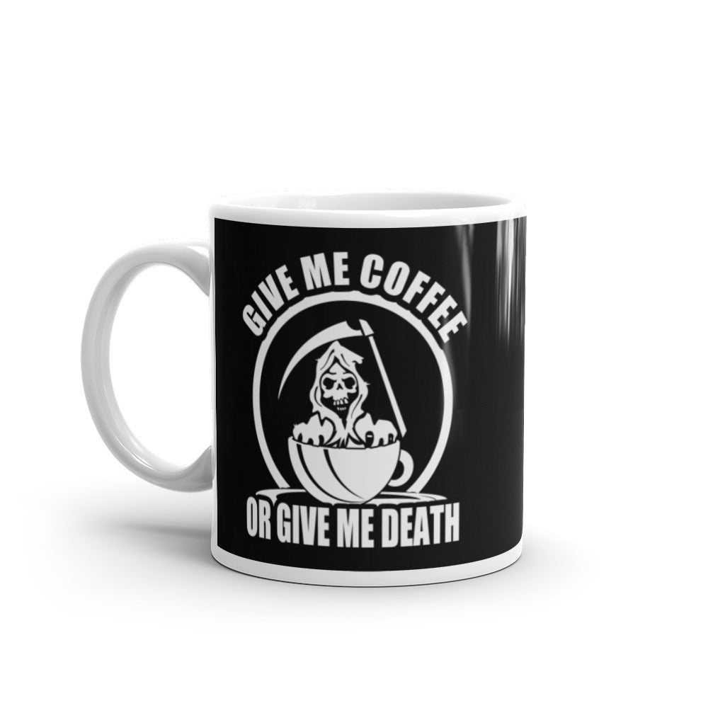 - Design: A humorous graphic with a Grim Reaper in a coffee cup and bold text