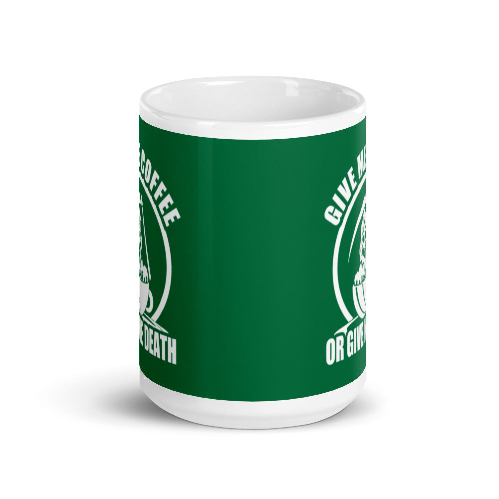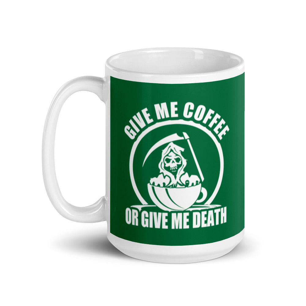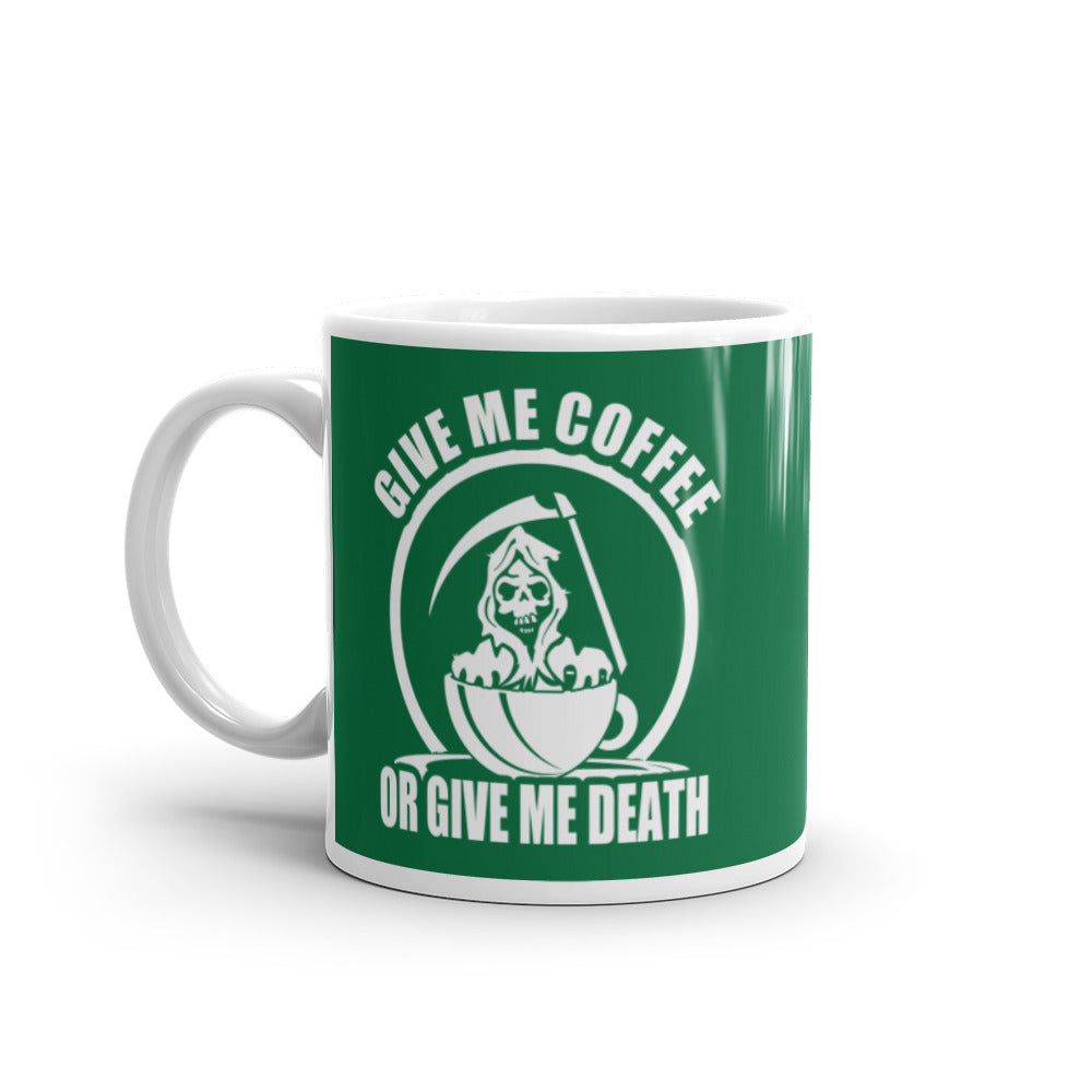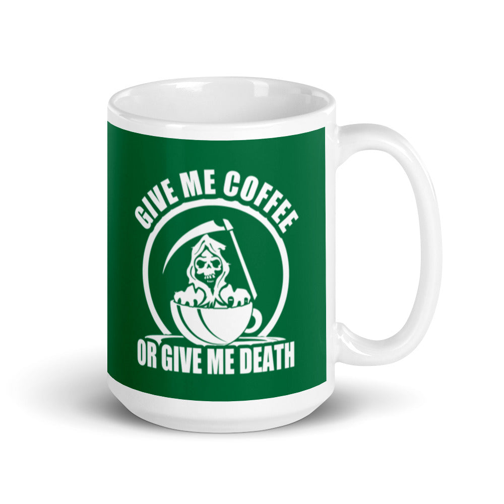 - Design: A bold white graphic of a skull – faced figure in a coffee cup with the text “GIVE ME COFFEE” and “OR GIVE ME DEATH” on a dark green exterior
