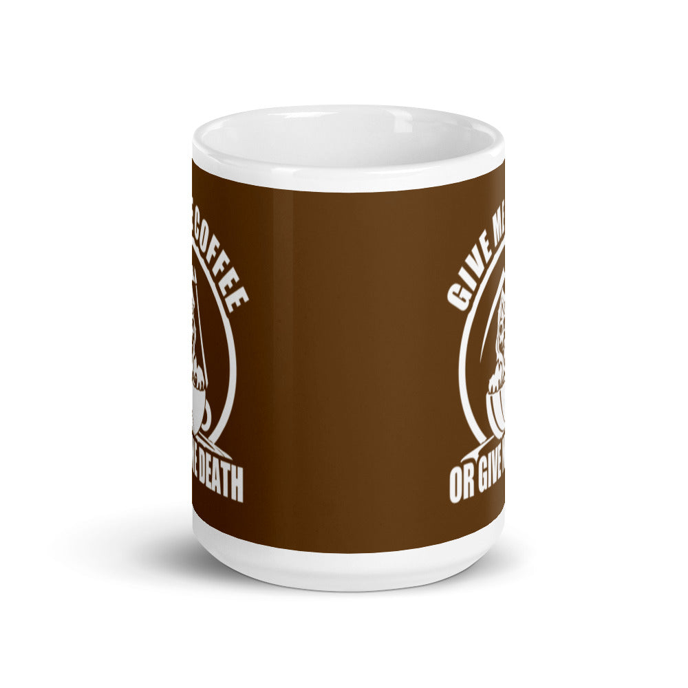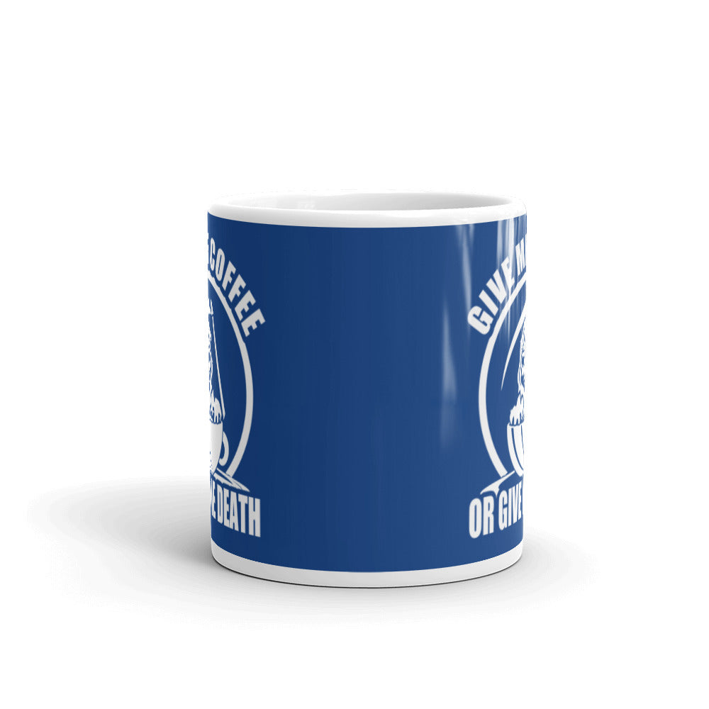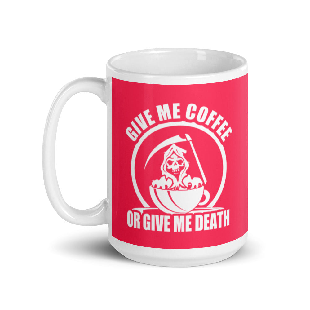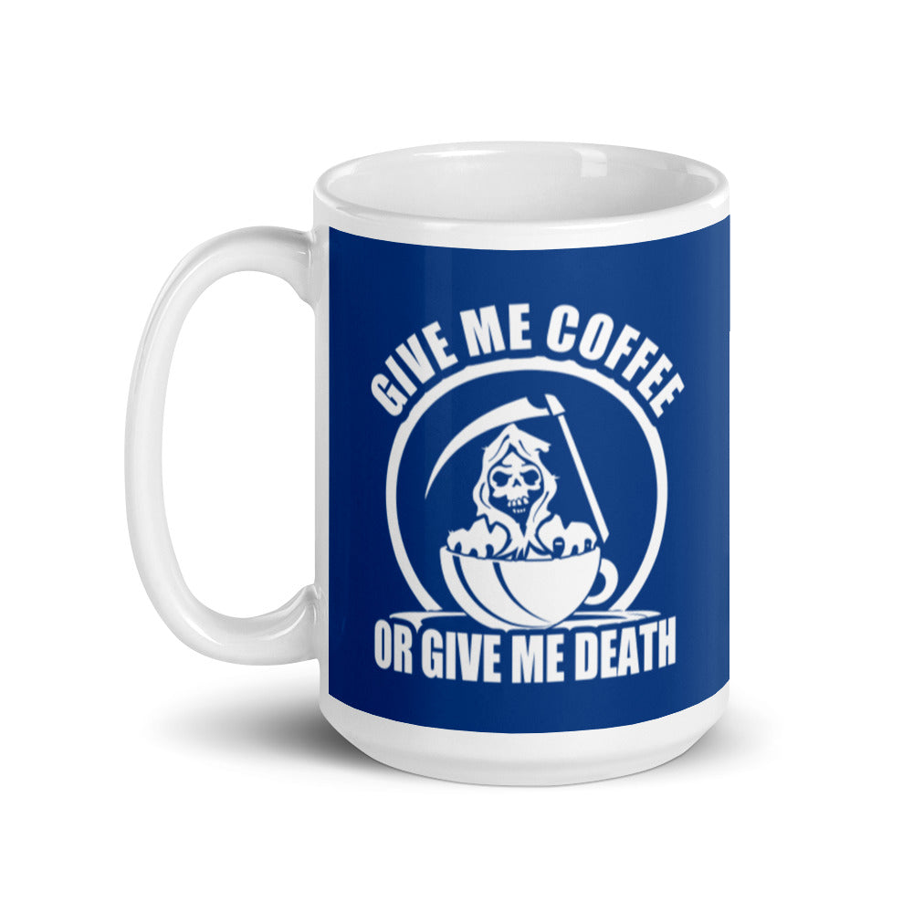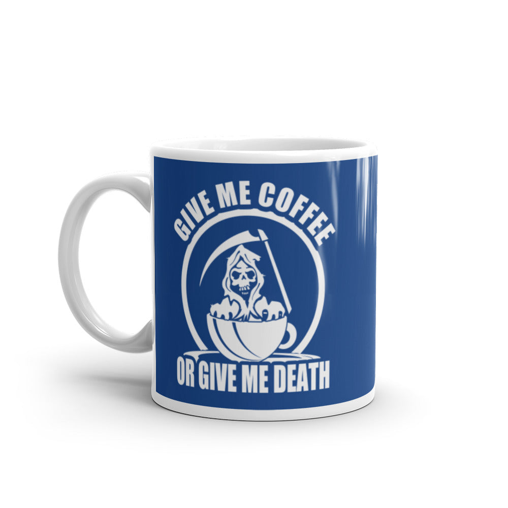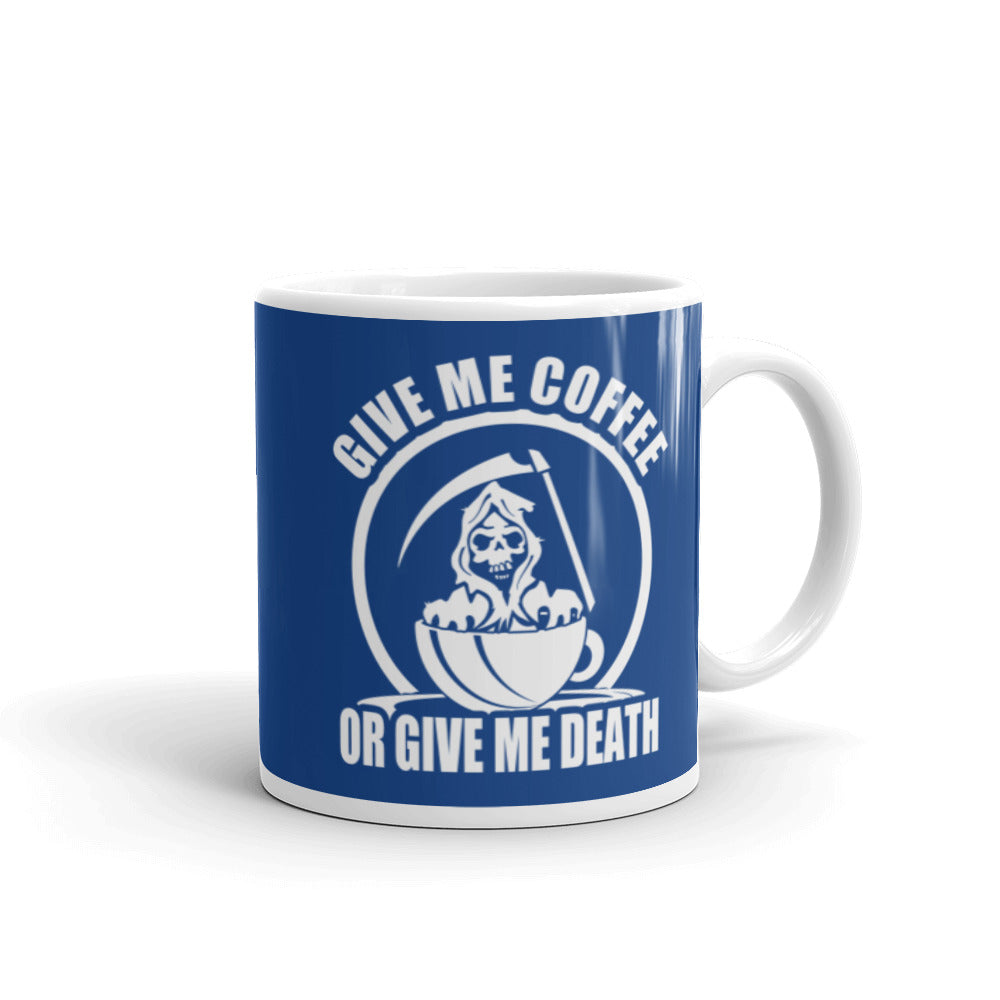 - Design: Features a humorous graphic of a Grim Reaper in a coffee cup with bold text