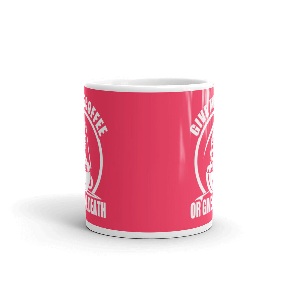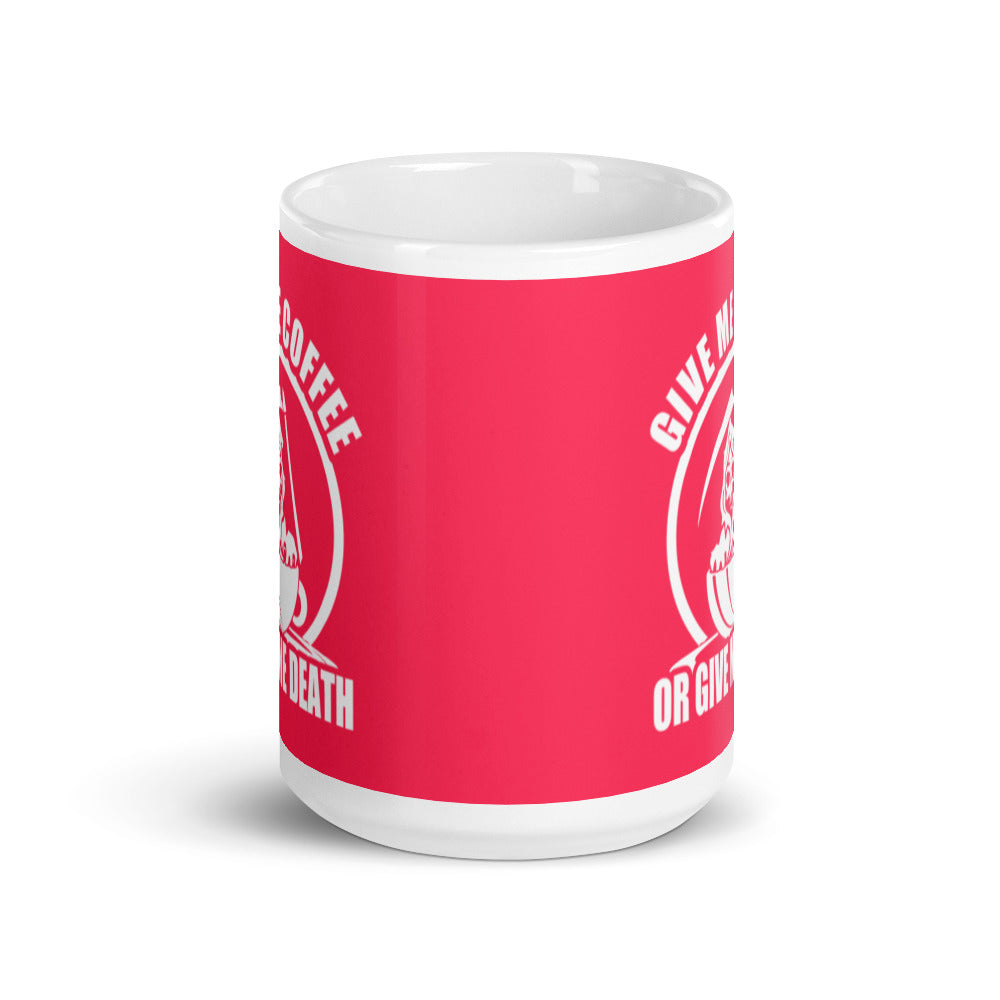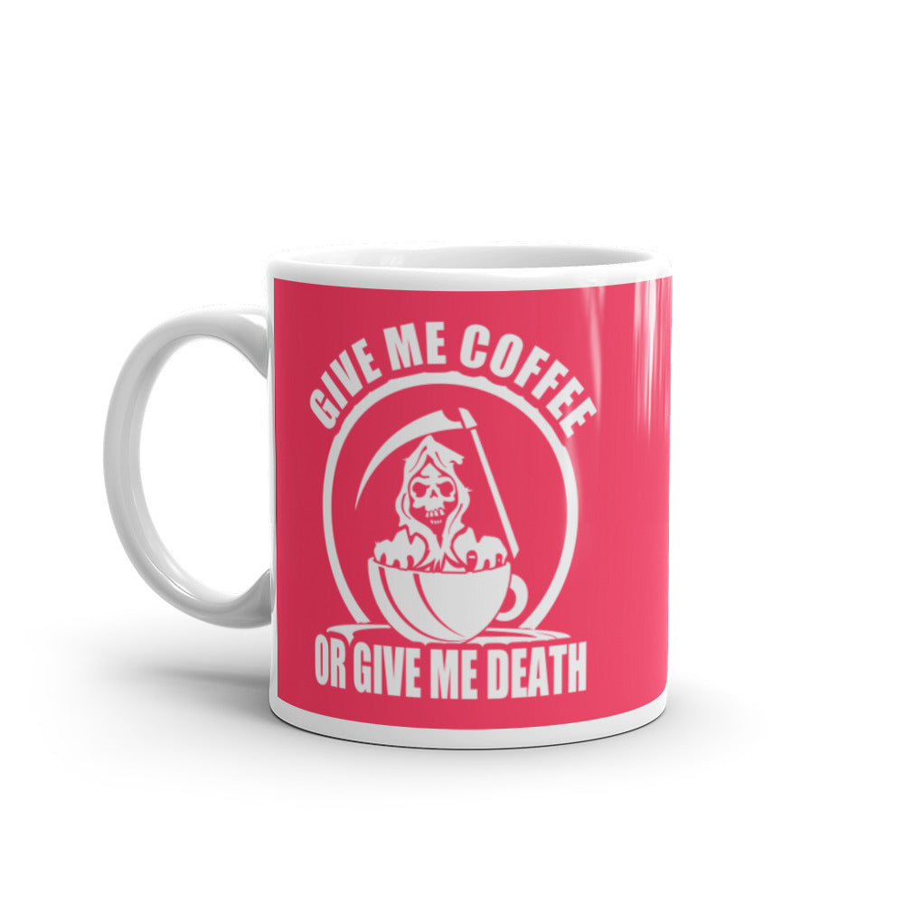 - Design: Vibrant red background with a white graphic of a Grim Reaper in a coffee cup and the text “GIVE ME COFFEE OR GIVE ME DEATH”