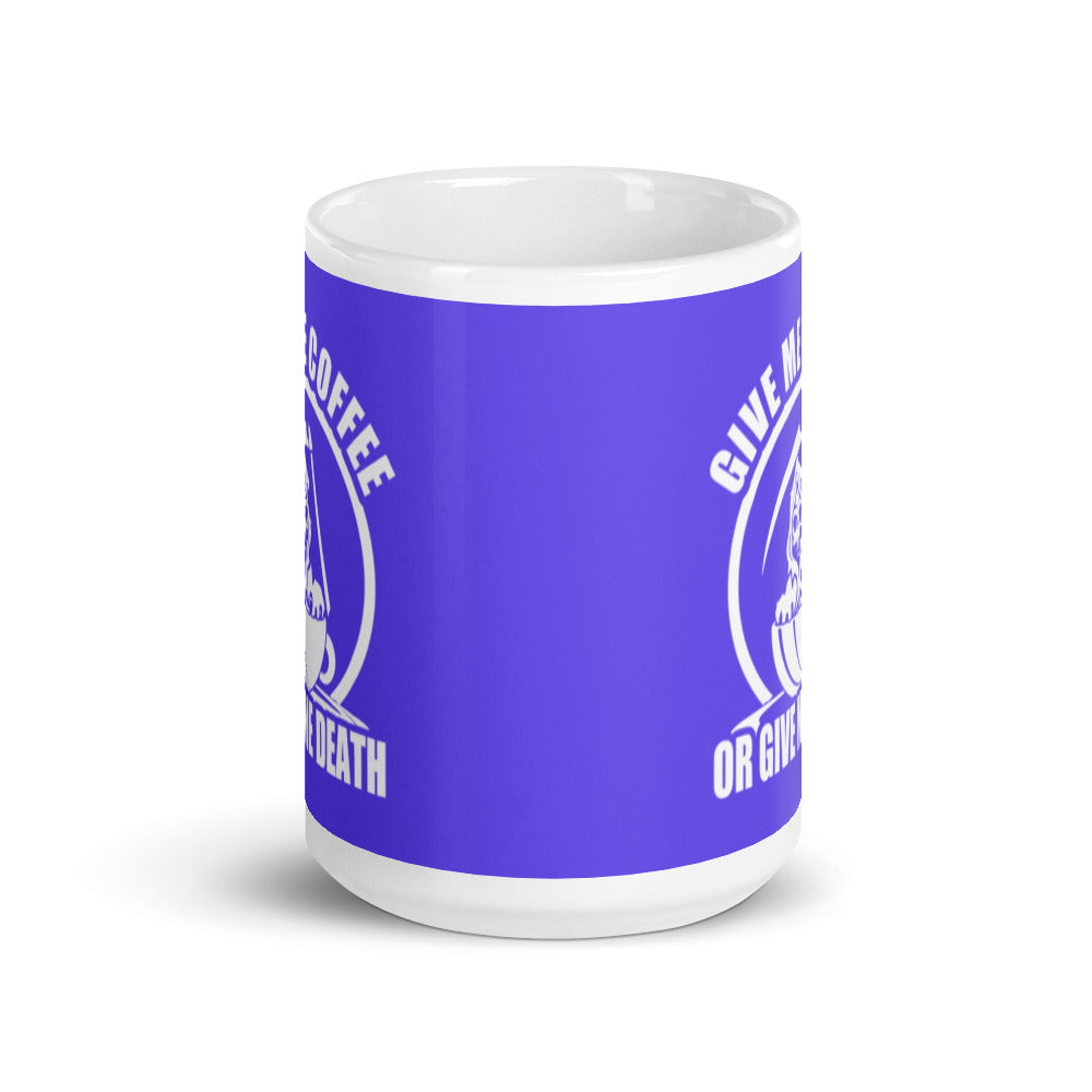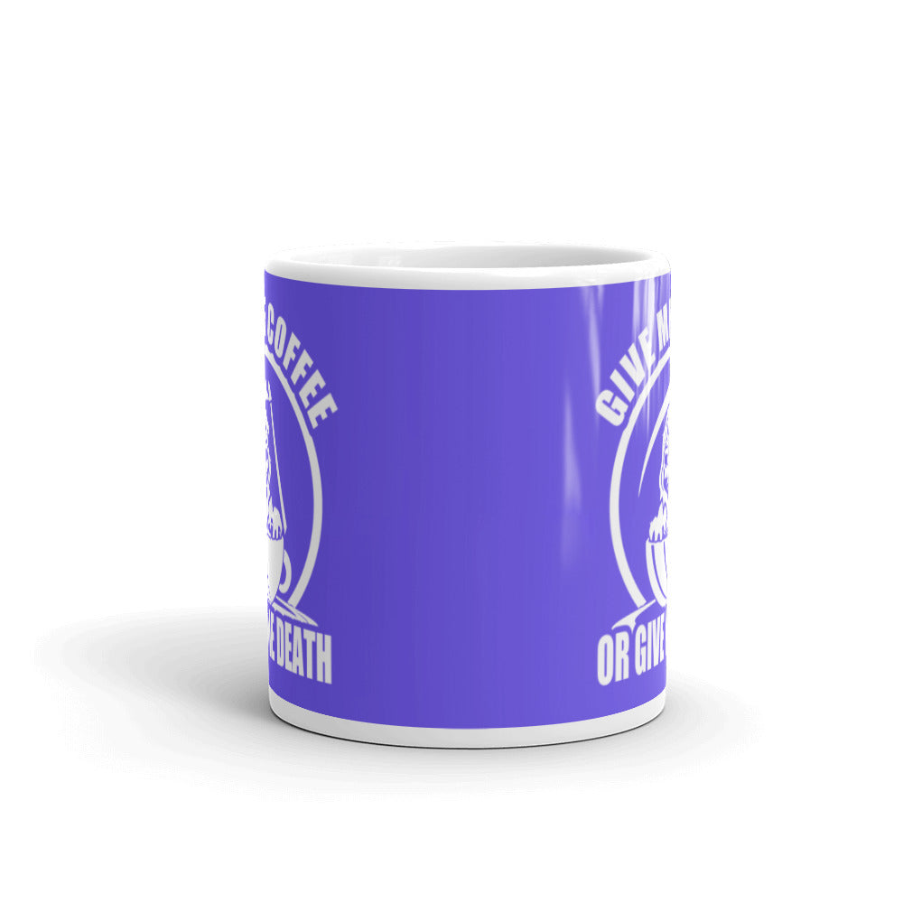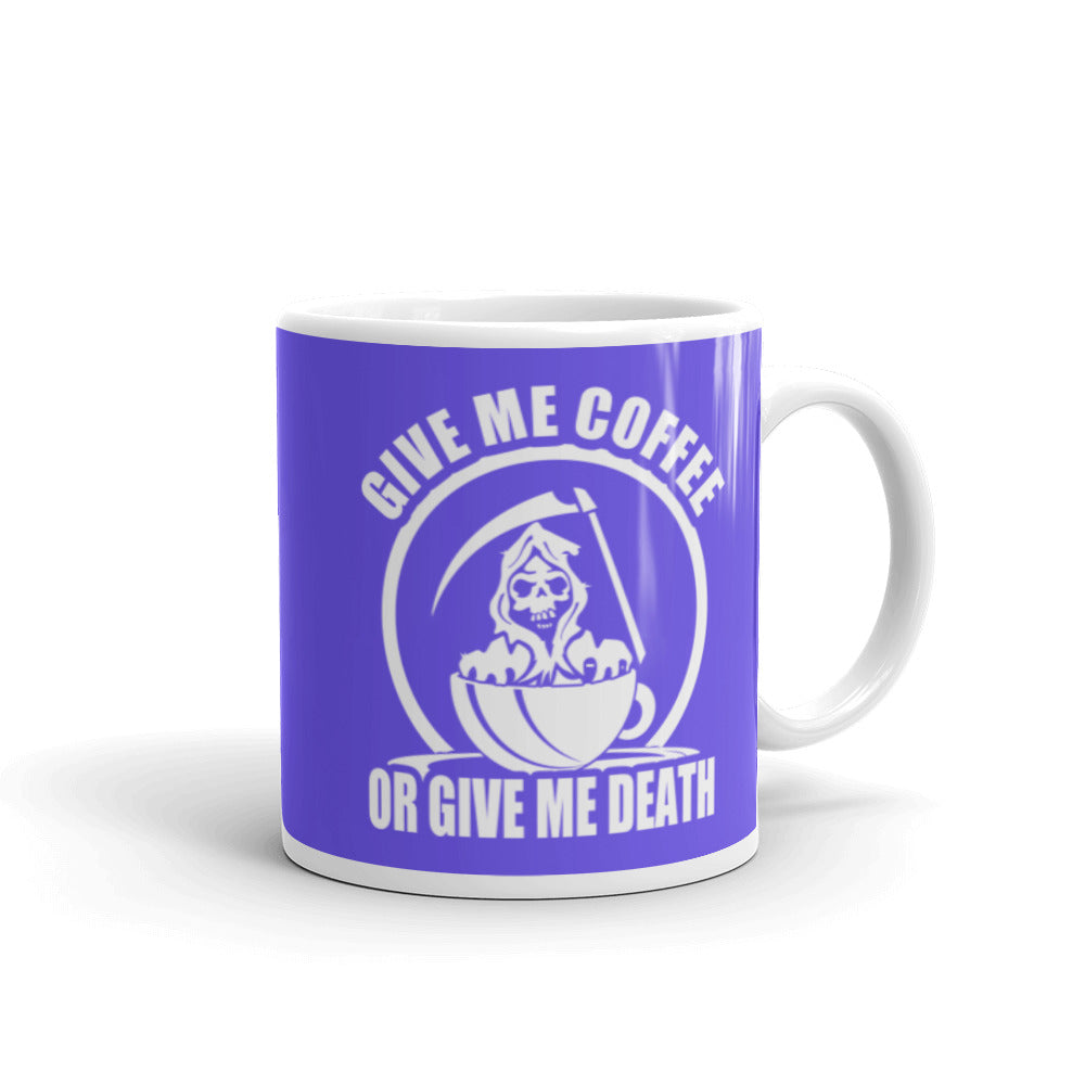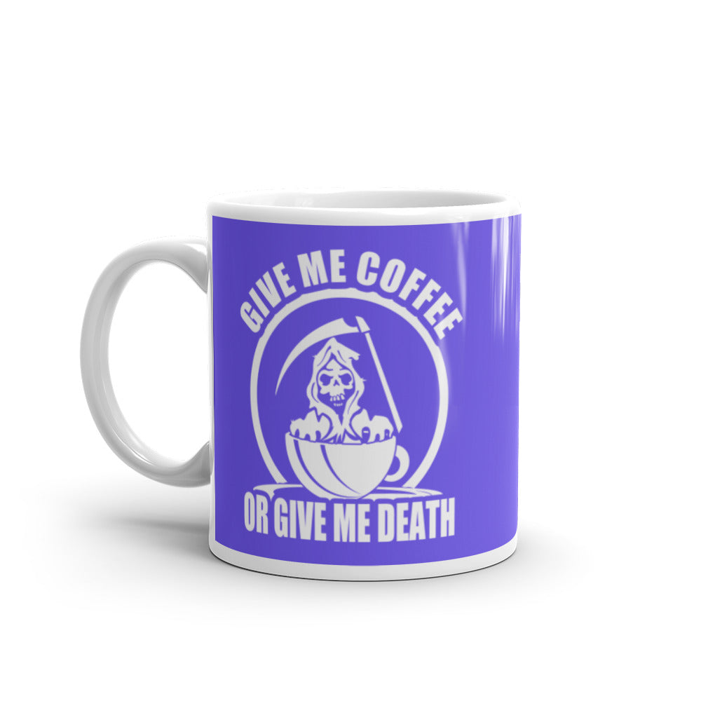 - Design: A vibrant purple background with white, bold graphic/text elements including a Grim Reaper in a coffee cup and the phrase “GIVE ME COFFEE OR GIVE ME DEATH”