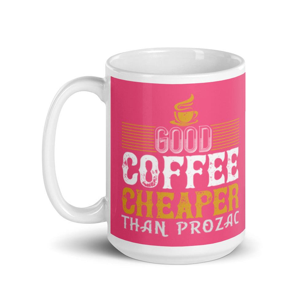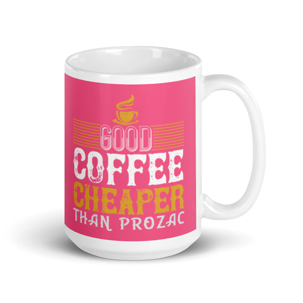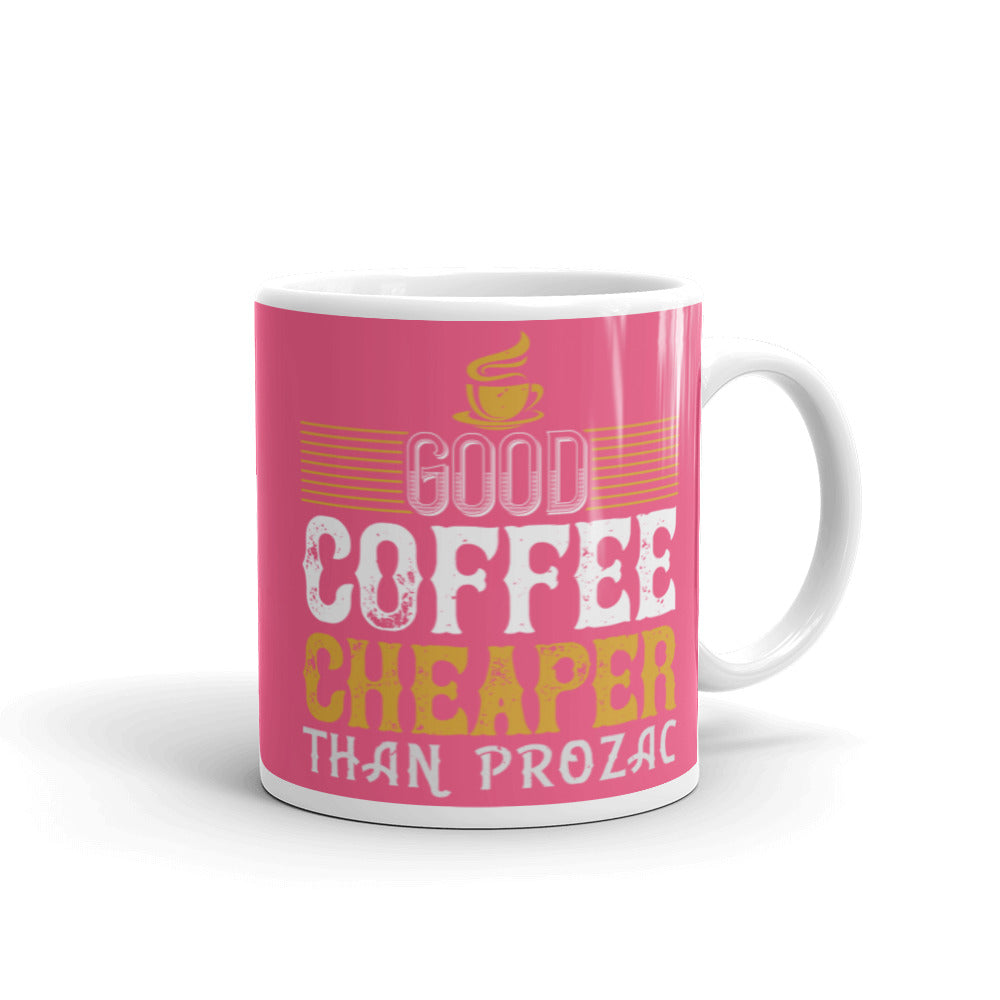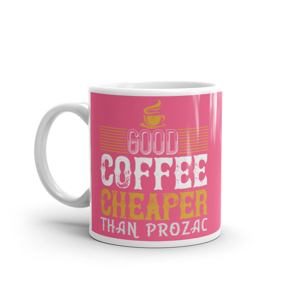 - Design: Distressed text graphics, yellow coffee cup icon, and decorative yellow stripes on a pink exterior with a white interior, handle, and rim