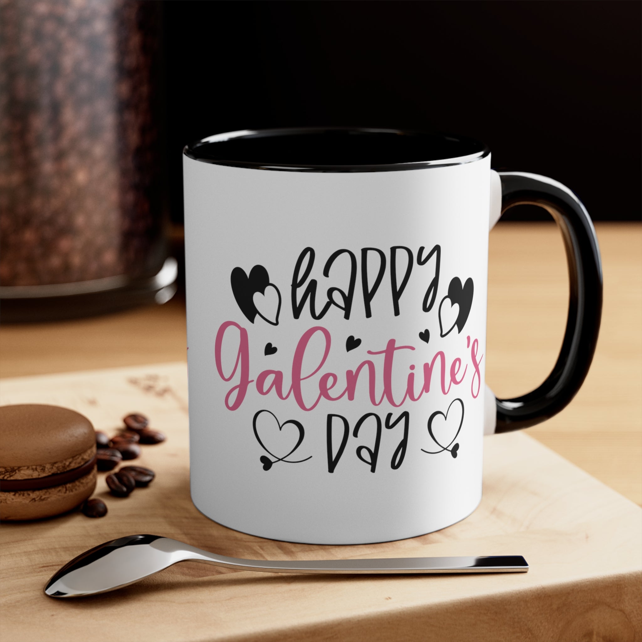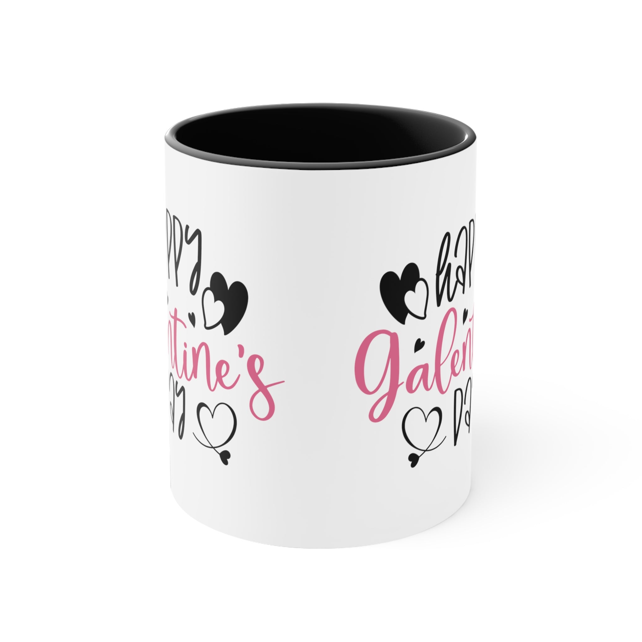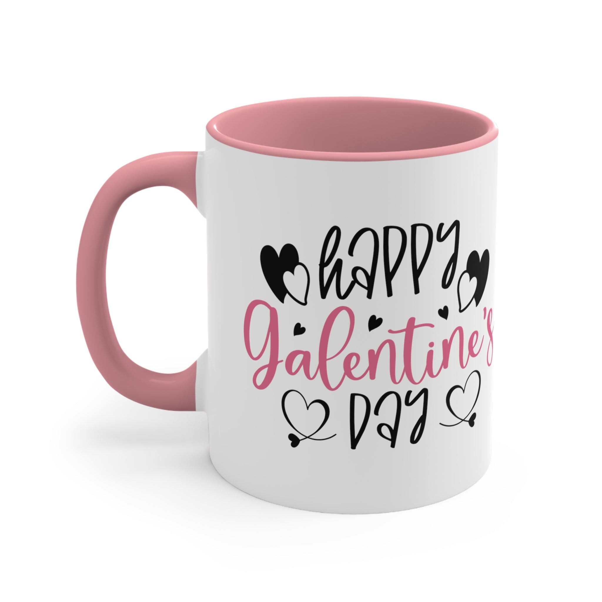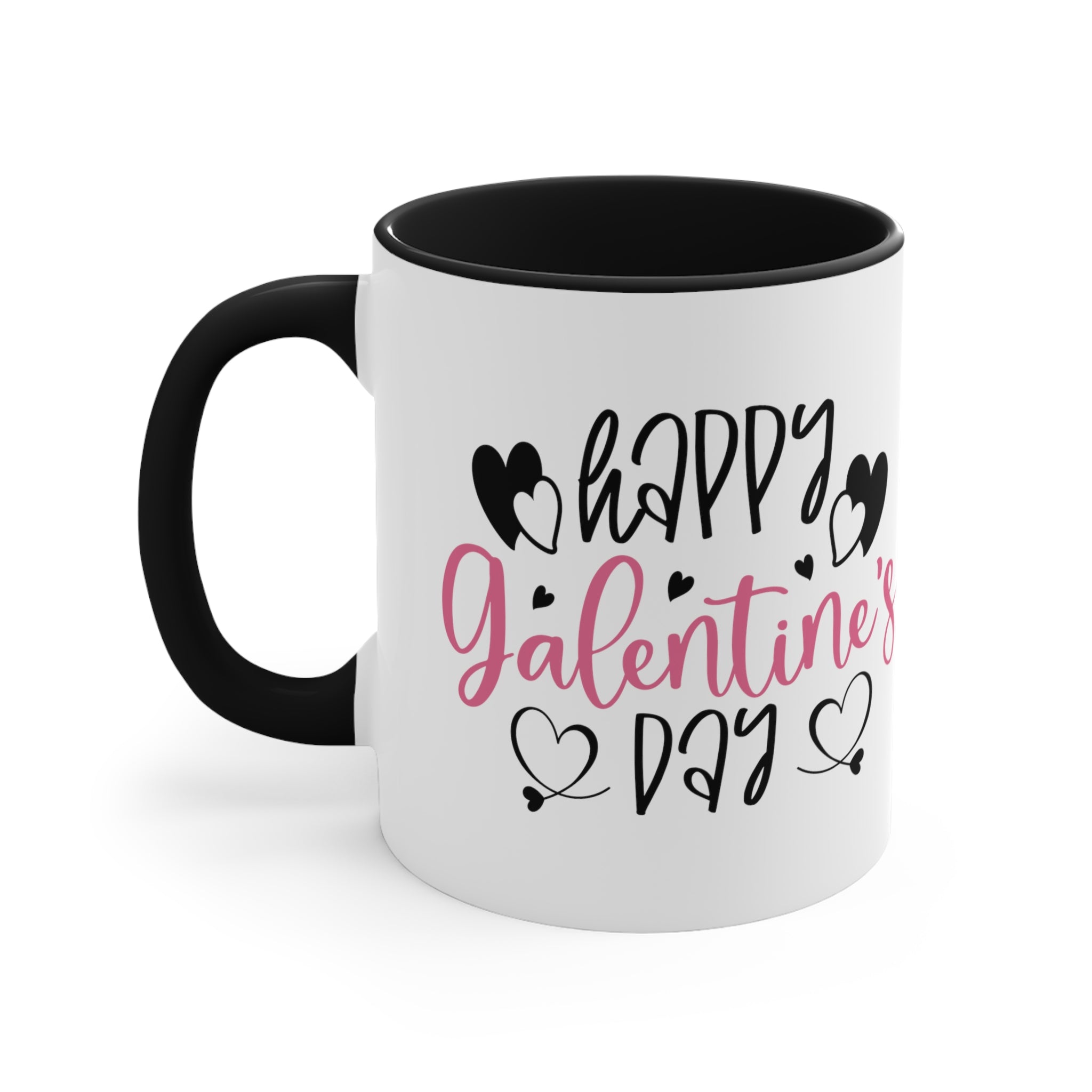 The exterior of the mug body is a classic white, while you can choose between a pink or black interior rim and handle for a striking two – tone effect. The design features the text “Happy Galentine’s Day” in a playful, cursive font. “Happy” and “Day” are in black, while “Galentine’s” is in pink, possibly with a gradient effect. Alongside the text, there are black hearts with white inner details, small black accent hearts, and decorative heart flourishes with tiny tails, all centered symmetrically on the mug.