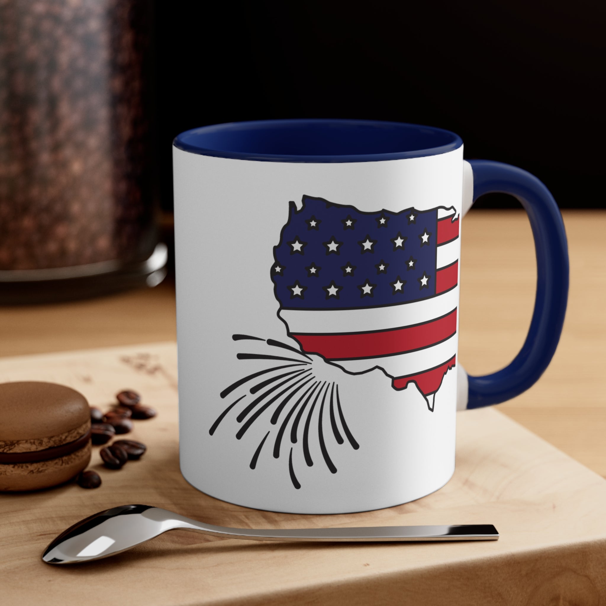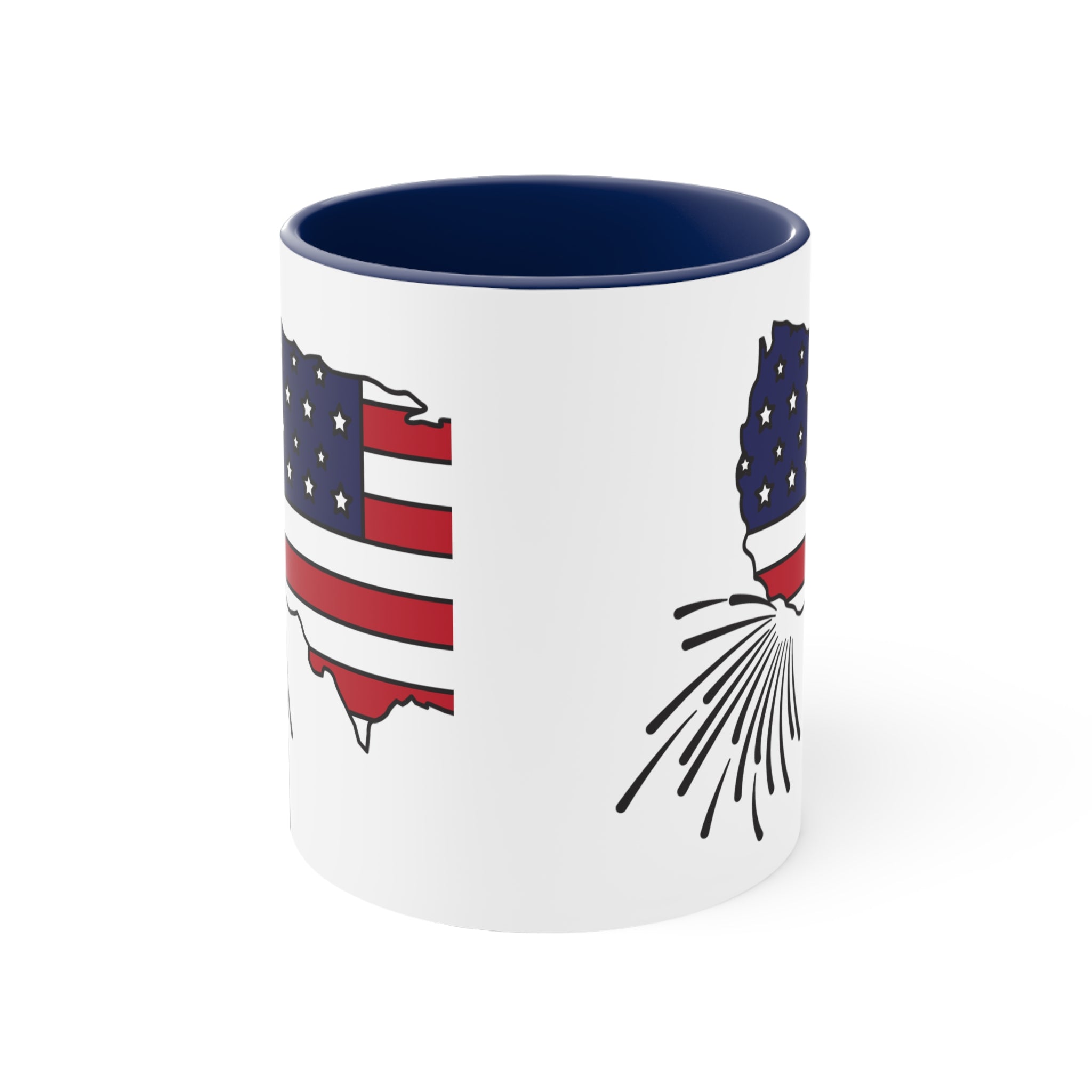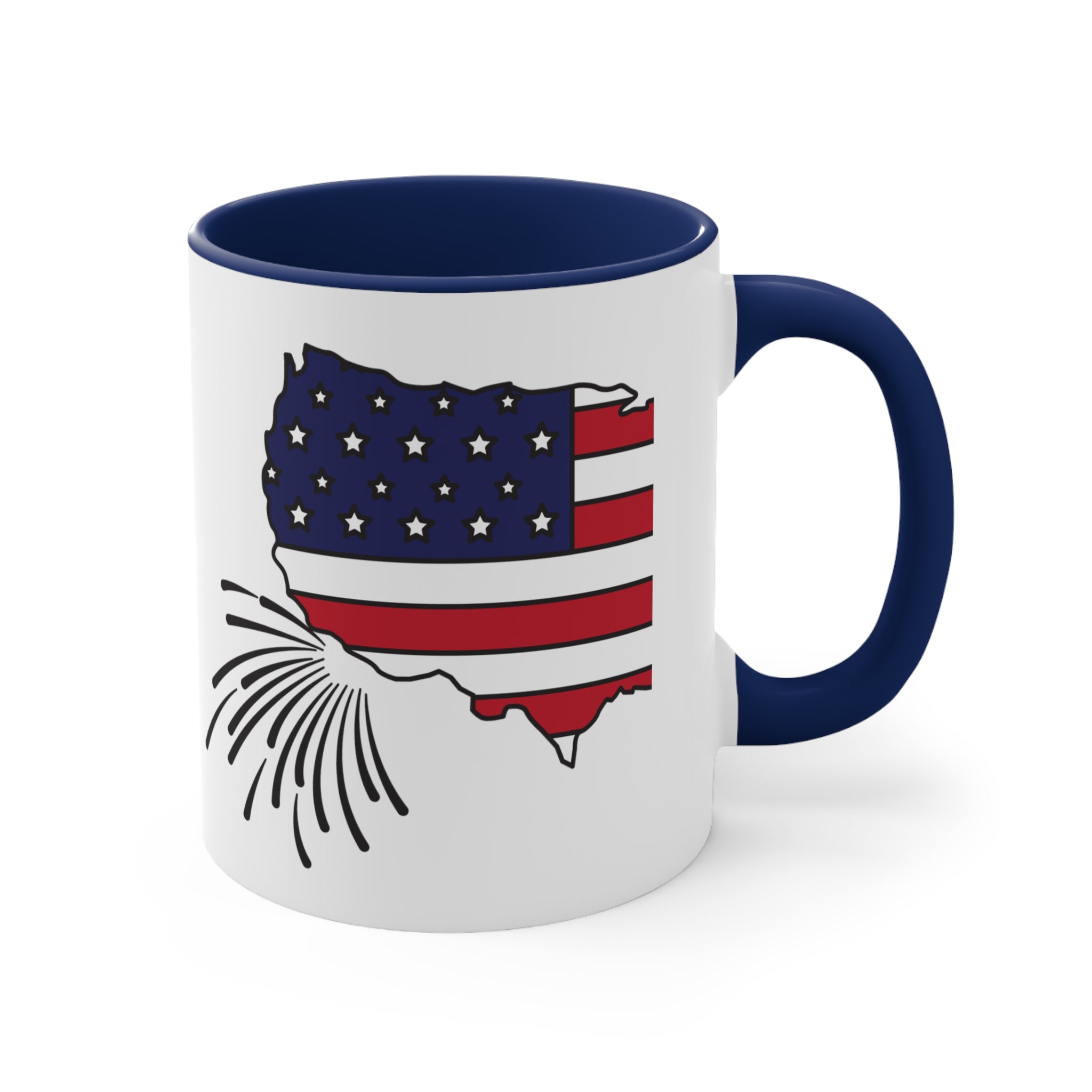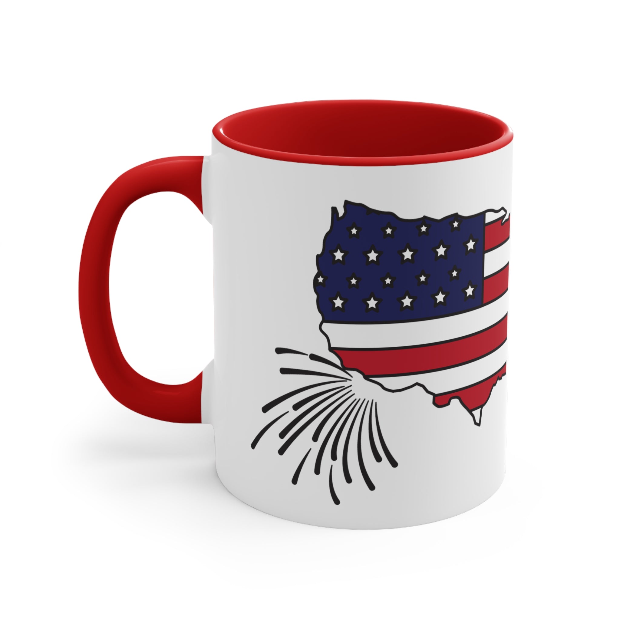 The design of the mug is truly eye – catching. It features a stylized United States map outline filled with elements of the American flag. The top – left section of the map has a blue field with white stars, and the bottom – right section is filled with red and white stripes, giving it a patriotic look. At the bottom – left of the US map, there is a firework/sparkler graphic in black lines, emphasizing a celebratory theme, perfect for 4th of July, Memorial Day, or other patriotic occasions.