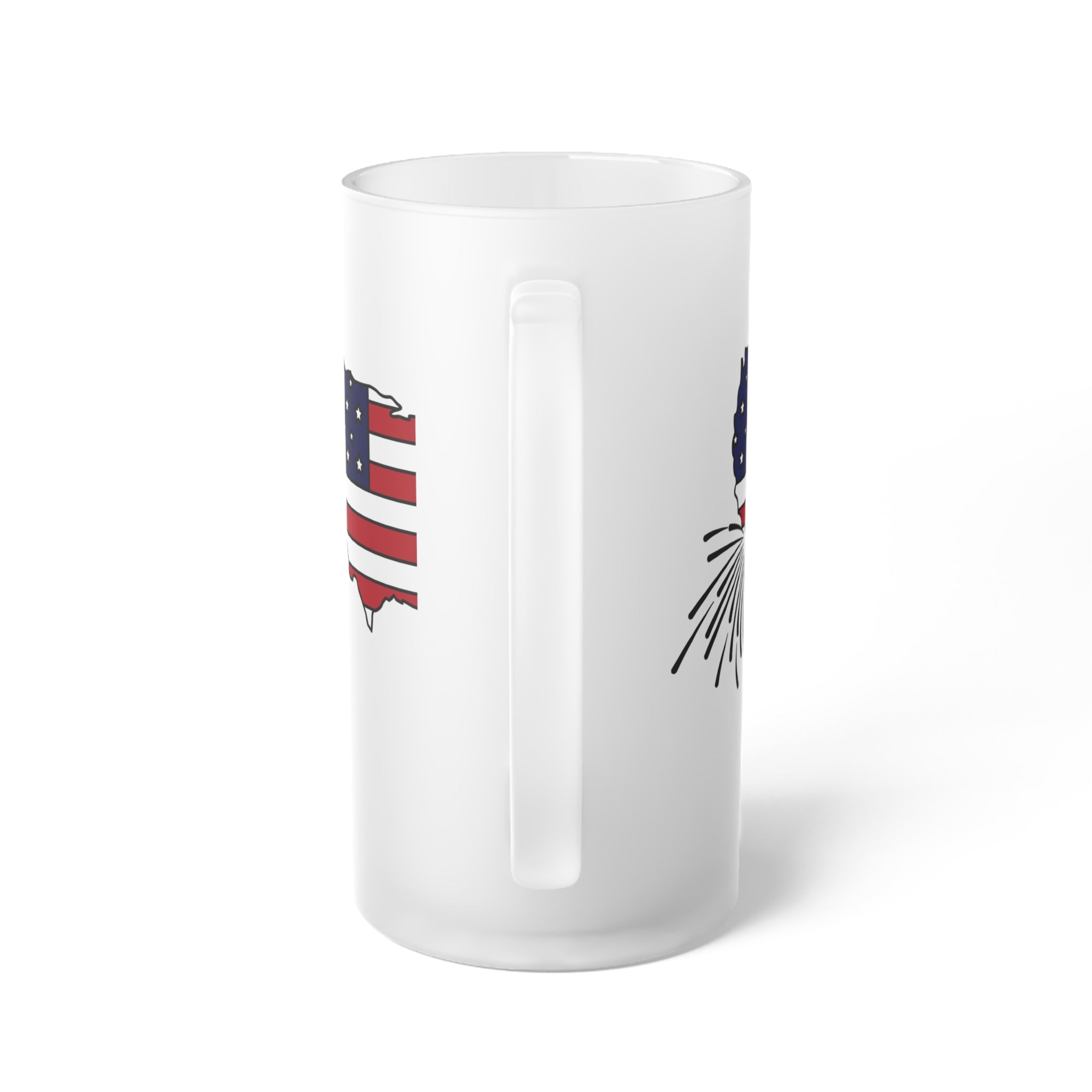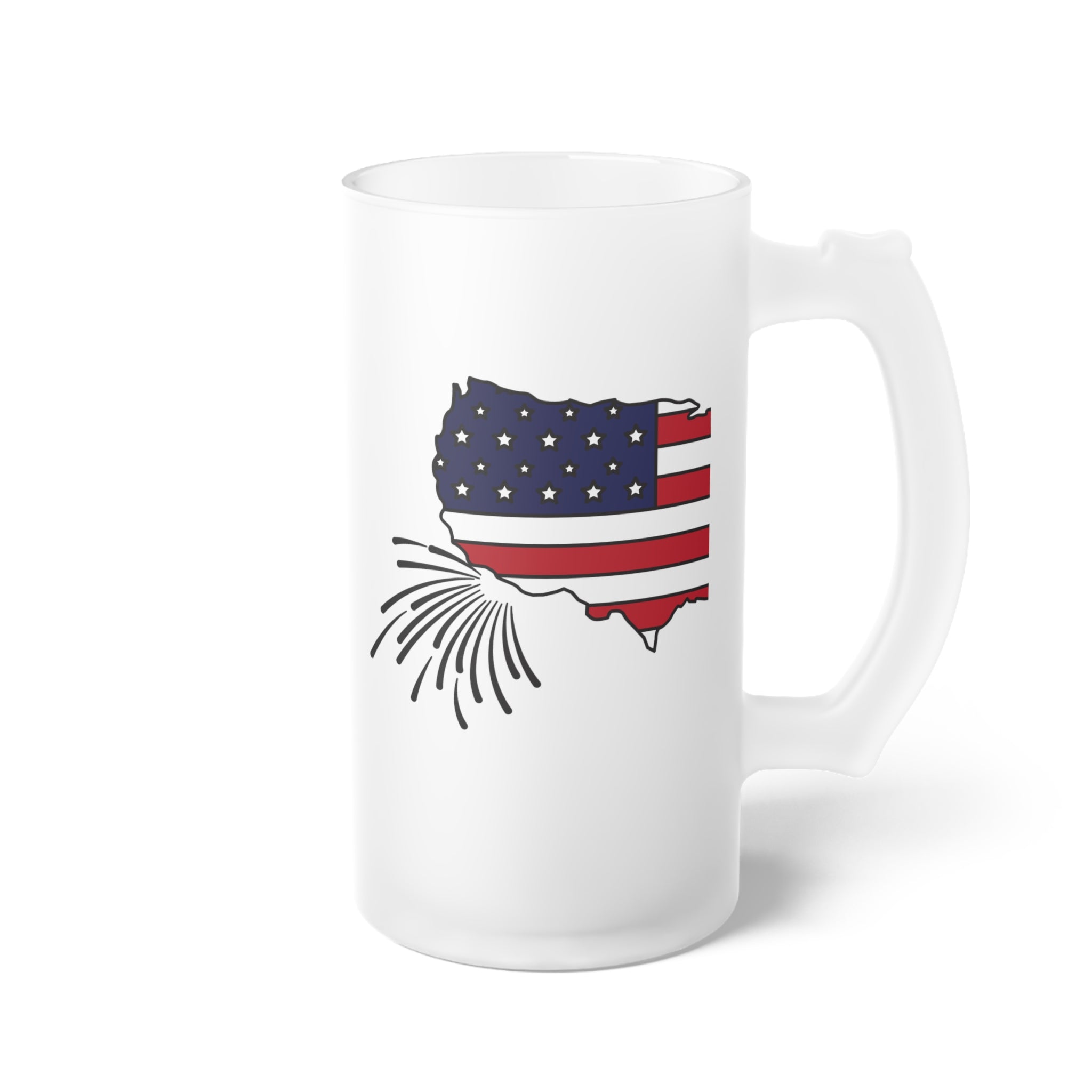 The base color of the mug is a frosted white with a matte finish, providing a smooth, opaque appearance. The design features a stylized silhouette of the United States with the American flag’s “stars and stripes” integrated into the map. The blue field with white stars is on the top – left of the map, and the red and white horizontal stripes are on the right. There’s also a fireworks graphic in black, spiky lines emanating from the lower – right of the map, which gives it a patriotic or Fourth of July theme. The design is printed on the frosted surface with crisp, detailed lines.