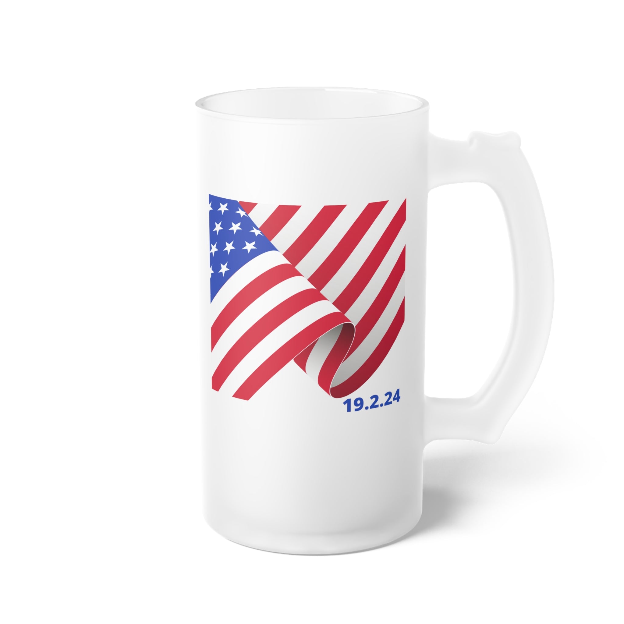 The mug showcases a patriotic design with primary colors of red, white, and blue. A stylized, 3D – effect American flag with red and white stripes and a blue field of white stars is printed on the mug. The flag appears curled/twisted, creating a dynamic and layered look. Below the flag, you’ll find the text “19.2.24” in blue, likely representing February 19, 2024, adding a personalized or commemorative touch.