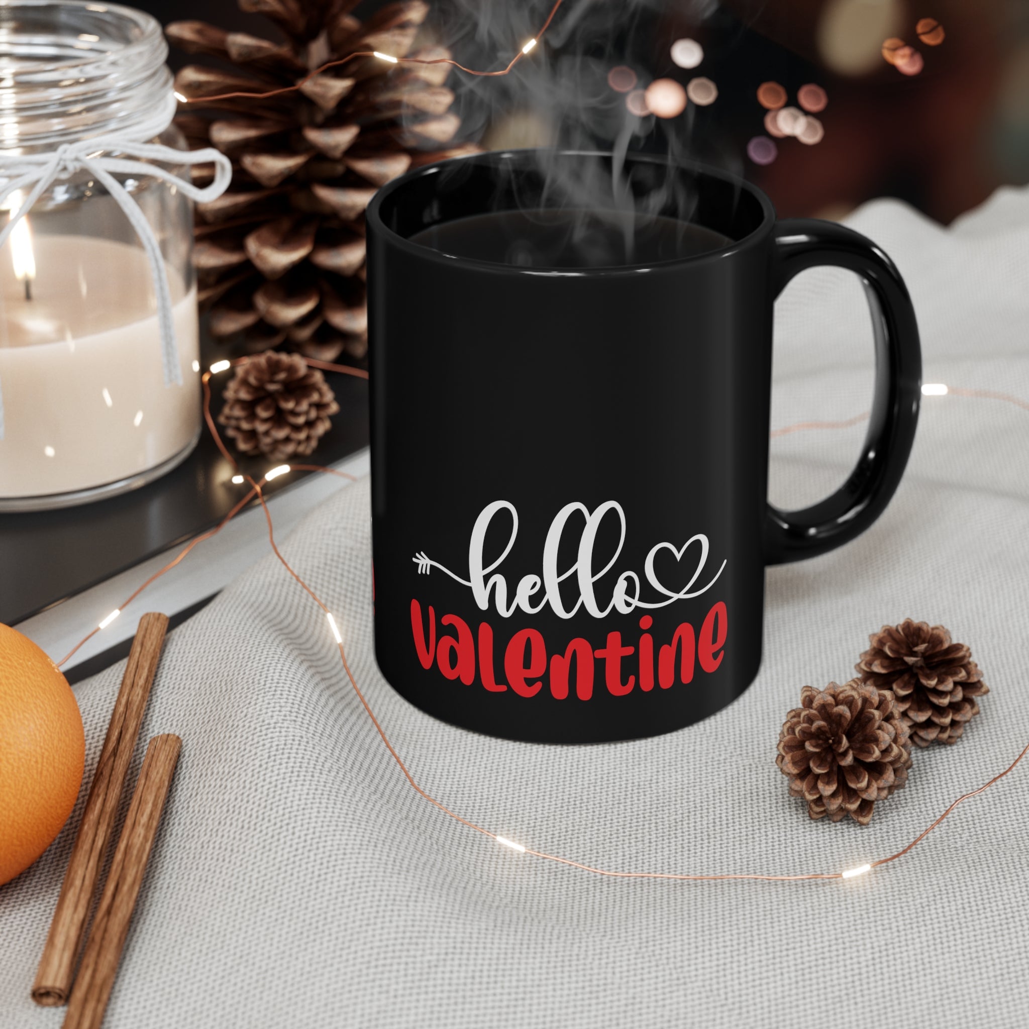 The front of the mug showcases a captivating design. The white cursive script “hello” with a heart integrated into the lettering and the red bold, playful “valentine” text create a vibrant contrast against the black background. A stylized heart and an arrow pointing toward “hello” further reinforce the Valentine’s Day theme. The design is crisp, with well – printed text and clean lines, and it is likely resistant to fading with regular use.